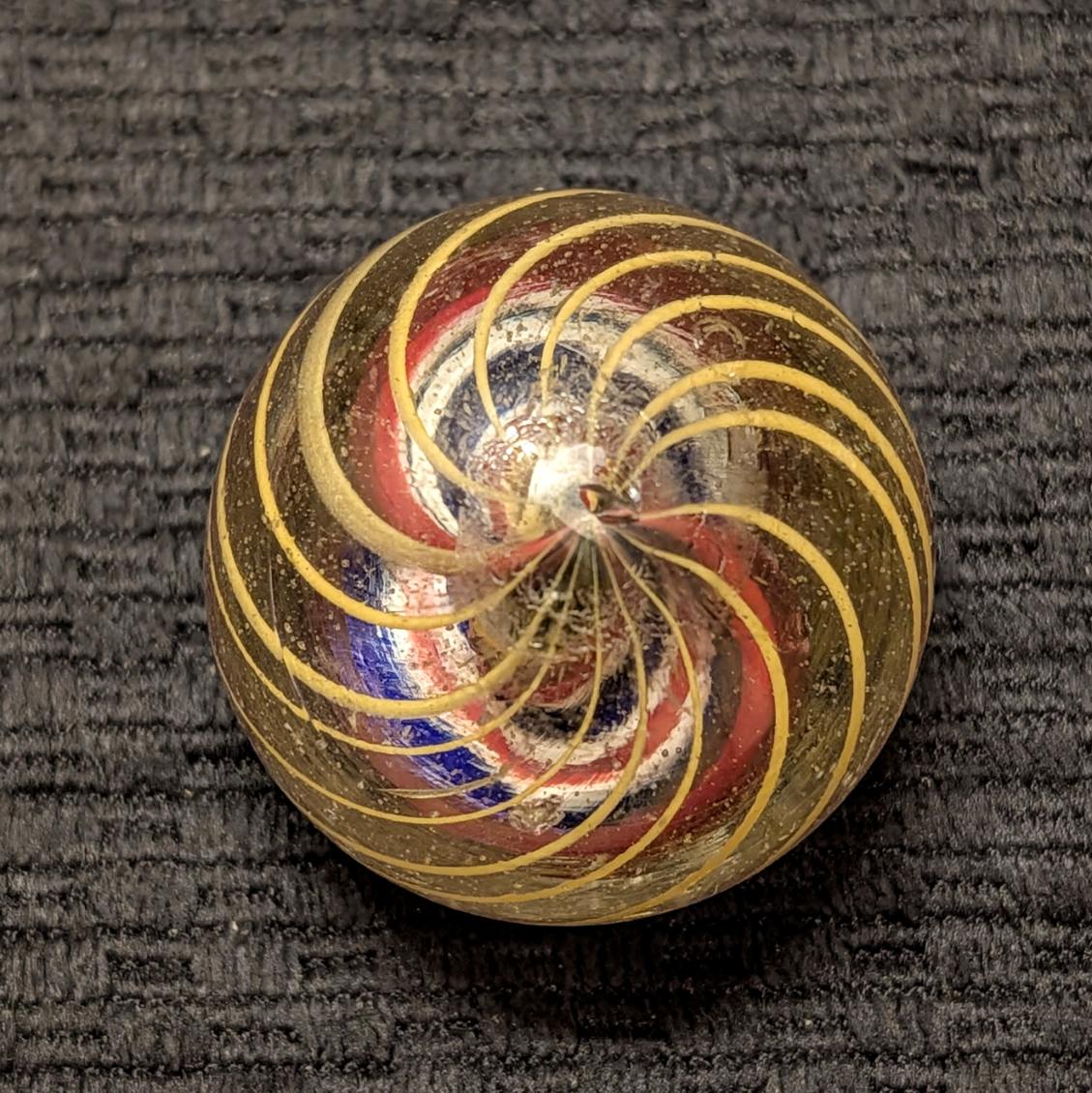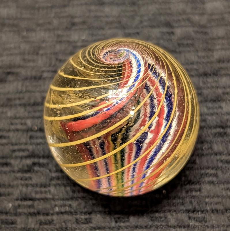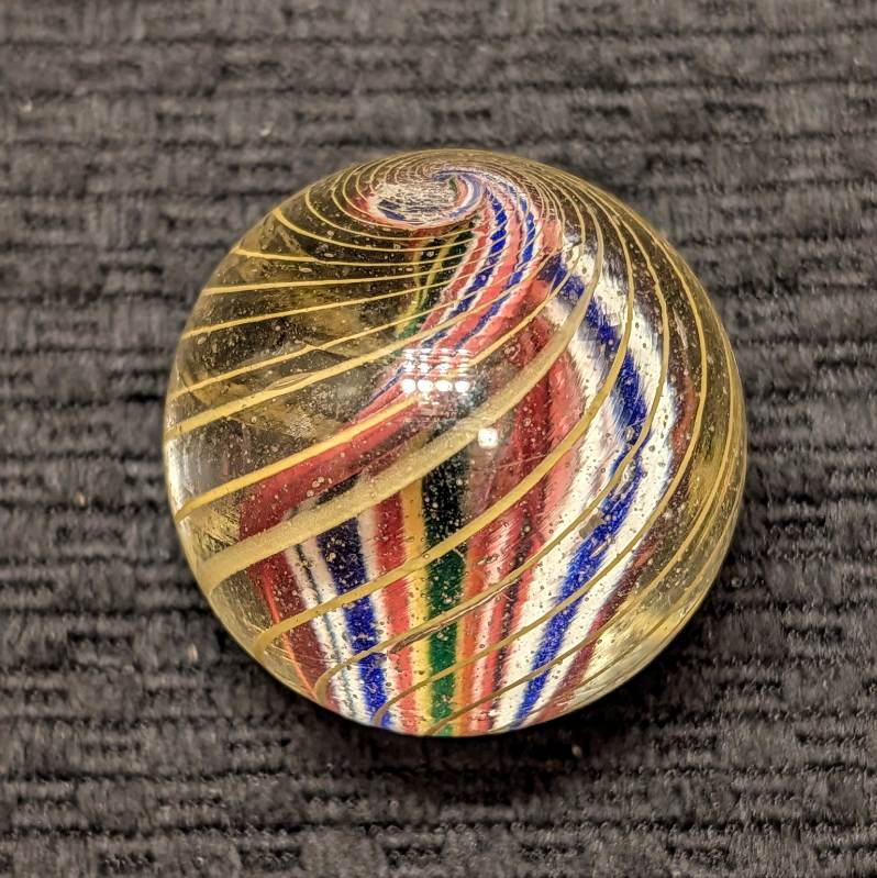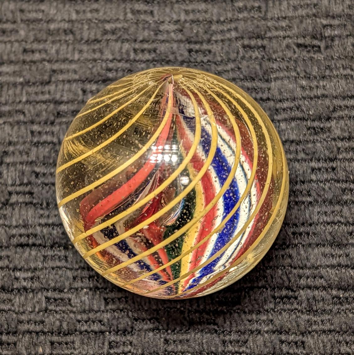 Rare Big Multicolor Striped Wide Thin Razor Ribbon w/ MICA Flake, Cage of Yellow Lines & a Nice Swirly Twist, measuring nearly 1-1/2″! It’s VERY RARE to find mica in swirls, even a single flake. A very highly sought after type and condition w/ early faceted pontil, circa 1850-1880! Wet Mint Condition. Coin not included.