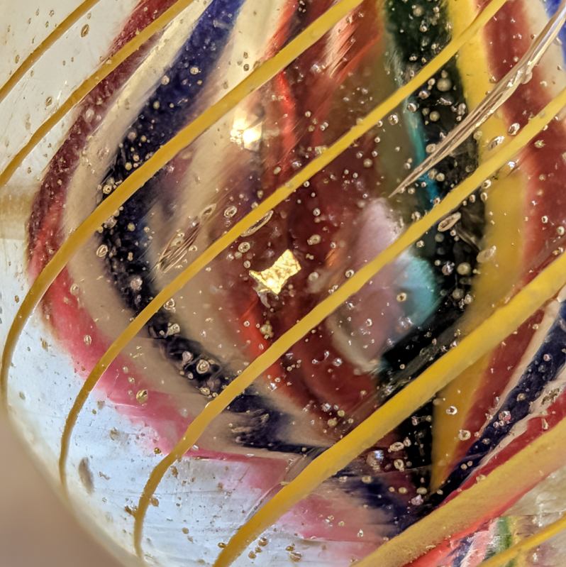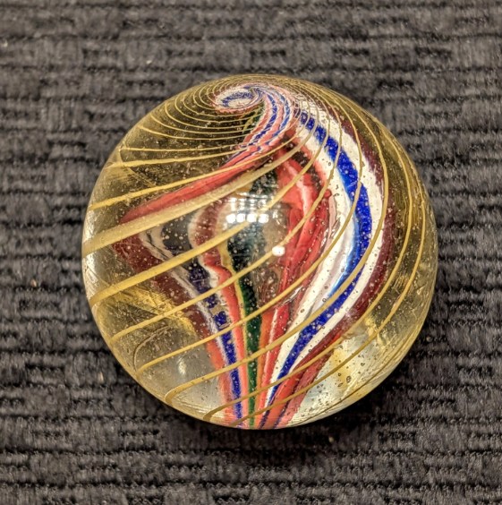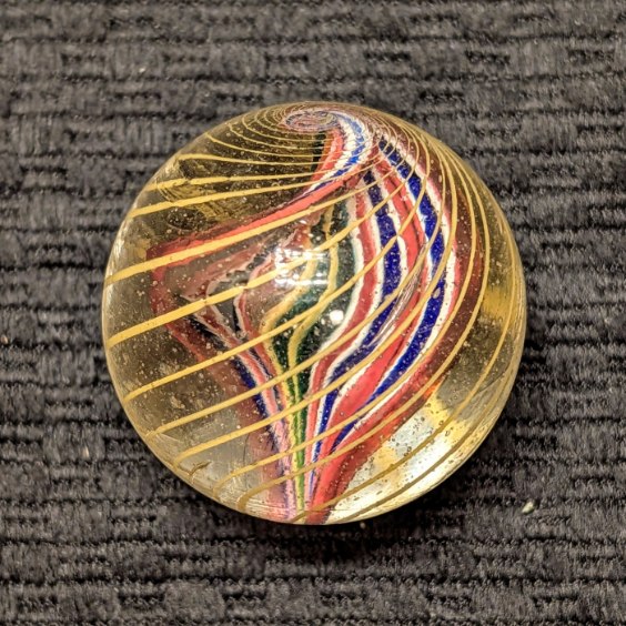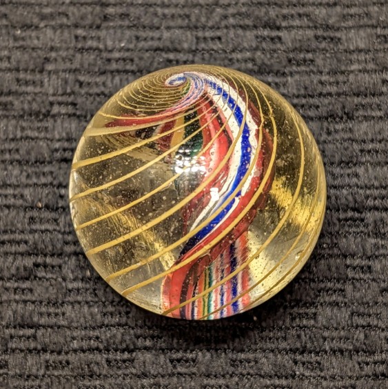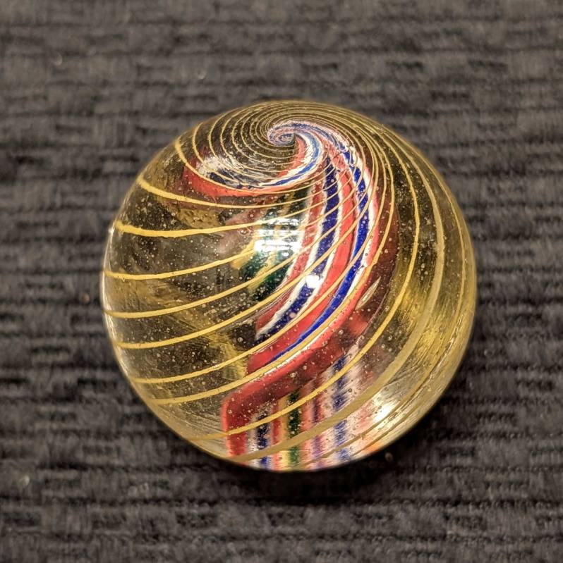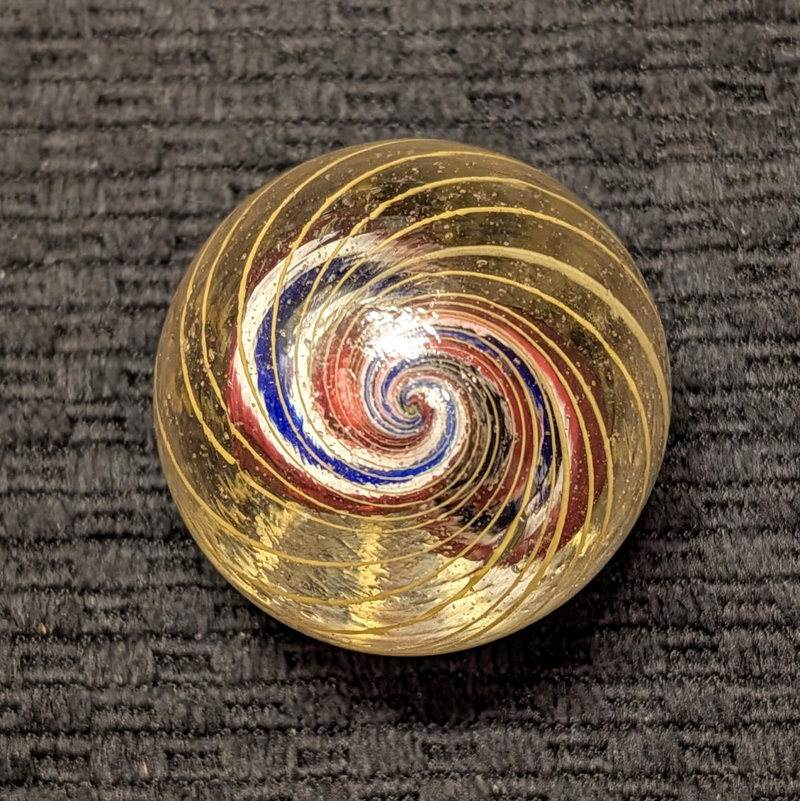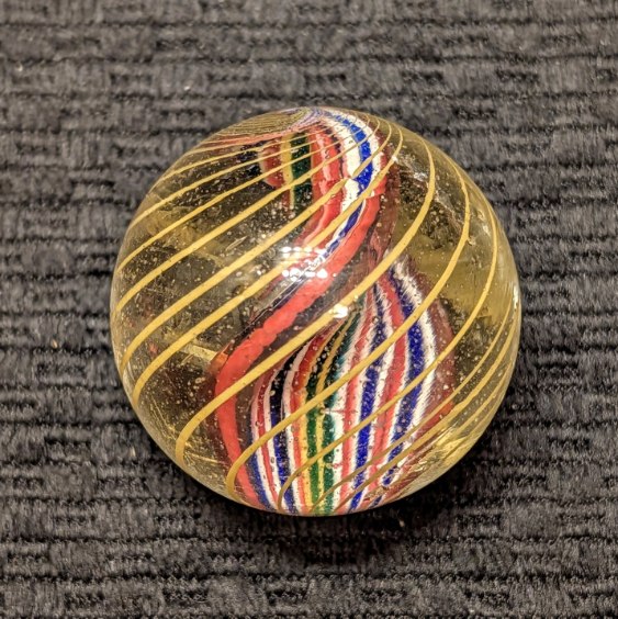 Rare Big Multicolor Striped Wide Thin Razor Ribbon w/ MICA Flake, Cage of Yellow Lines & a Nice Swirly Twist, measuring nearly 1-1/2″! It’s VERY RARE to find mica in swirls, even a single flake. A very highly sought after type and condition w/ early faceted pontil, circa 1850-1880! Wet Mint Condition. Coin not included.