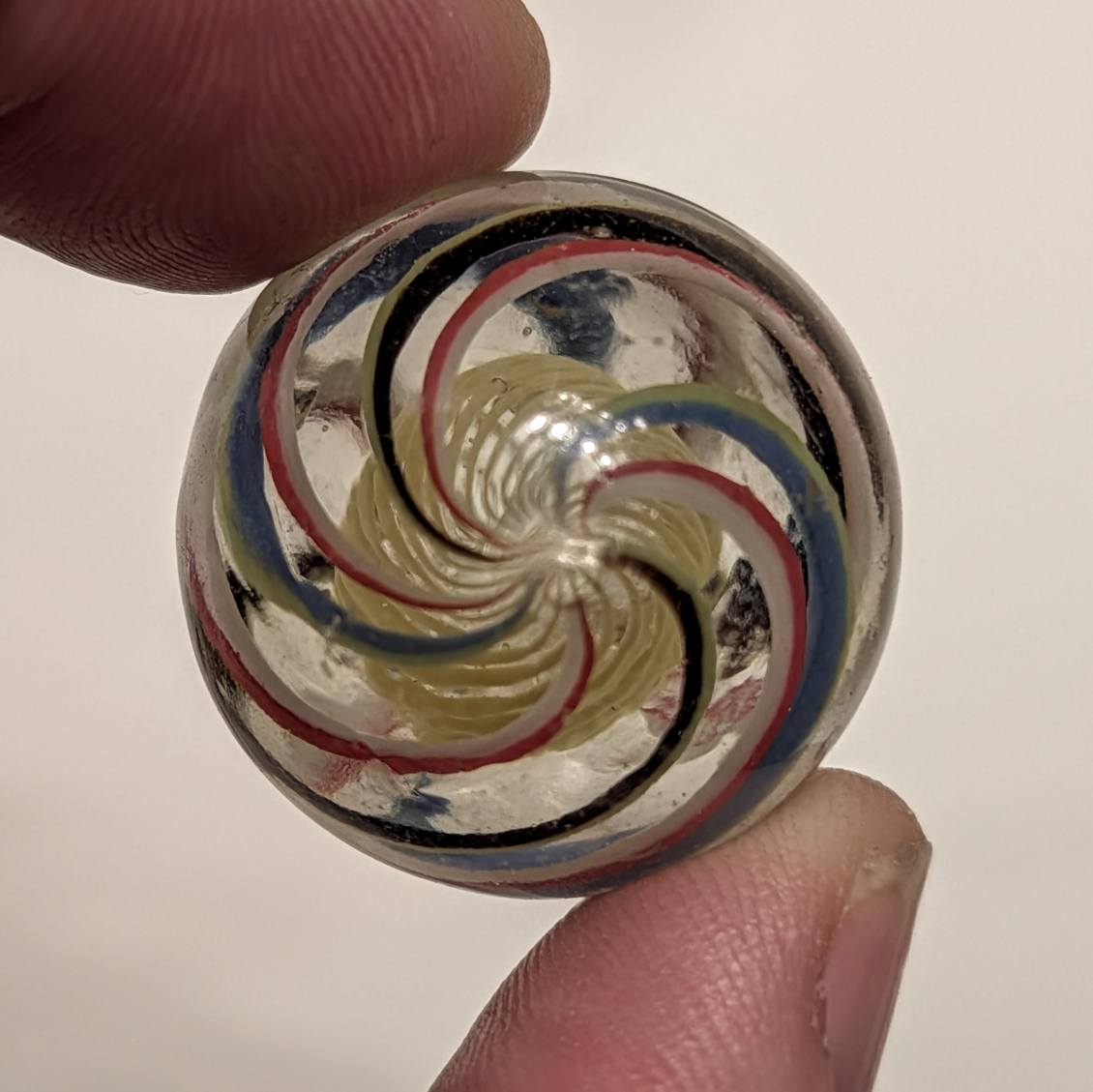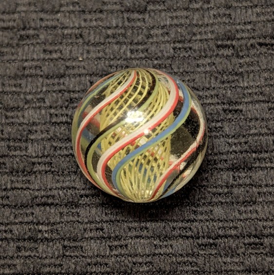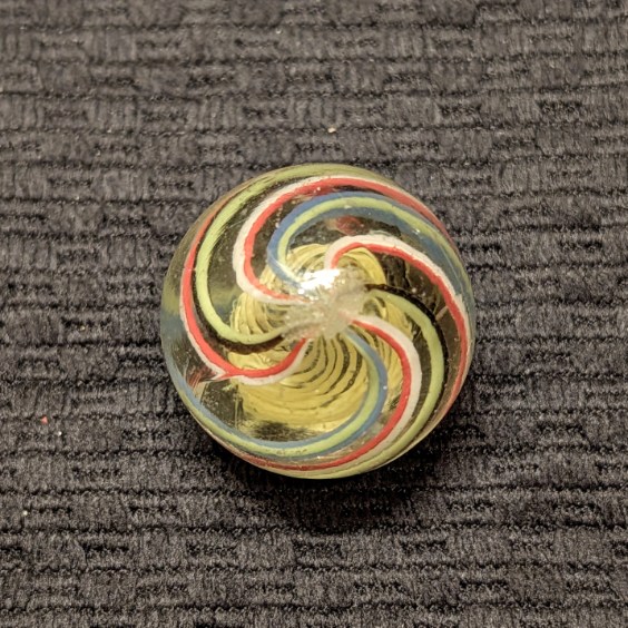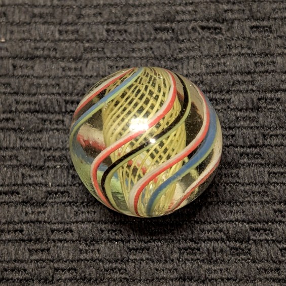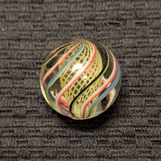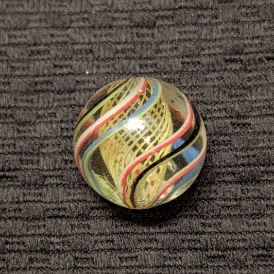 1-1/8″ Well Made Yellow latticino Swirl w/ 8 English Style Bi-Color Ribbons including 8 Orange/White, 2 Blue/Green and 2 Rare BLACK/Green Ribbons. Wet Mint.