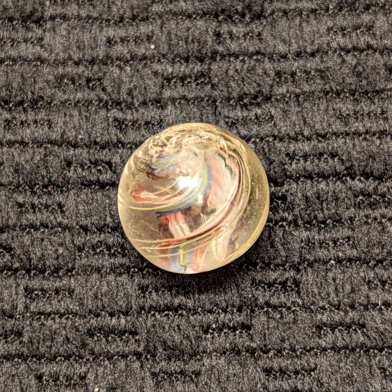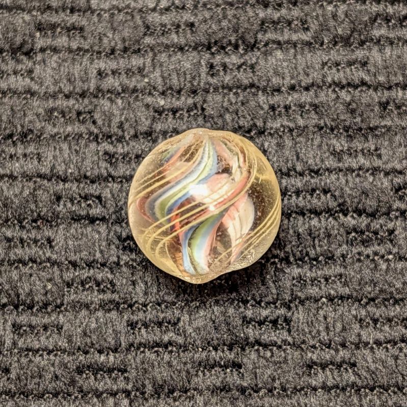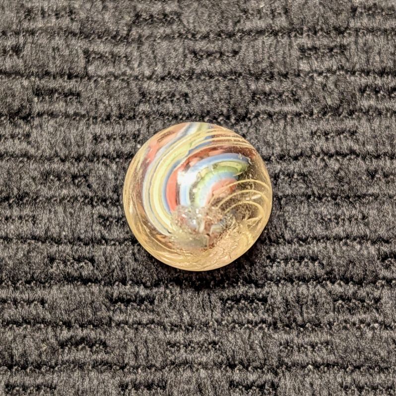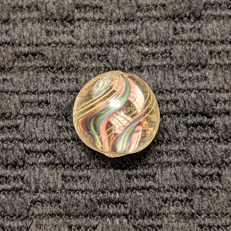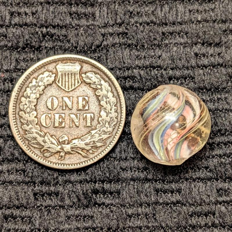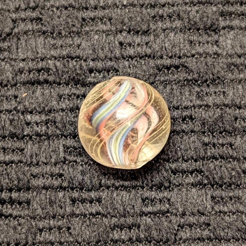 1/2″ Peewee 3-Ribbon Divided Core Swirl with Identical Stylized Ribbons of Blue & Green Stripes over White Bordered by Transparent Jelly Pink! 3 groups of 3 yellow outer threads. Incredible workmanship in this little guy. Coin not included, it’s to show the tiny size of this marble. Mint Condition.