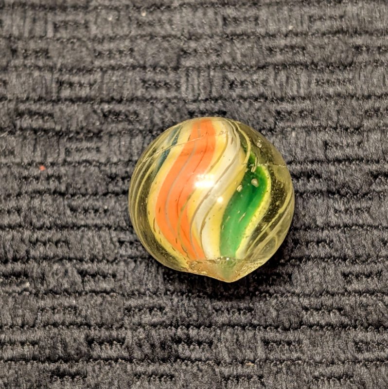 Unusual & Interesting Fat & Slightly Lobed Solid Core Swirl w/ 2 wide Orange & Yellow Ribbons, 1 Blue & Yellow Ribbon, and 1 Green & Yellow Ribbon\s over a White base. There are 4 groups of triple Yellow outer threads. Mint condition.