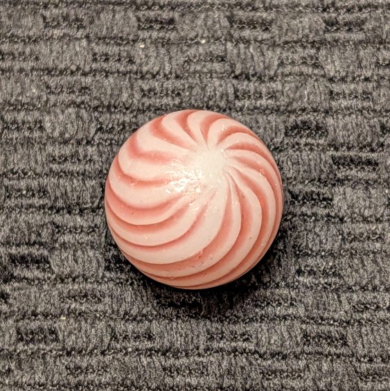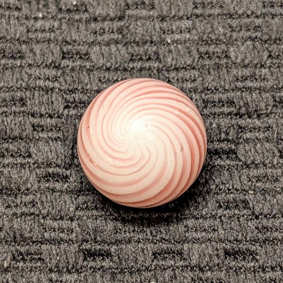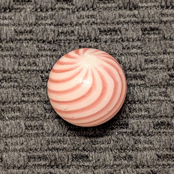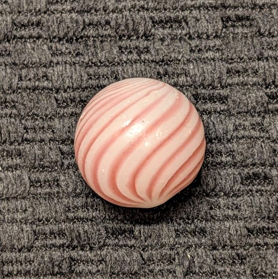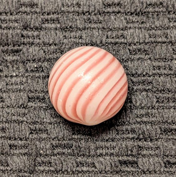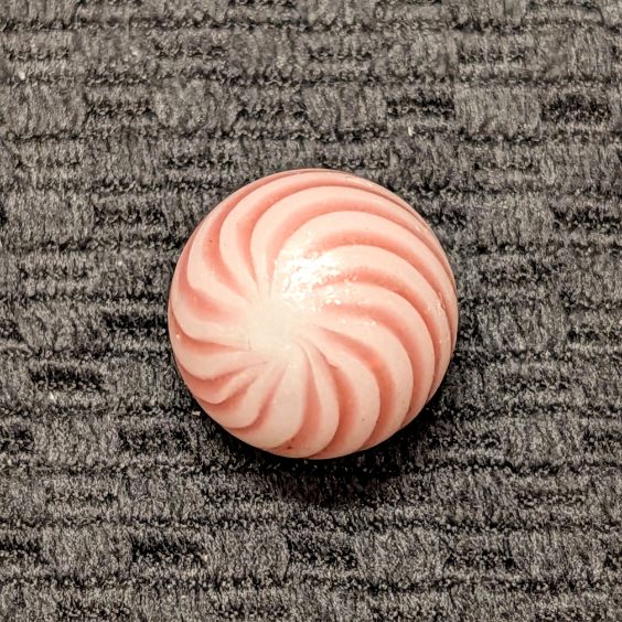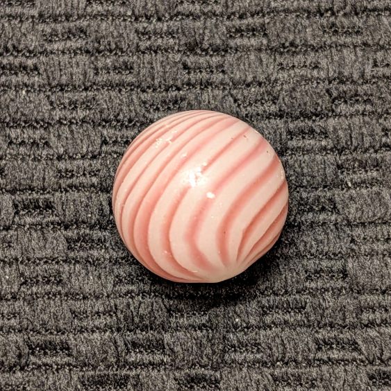 Over 11/16″ Clambroth w/ 14 Red Lines – which is a little bigger than most. Symmetrical spacing and complete coverage. It’s hard to find one this nice with an undamaged Mint surface in these soft-glass surface band types.