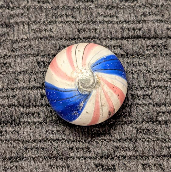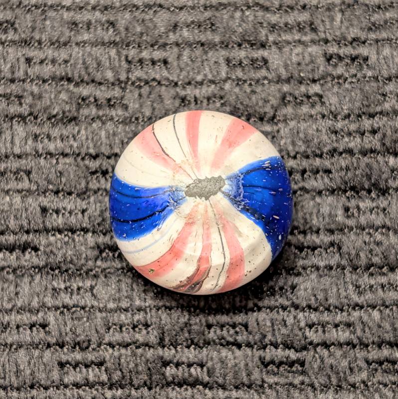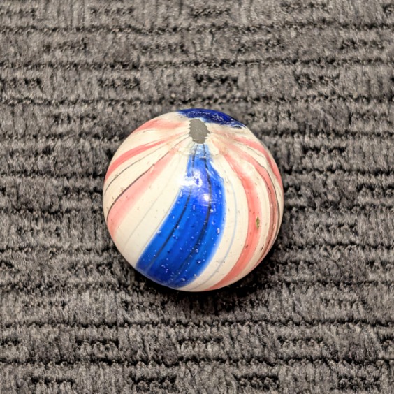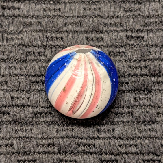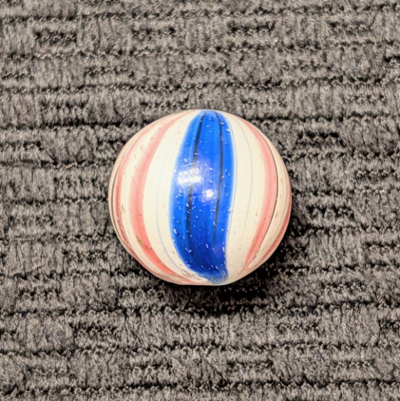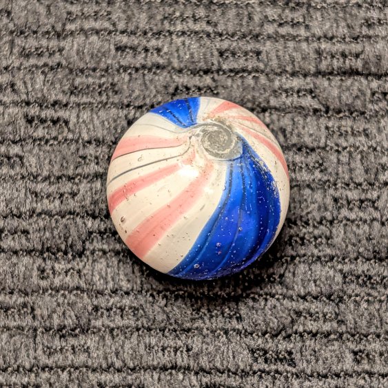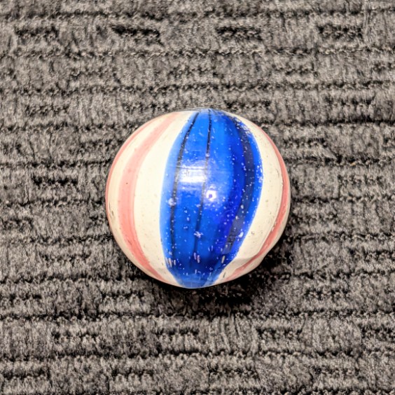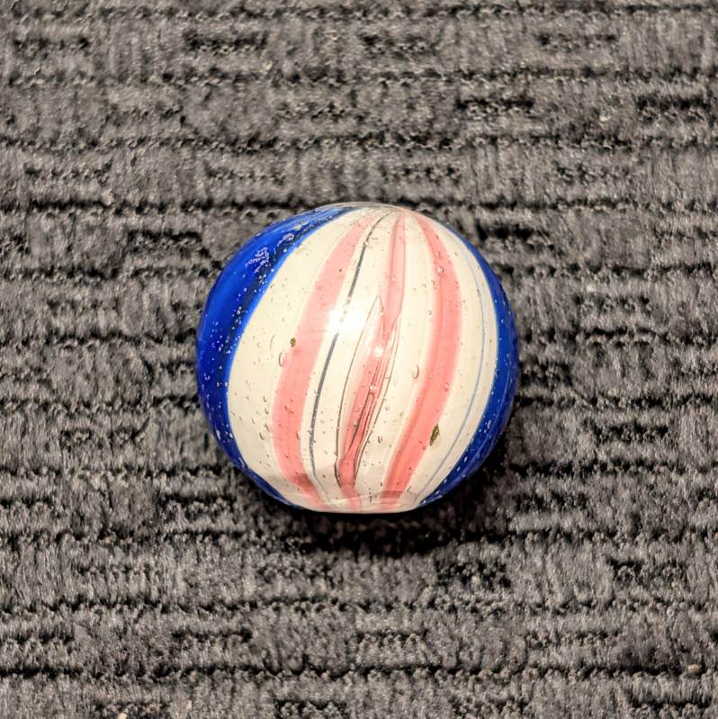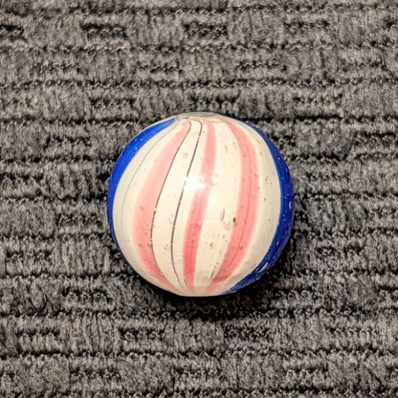 11/16″ Peppermint Swirl w/ Wide Bold Blue & 3 Red Stripes. Thought to be constructed around 1876 to commemorate the US Centennial. This was likely first mass produced type and is when German glass marble markers transitioned from faceted finished pontils to leaving them rough in order to speed up production. Attractive and Mint Condition.