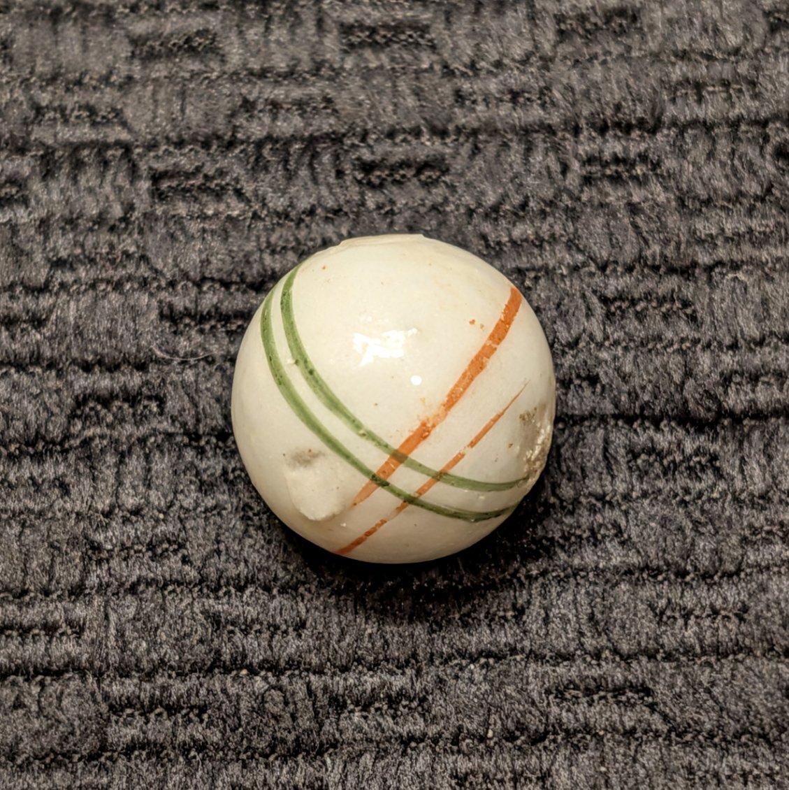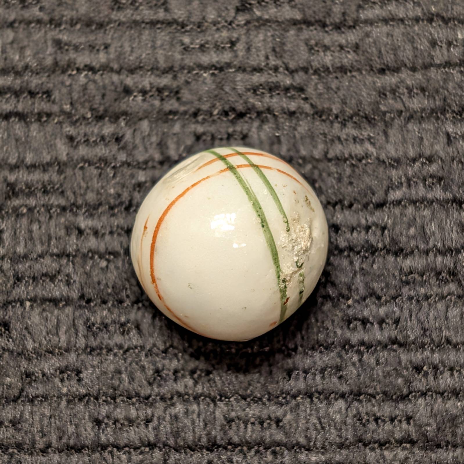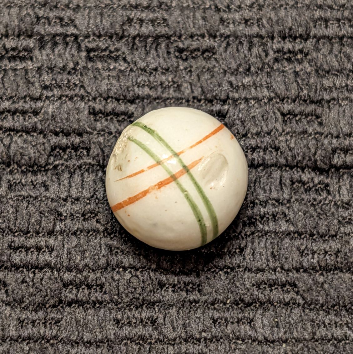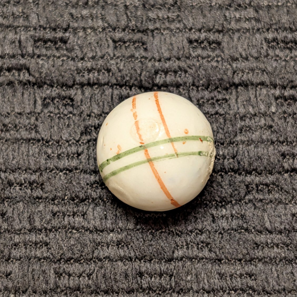 Glazed China w/ 2 Pairs of Criss Crossing Lines, one set of red and one set of green lines. This is a mid-period marble due to the individually painted lines (not the usual spirals), circa 1875-1895. Wet mint with Strong color.