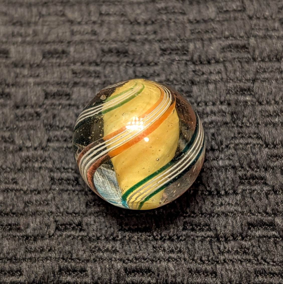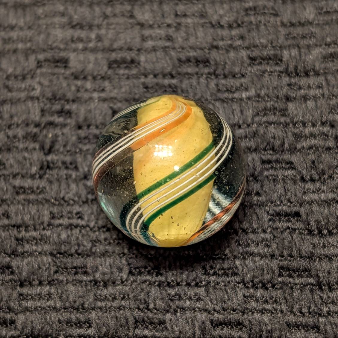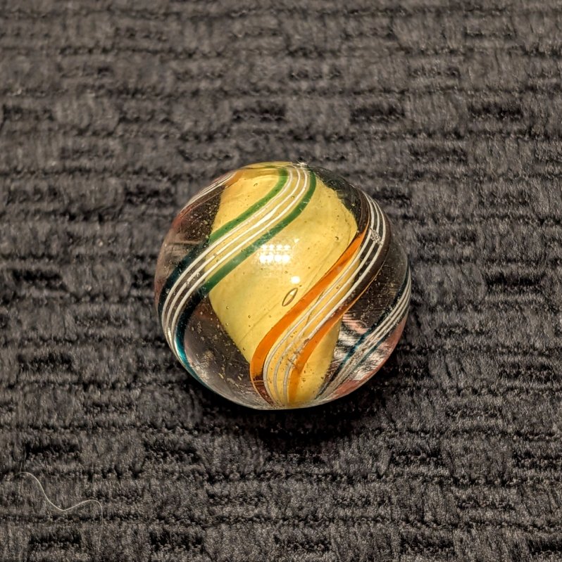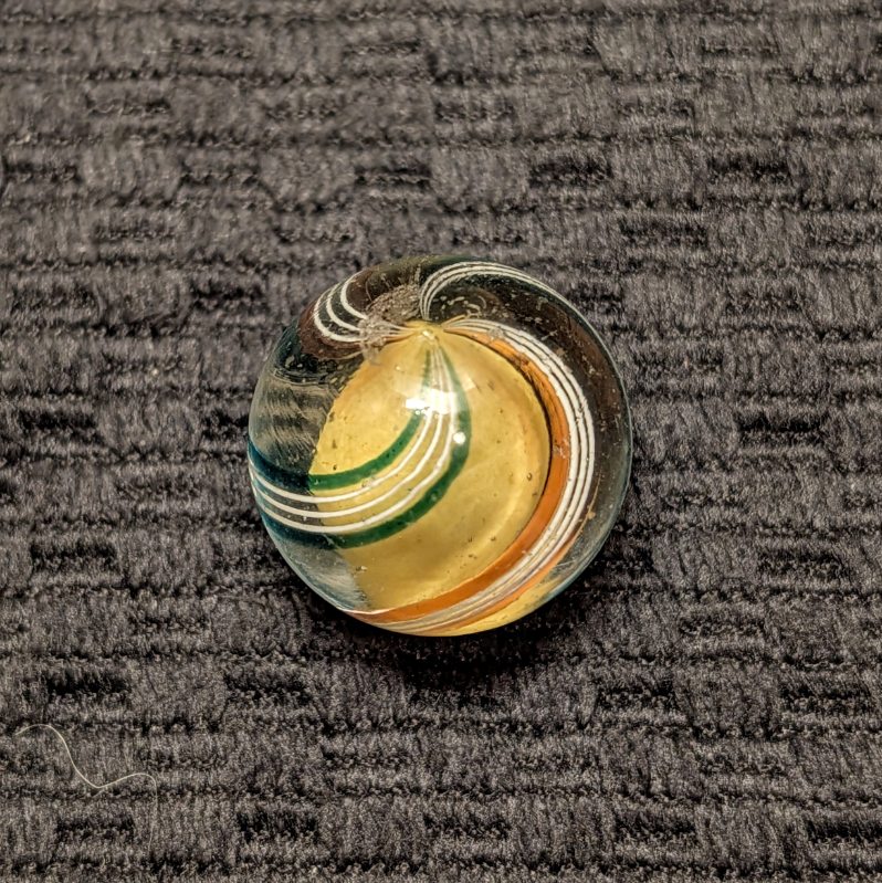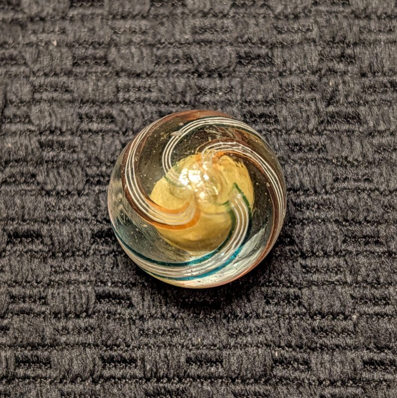 Shooter 25/32″+ Yellow Solid Core w/ 4 stylized Outer Lines trimmed in Transparent Red or Teal Green Ribbons. Very attractive & Unique demonstrating the artistry of early period exquisite craftsmen. Early faceted pontil, circa 1850-1880. Mint.
