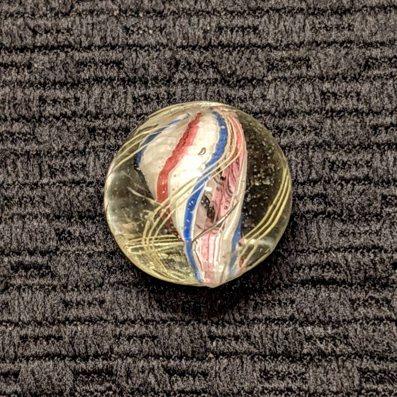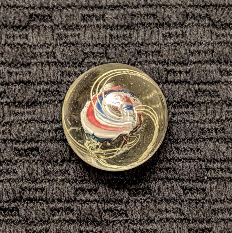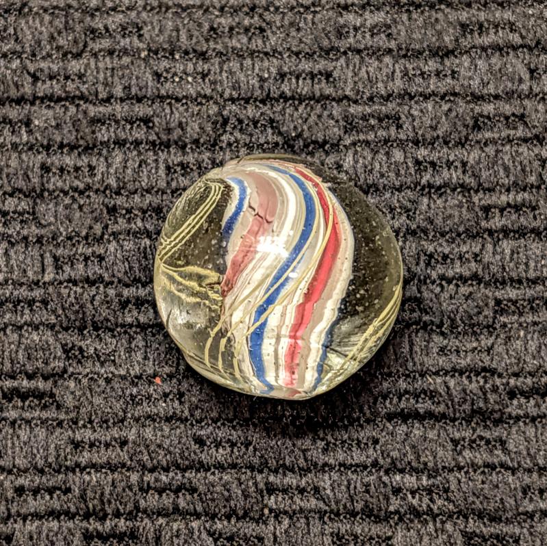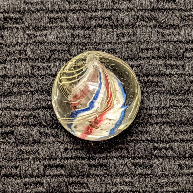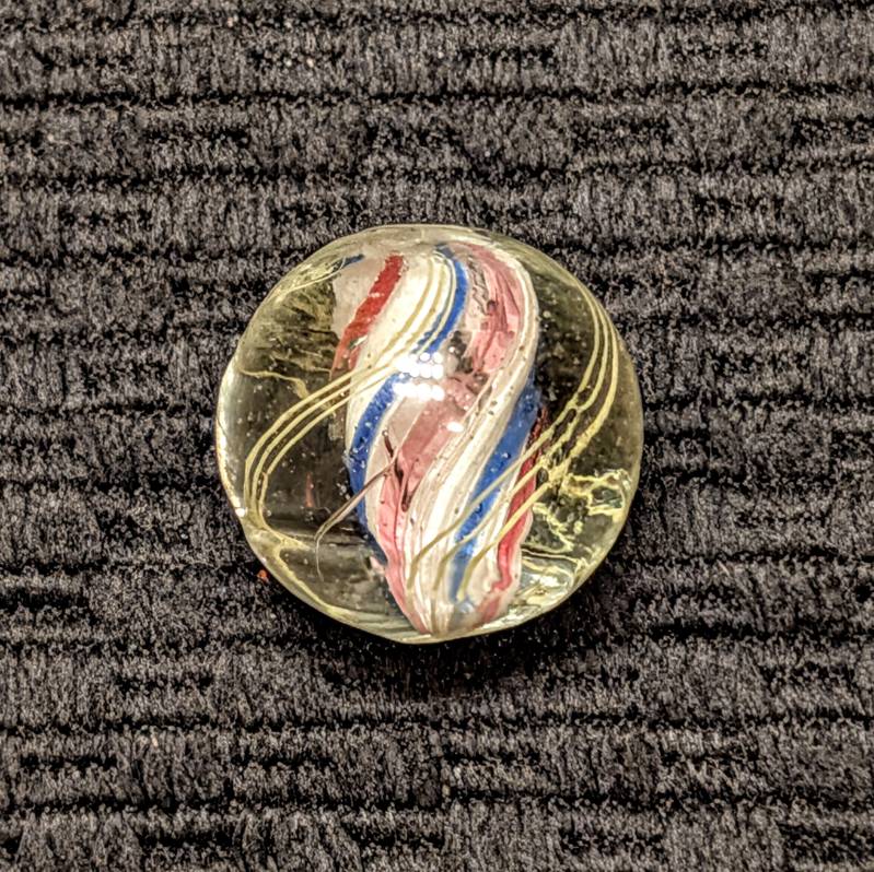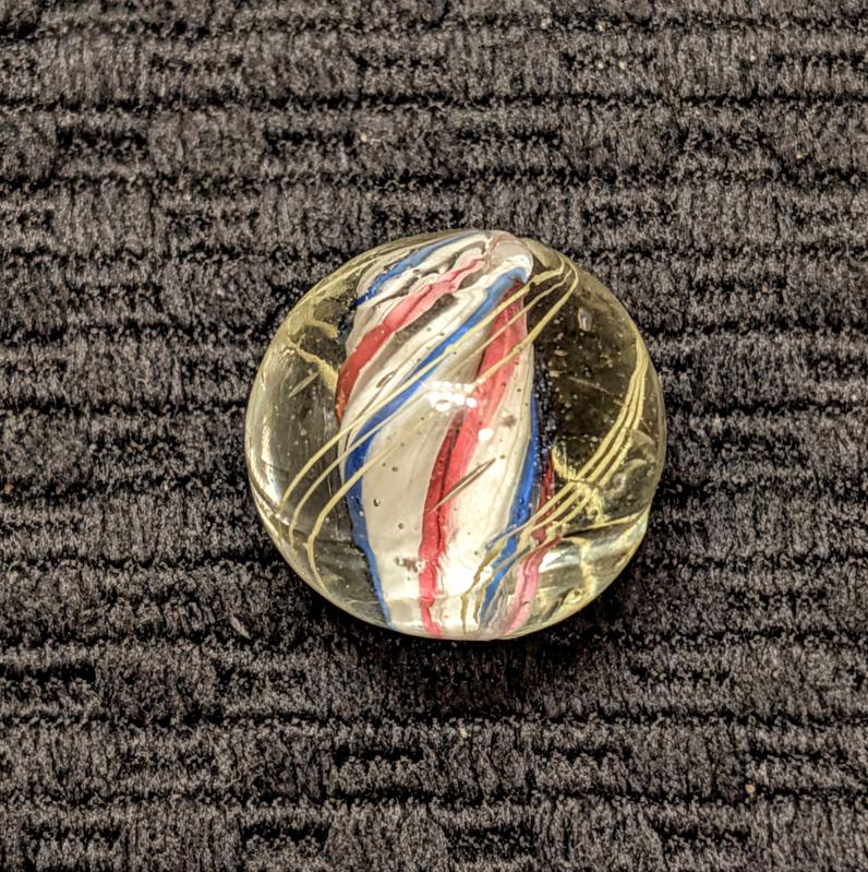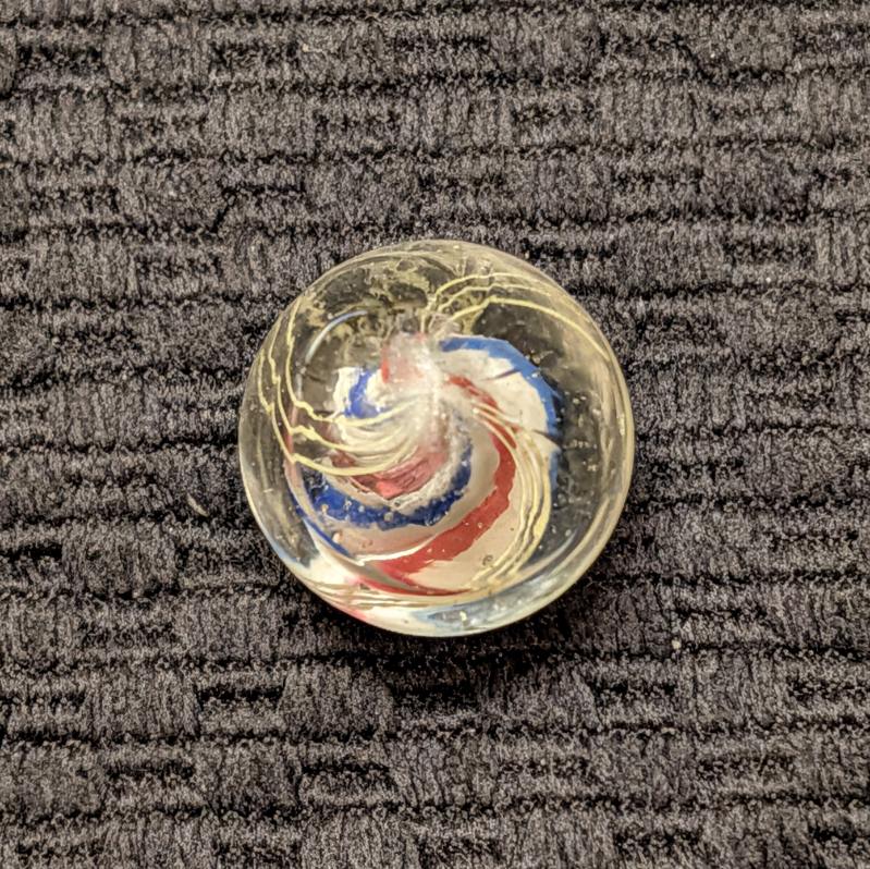 Shooter Size 3/4″ Double Ribbon Swirl made from 2 separate Red-White-Blue Ribbons that are closely spaced w/ a narrow gap on one side and a normal wider gap on the other side, making it look like a solid core swirl. Whether you call it one or the other, it doesn’t matter because I’m pricing it low at solid core swirl values. Wet mint -.