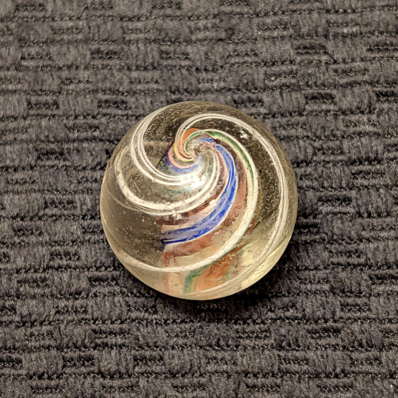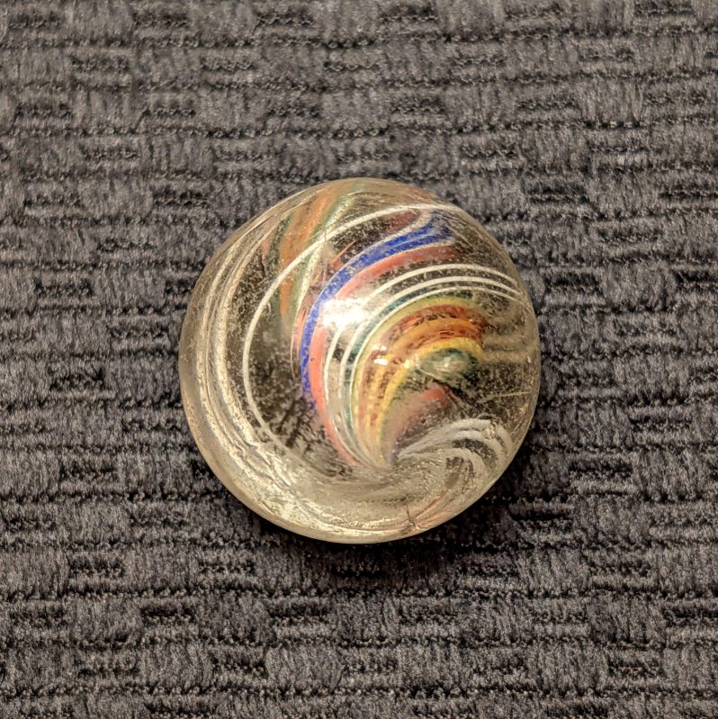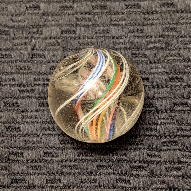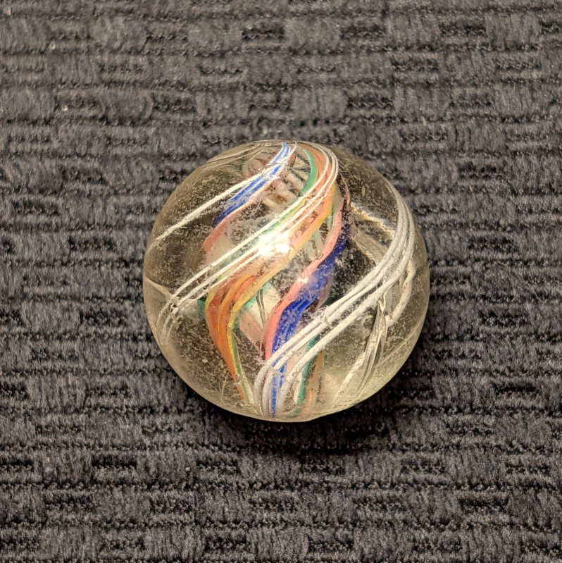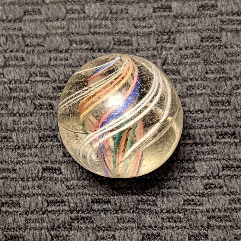 Large 1-1/16″ Divided Core Swirl with 2 Red-White-Blue Striped Ribbons and 2 Orange-Yellow-Green Striped Ribbons that Alternate in the Core. Outer Groups of White Threads. Light wear, scratches and fleas. Coin not included.