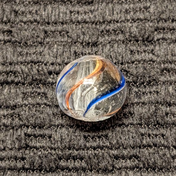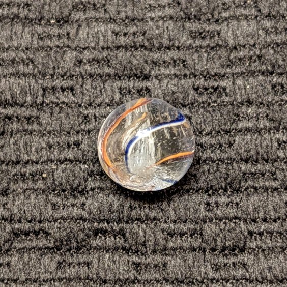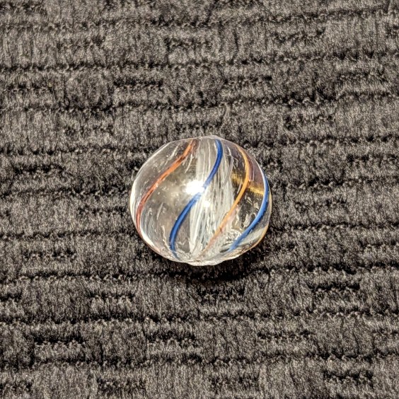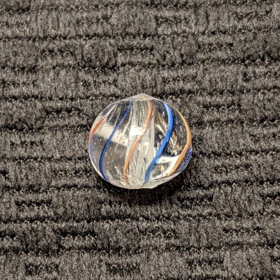 Micro Peewee White Latticino Swirl measuring only 7/16″ at the widest point. Outer Thin Ribbons of Transparent Red/Yellow & Blue/White. Mint.