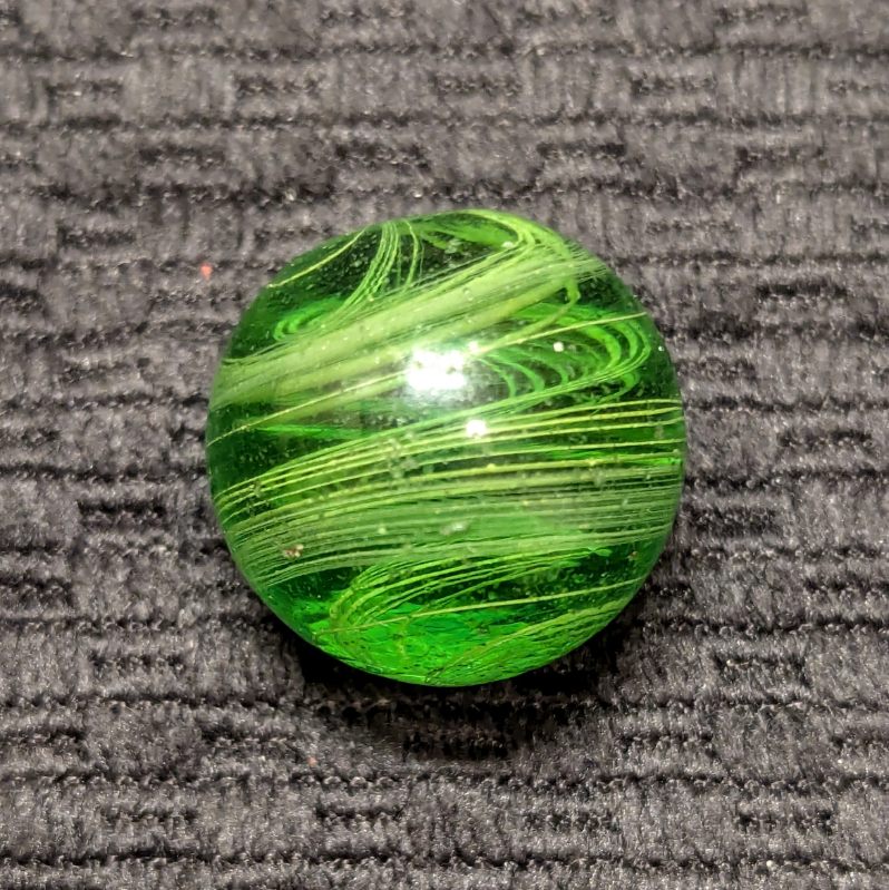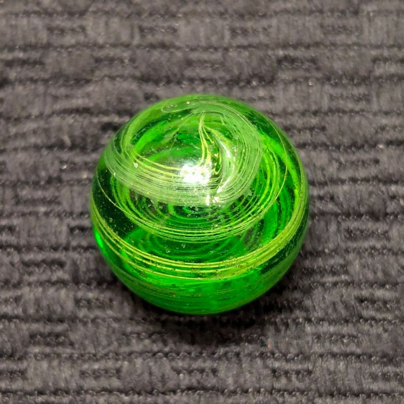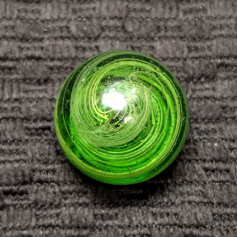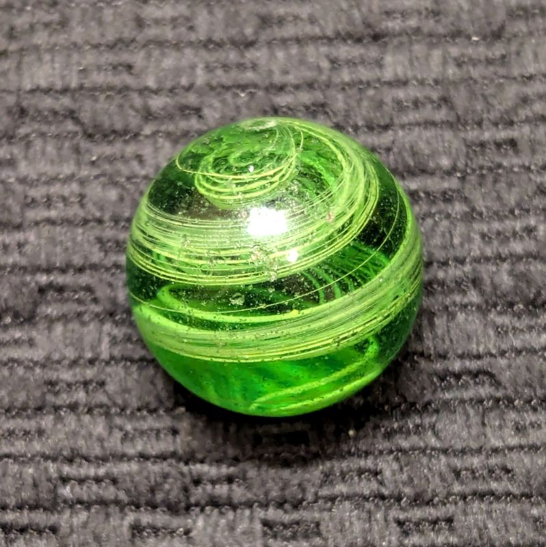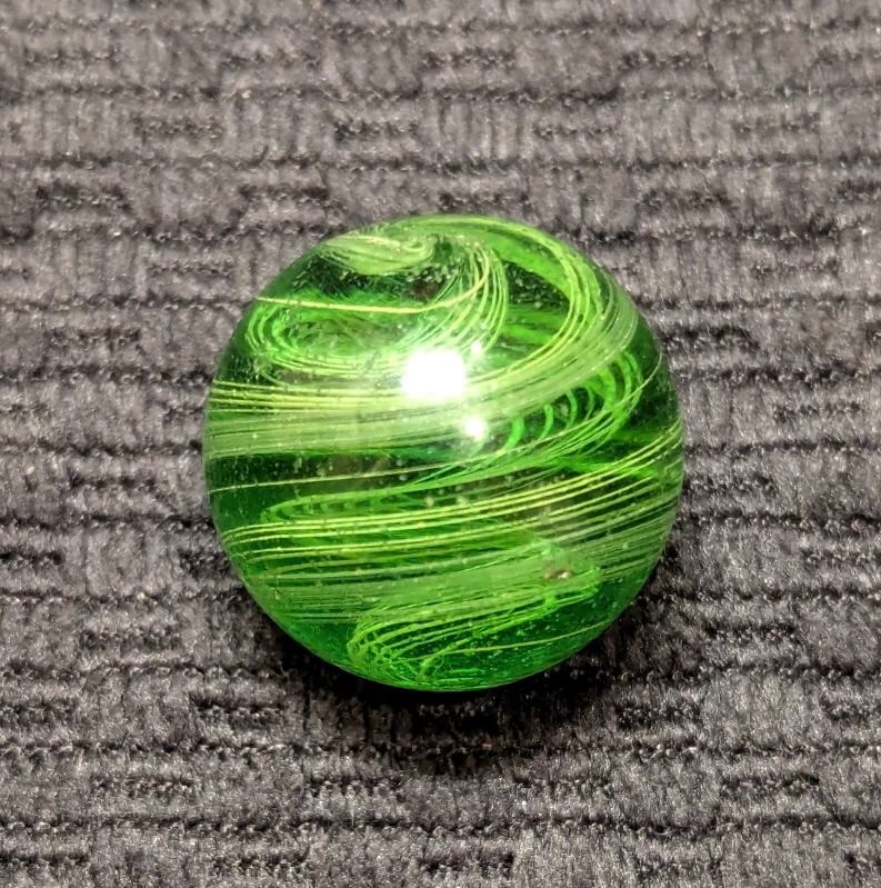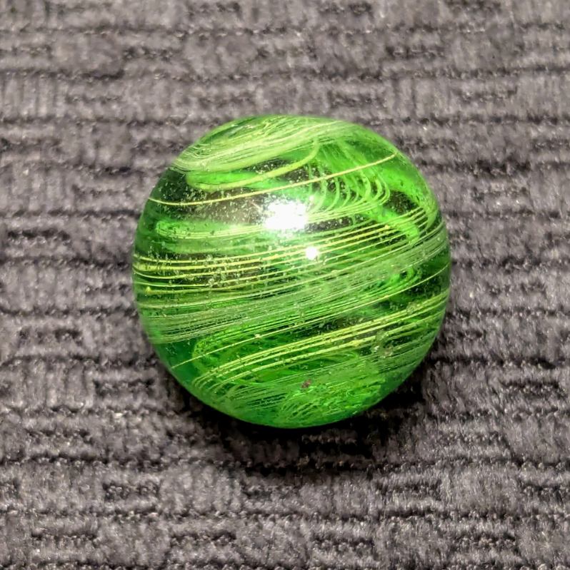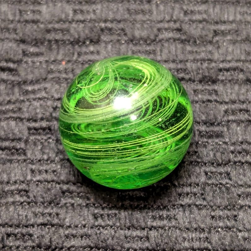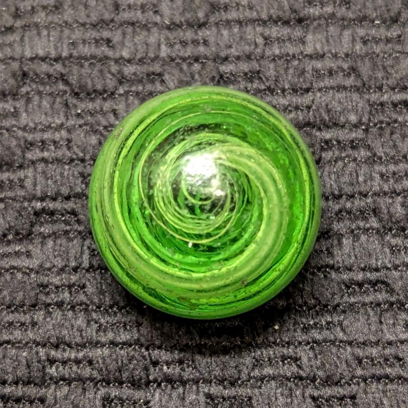 7/8″ Ultra Rare 3-1/2x Twist Yellow Latticino Ribbon in GREEN Colored Glass with Yellow Outer Threads. This rare beauty spins & Spins! Mint Condition and Faceted Pontil, circa 1850-1880. From my personal collection.
