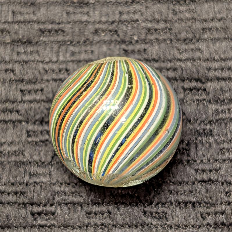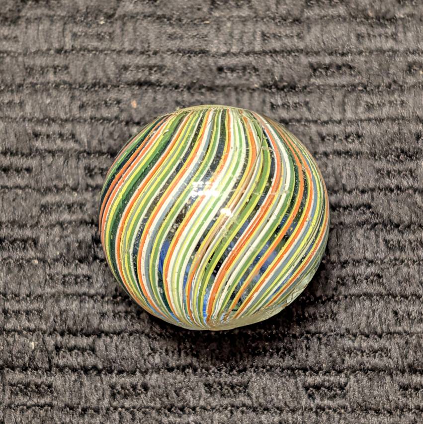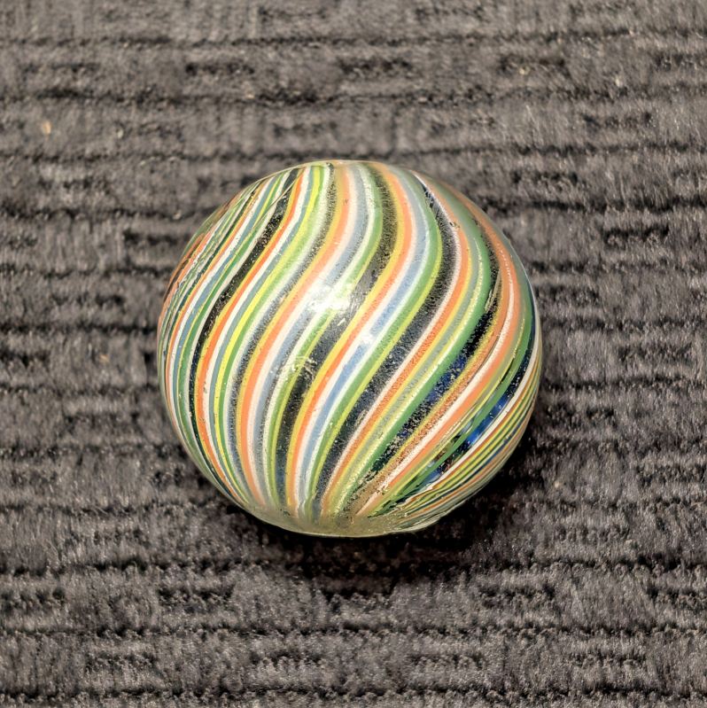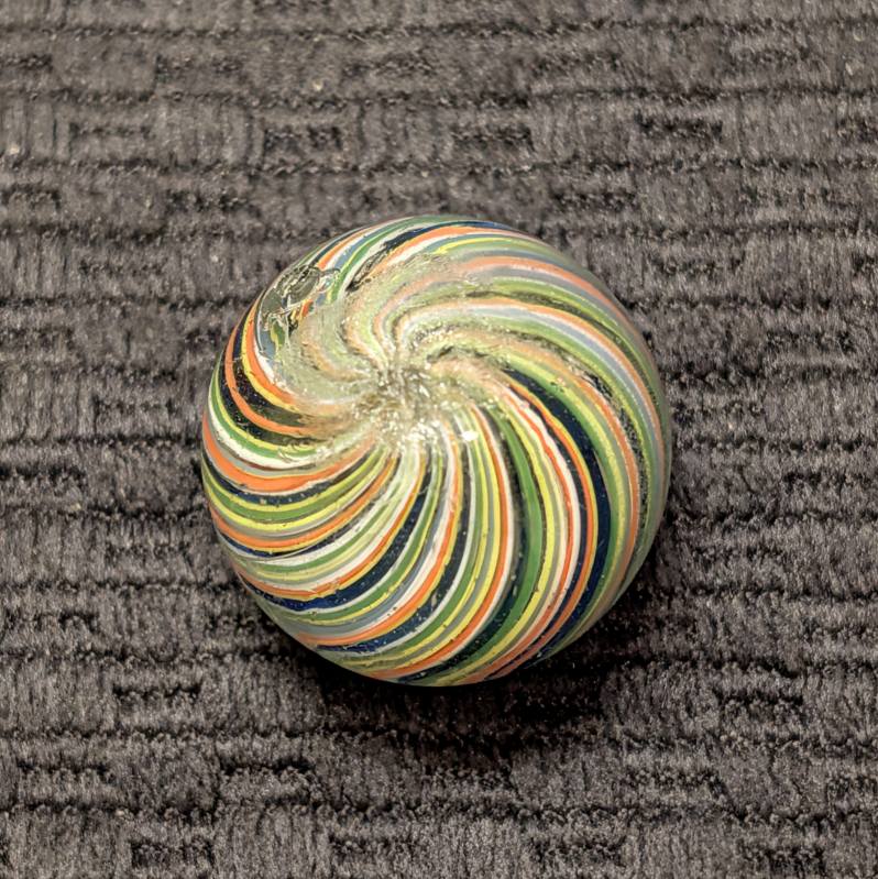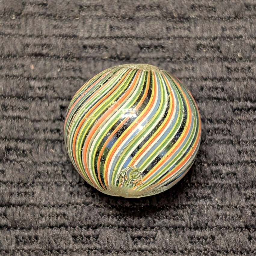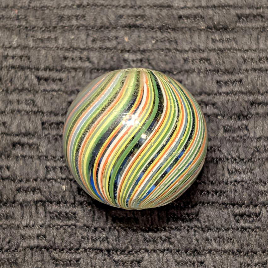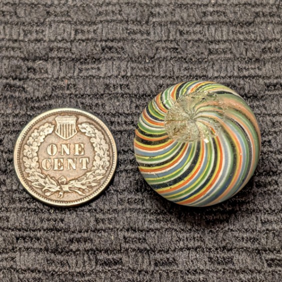 An Outstanding Large 7/8″ Fine-Line Joseph’s Coat Swirl with a pattern that seems to be repeating or close to it 12 times! Large Fine-Line JCs are rarely seen this beautiful. Overall great condition. If not for a small chip near the pontil and a little dull area, this baby would be a $400-450 marble! Coin not included.