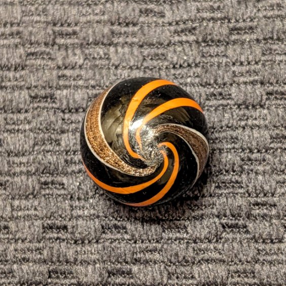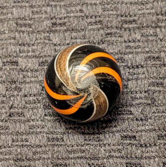 Pristine Large 13/16″ Black Opaque Banded Lutz w/ Orangish-Red Ribbons! Gorgeous symmetry, bright color contrast, craftsmanship, strong twist and impeccable condition – this beautiful gem is from my personal collection, and has it all! You’d be hard pressed to find a better one! Wet Mint. Coin not included.