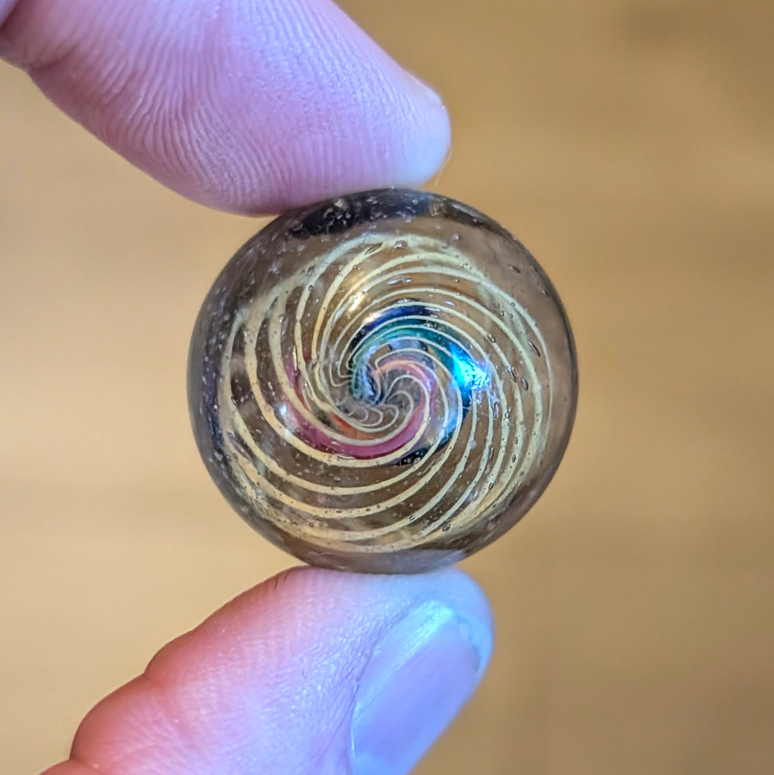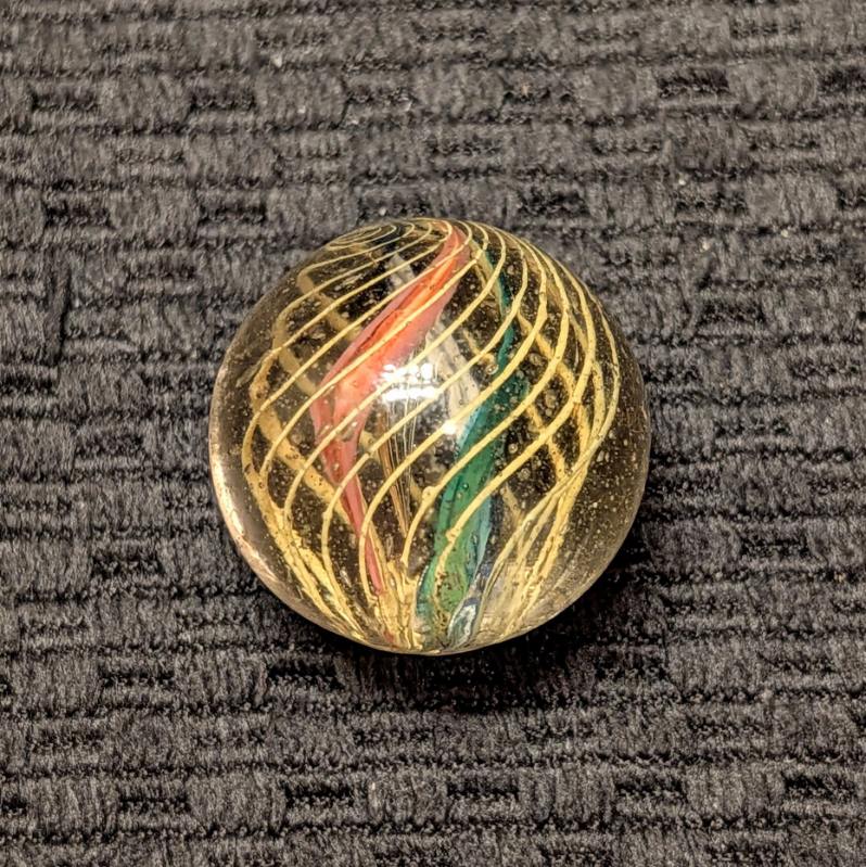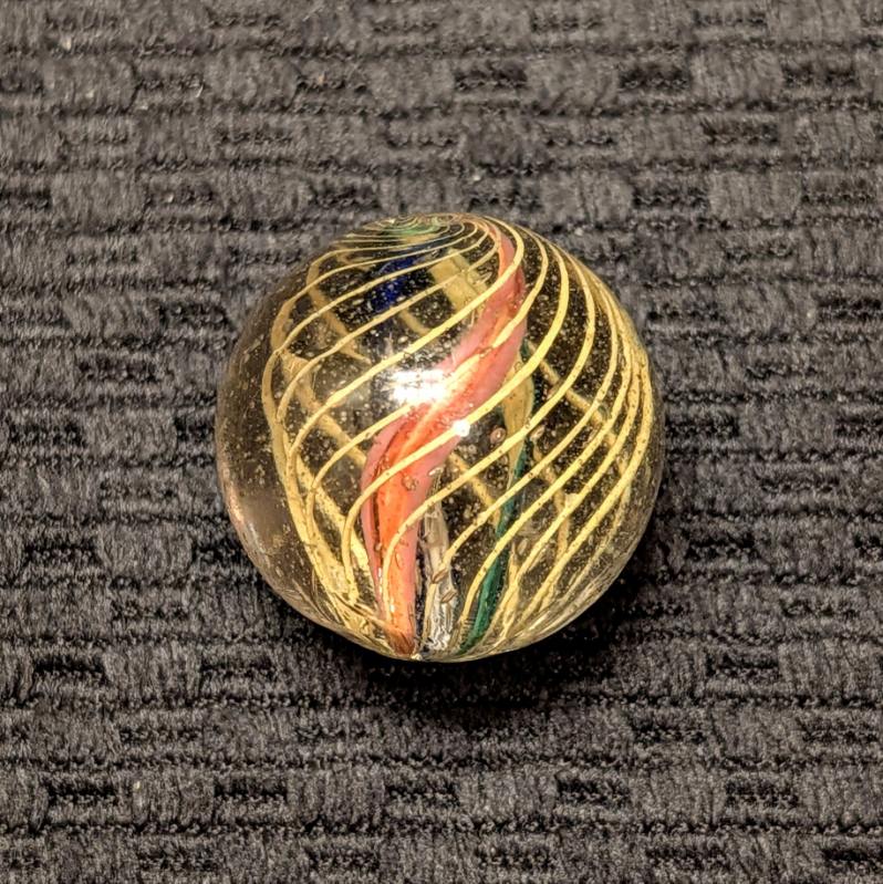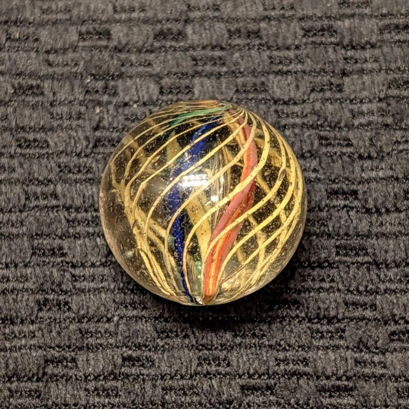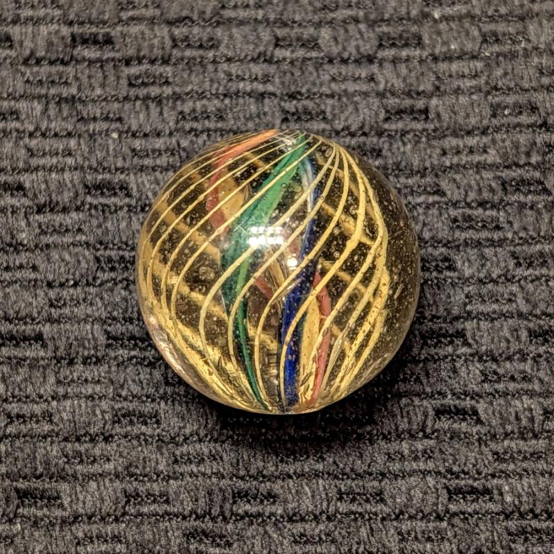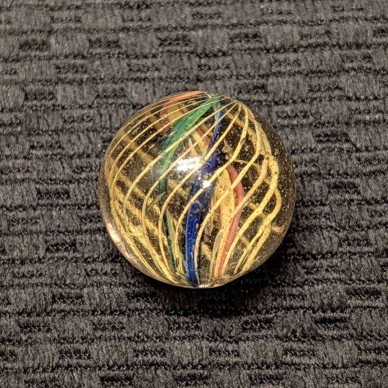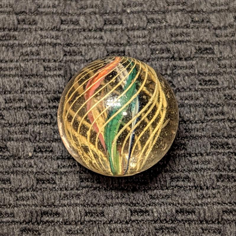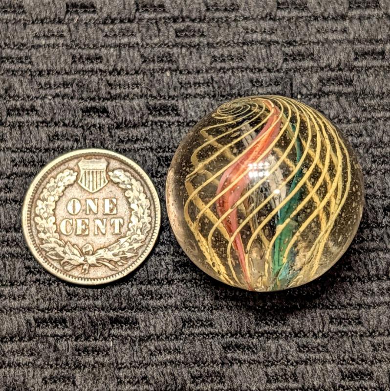 Large Full 1″ Shrunken 3-Ribbon Divided Core Swirl of Red/Yellow, Green/Yellow & Blue/White Ribbons, and a Perfect Symmetrically Spaced Cage of 14 Yellow Threads. Immaculate Wet Mint Original Surface Condition with Ground Pontil that dates this to 1880 or earlier. Coin not included. From my personal collection.
