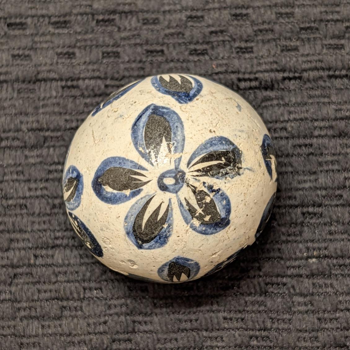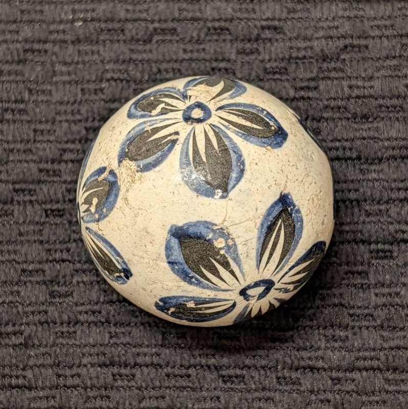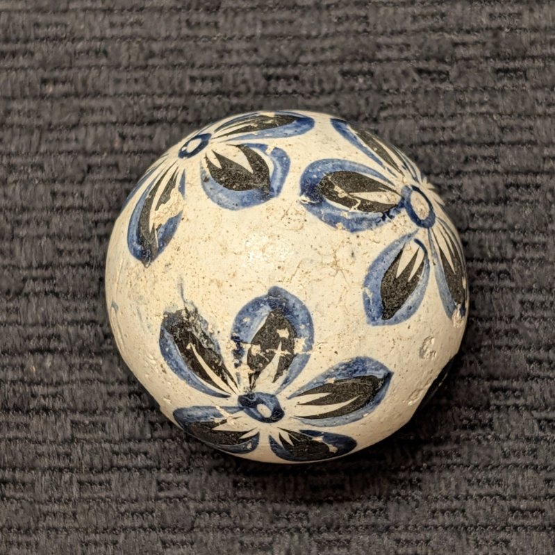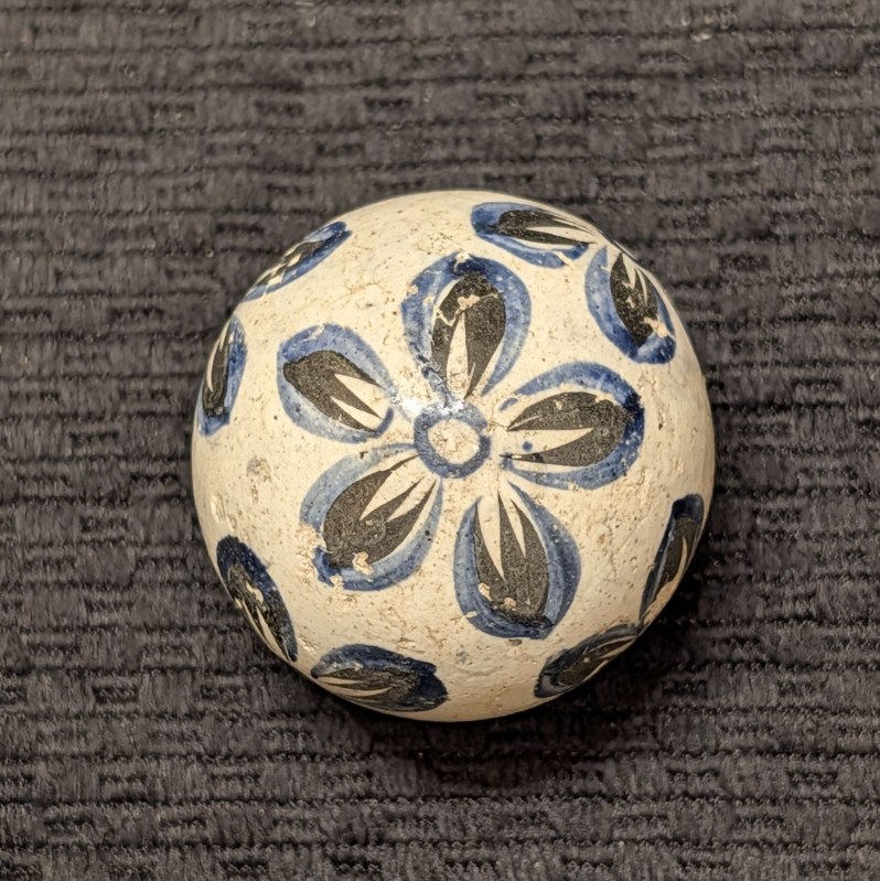 Big Beautiful Nearly 1-11/16″ 6-Flower Pennsylvania Dutch China with a Gorgeous and Symmetrically Spaced Black and Blue 5-Pedal Flower Pattern. Minor handling and scattered fleas. Strong Paint!