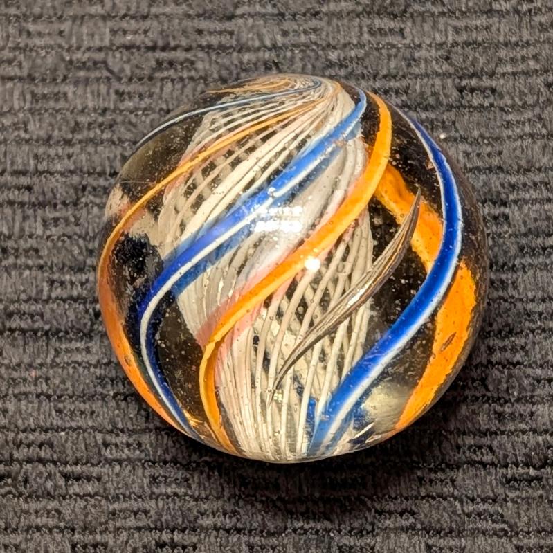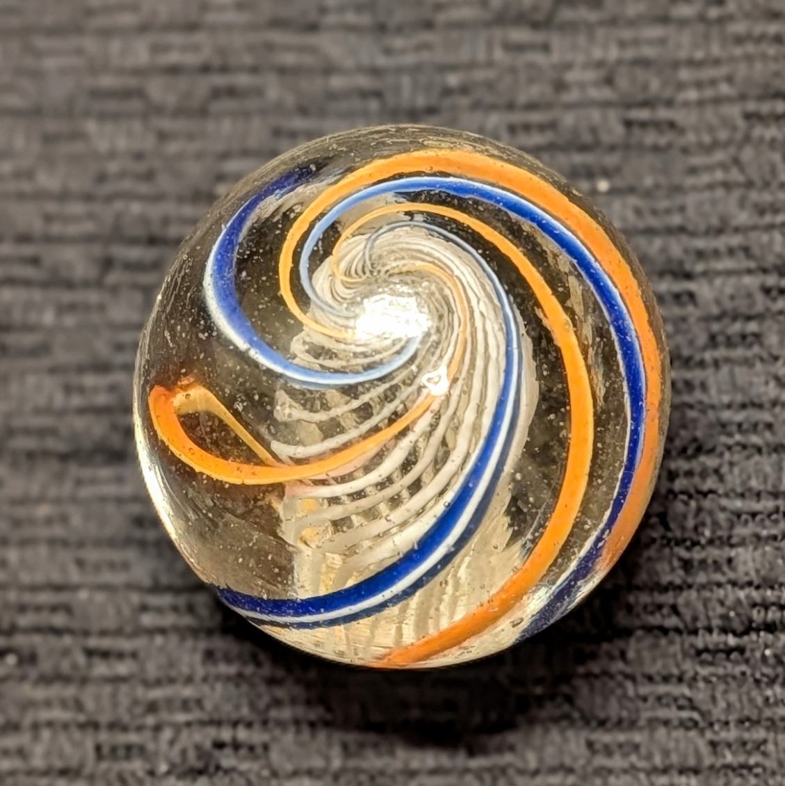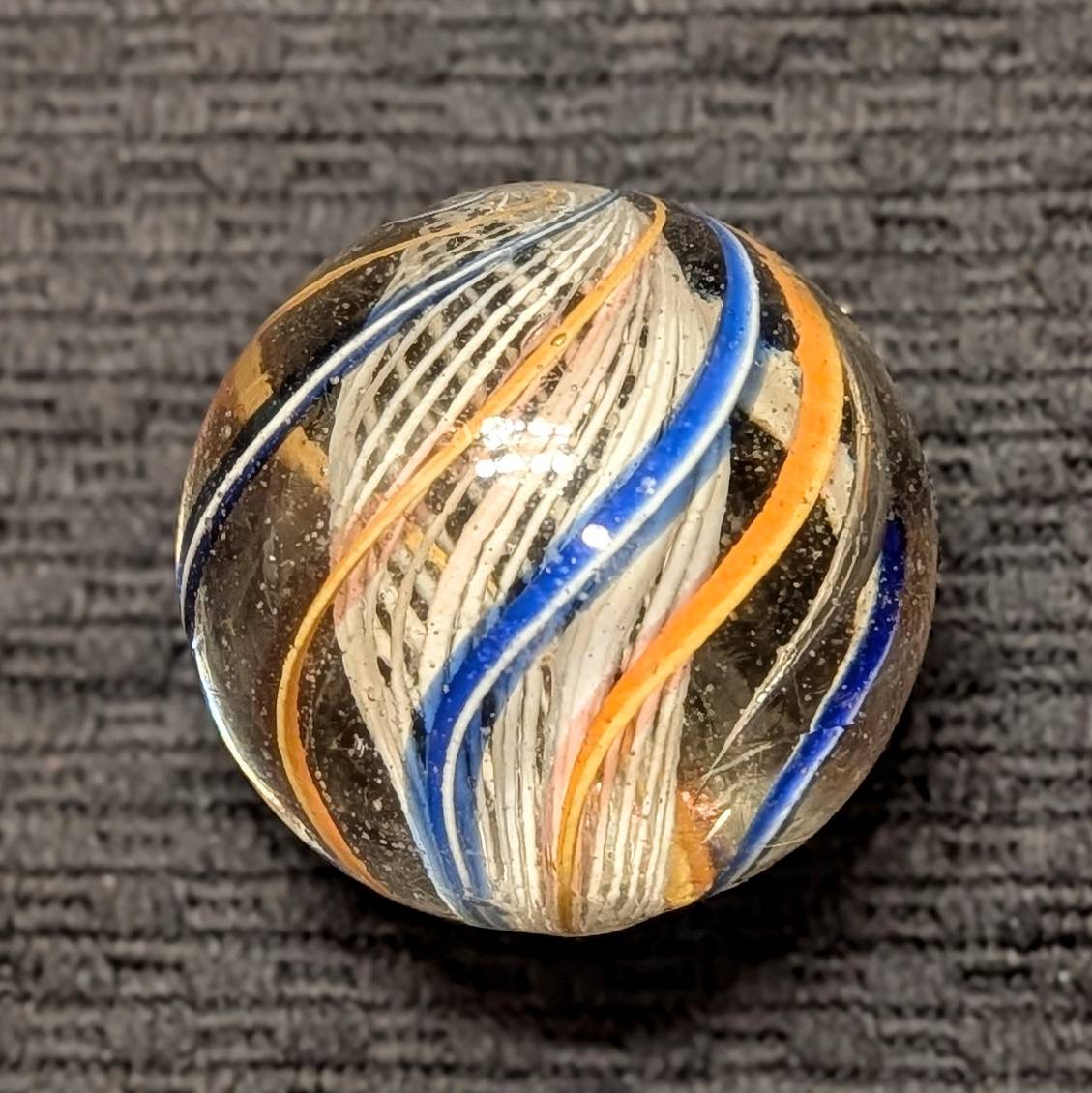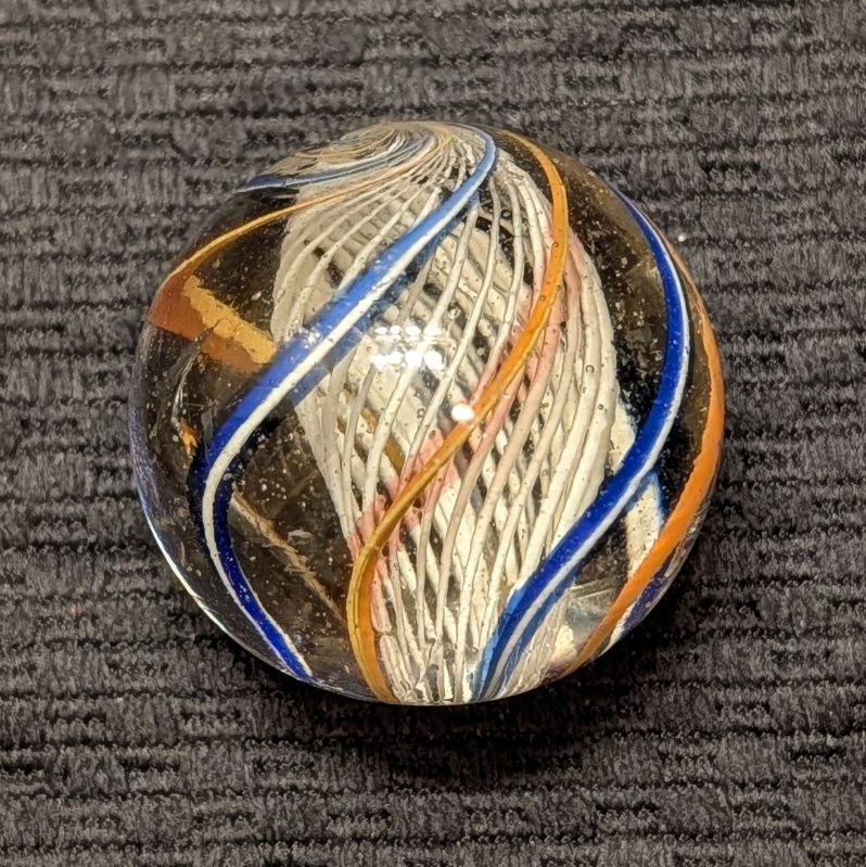 Big 1-5/8″ Bright White Latticino Swirl with 3 Cobalt Blue & White Ribbons alternating with 3 Red & Yellow Ribbons. A pretty and well made marble. Wet Mint original surface. Coin not included.