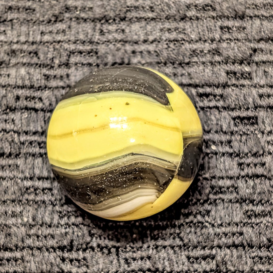 Big 15/16″ Marble King Bumblebee. Interesting touch mark smear in the pattern, and as-made hard to see cracks from the annealing process that really don’t show up in hand. Photographs magnify any flaws. Mint w/ as-mades. FREE to young collector 16yrs or under, or a new collector 1 yr or less.