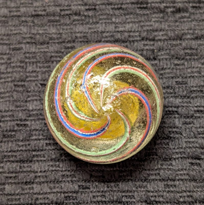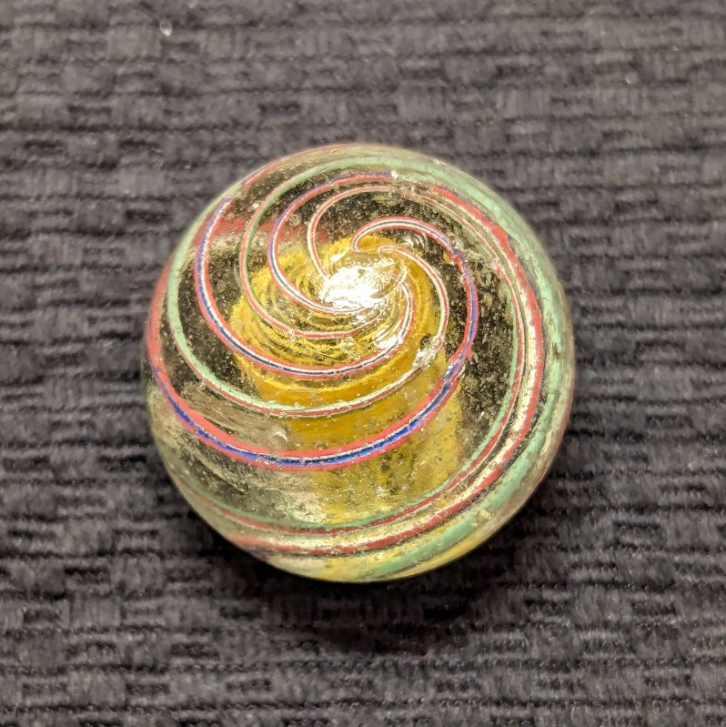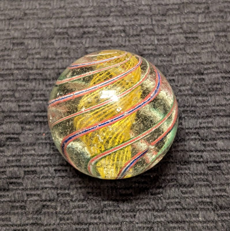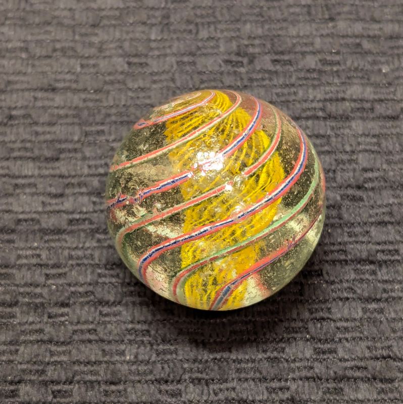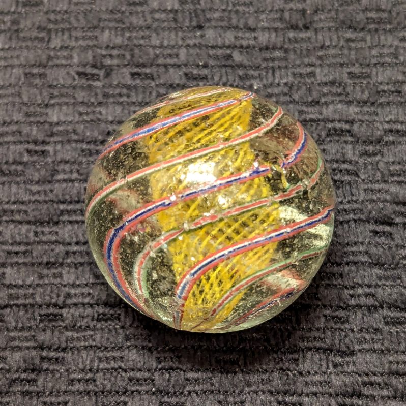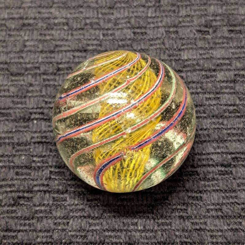 Well-Made Large 1-9/16″ Yellow Latticino Swirl w/ 6 outer ribbons – 3 Red/White/Blue, and 3 Red/White/Green. Many tiny nicks on the surface, but no significant Chips.