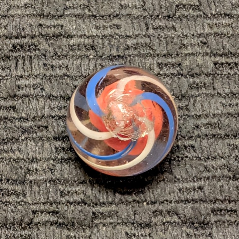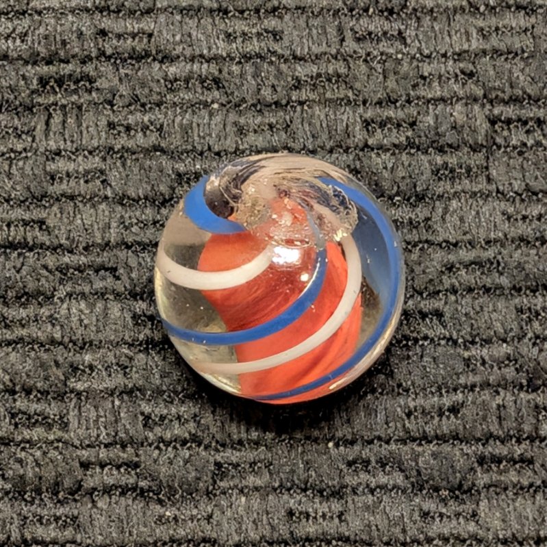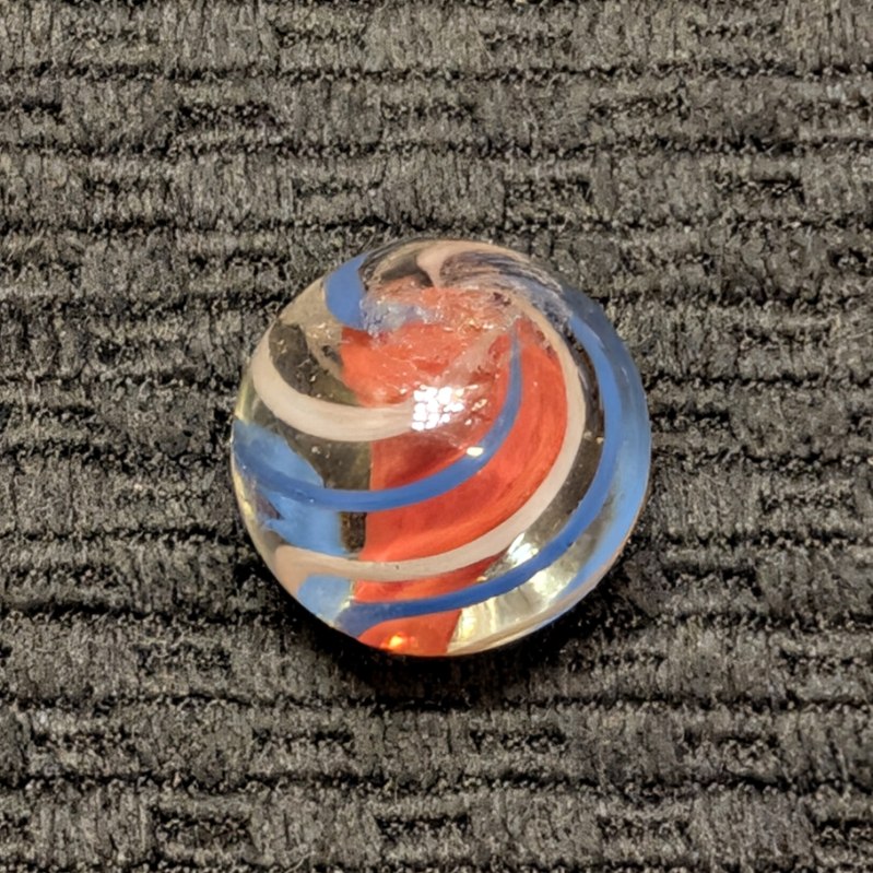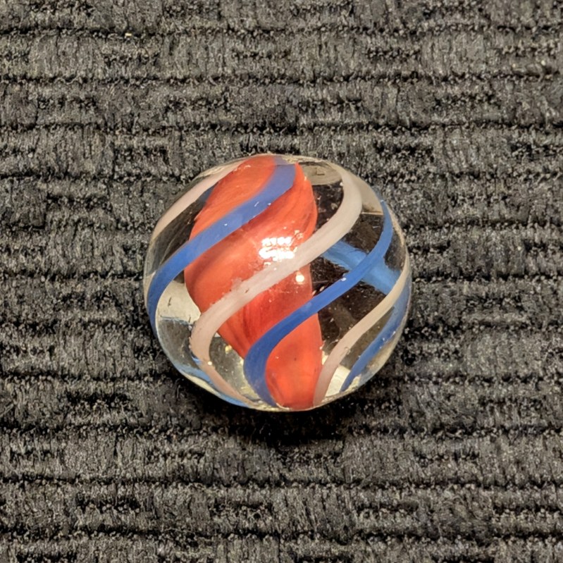Bright Cherry Red Solid Core English-Style Swirl with 3 blue outer ribbons that alternate with 3 white outer ribbons. Immaculate Wet Mint Condition.