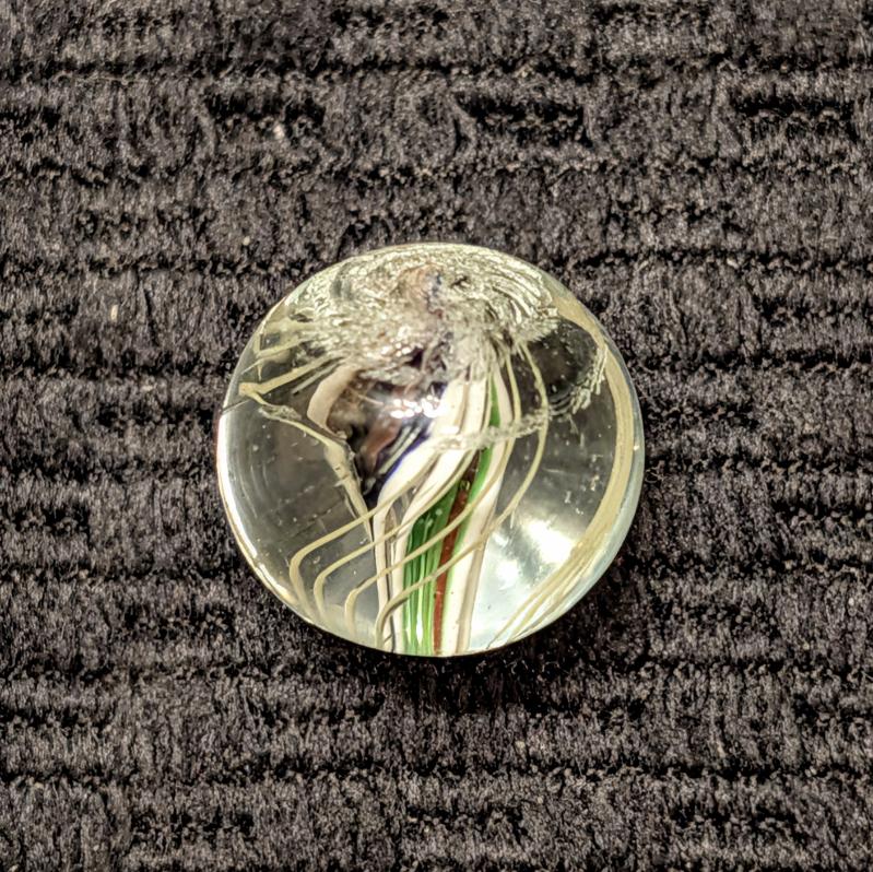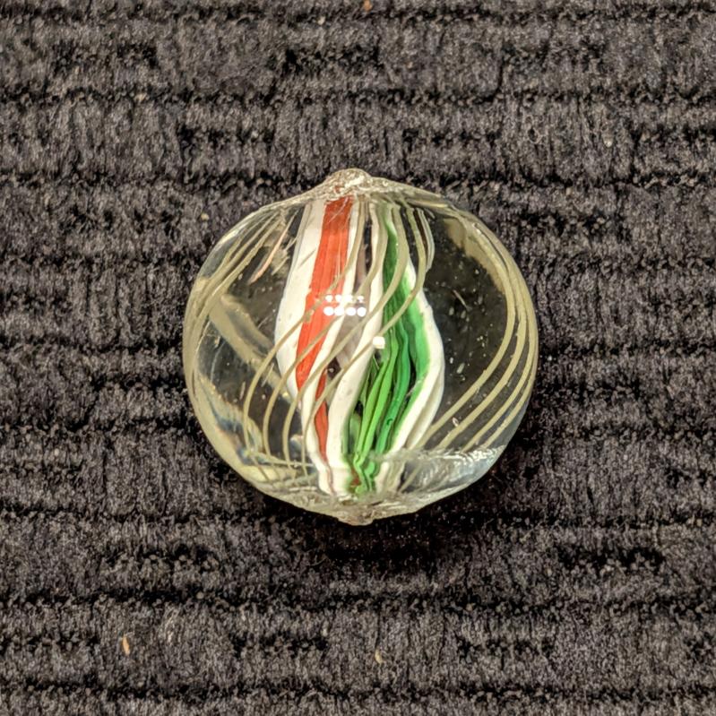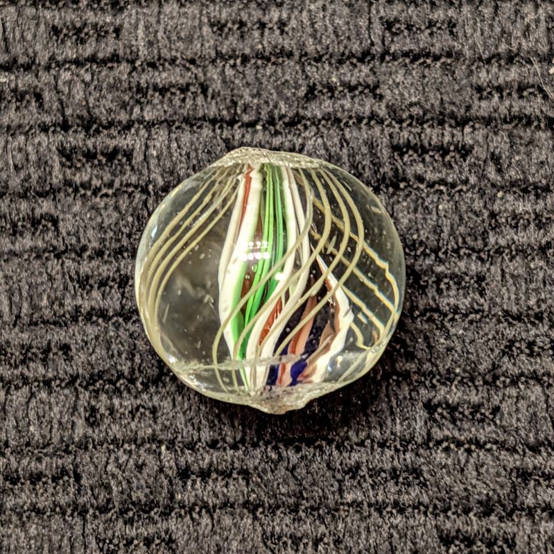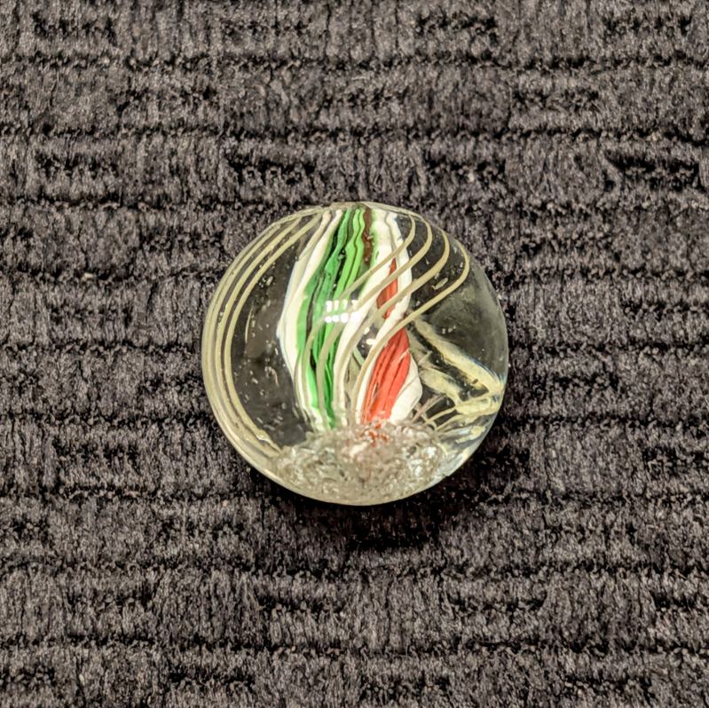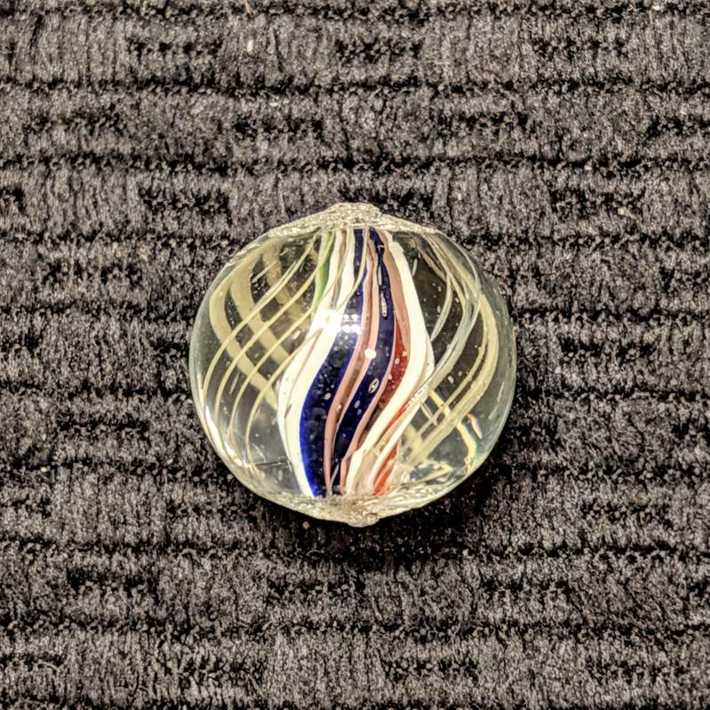 3-Ribbon Divided Core Swirl. Each Ribbon is Edged with White but Different. Ribbon Colors are Orange on White, Dark Blue w/ Dark Pink & Red Stripes on White, and Transparent Jelly Green with White Submarine Stripes that can be seen through the Green. 3 Sets of 4 Closely Grouped Yellow Outer Threads. Quite Colorful. Wet Mint.