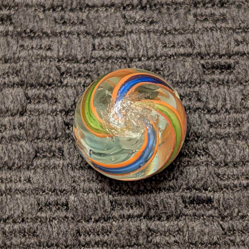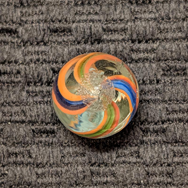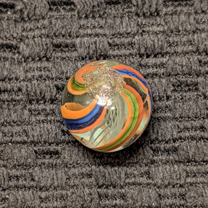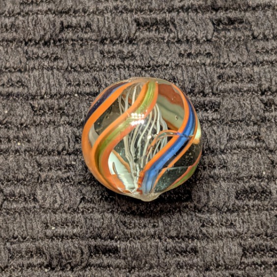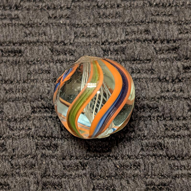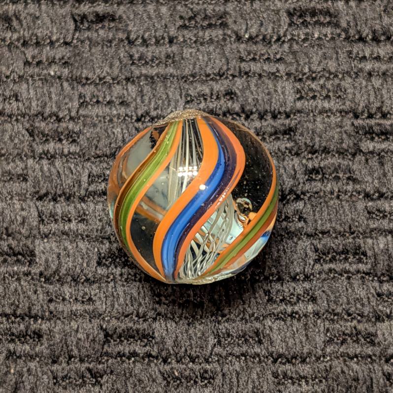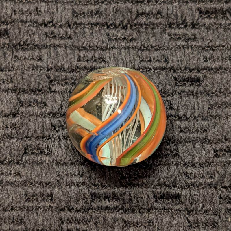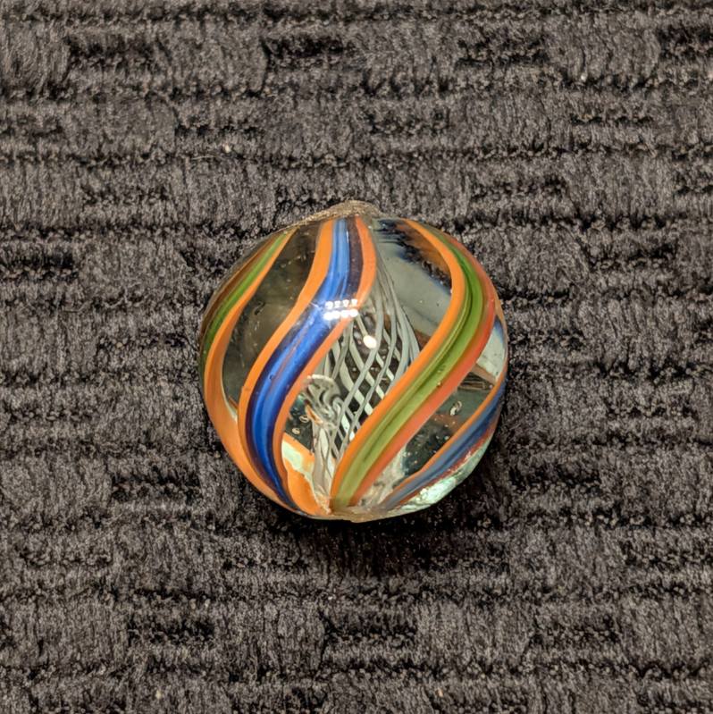 Striking Latticino w/ a White Core Surrounded by Bold Blue & Green Ribbons Trimmed in Orange with Exceptional Visual Appeal. Shiny Wet Mint- Original Surface, but with an as-made hot spot touch mark and annealing lines.