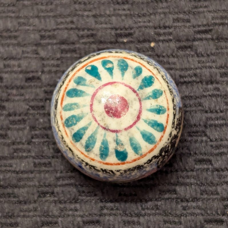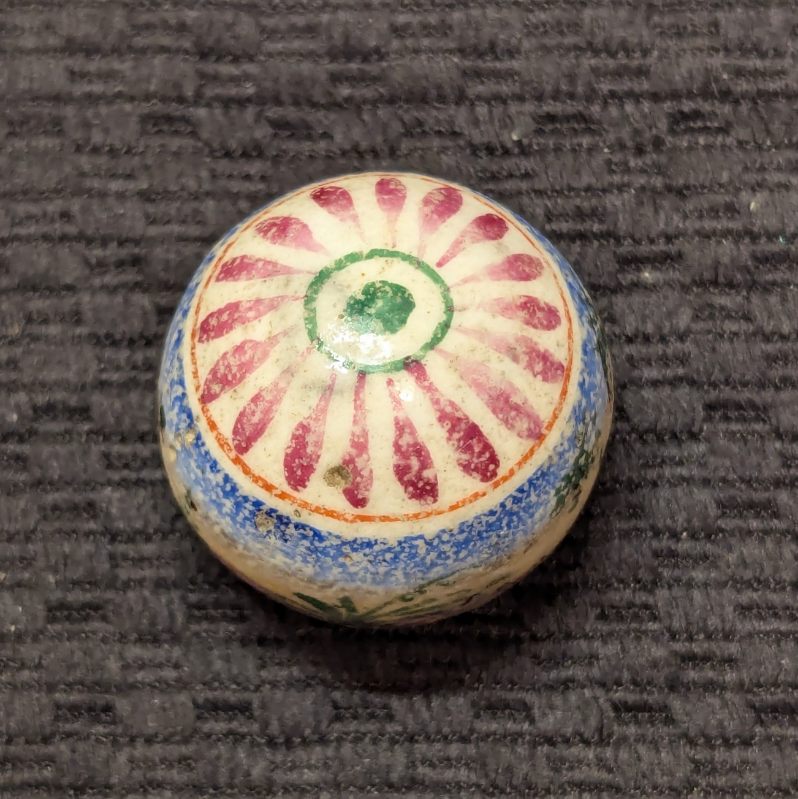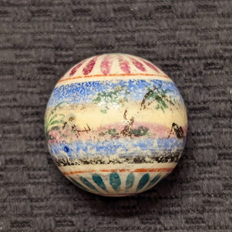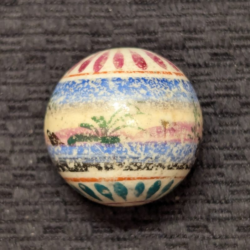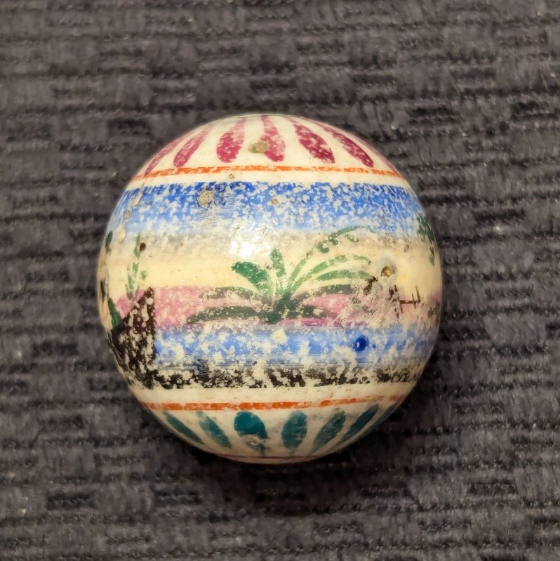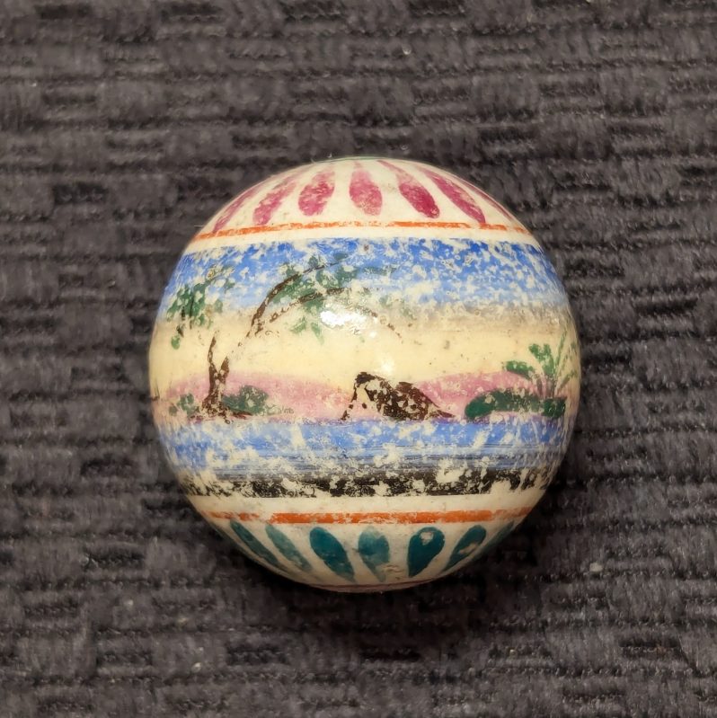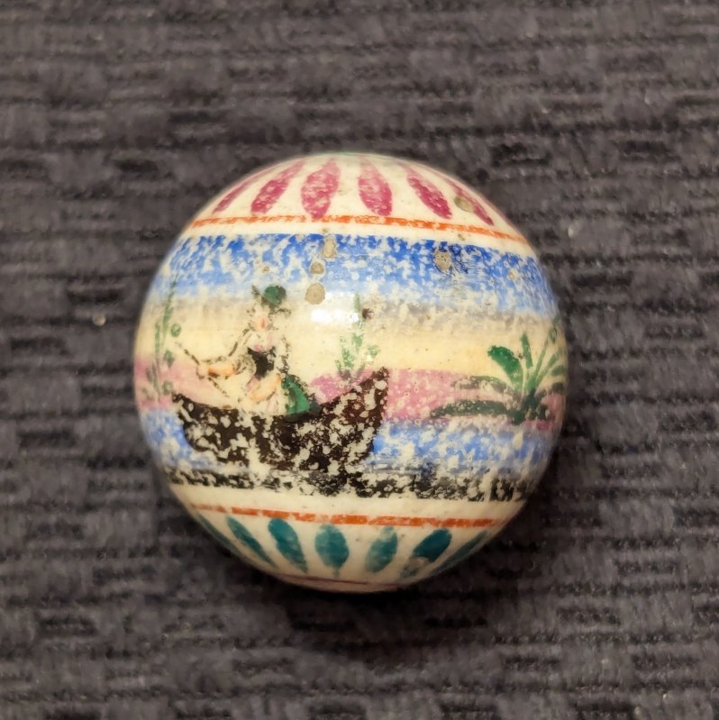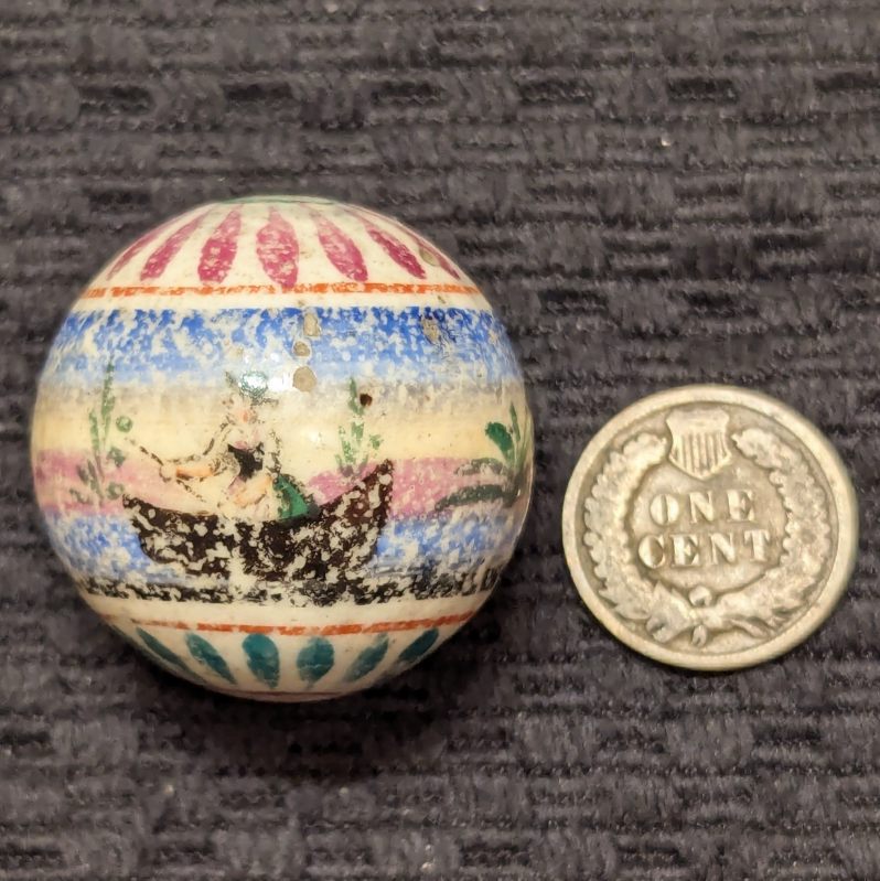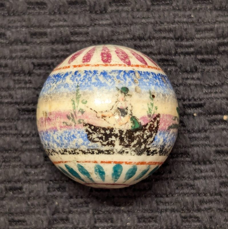 Extremely Rare Scenic China with a scene of a woman in a dress & green hat fishing from a row boat. Large fuchsia & teal bullseye & pinwheel designs at each pole (with reverse color pattern). Early Period and extremely rare type China – only about 12 known! Strong Paint, not fading or chips, just Near Mint from surface wear -original surface. Coin is for size comparison purposes, not included.