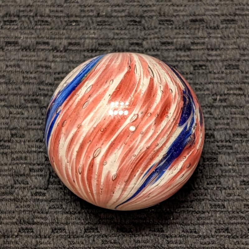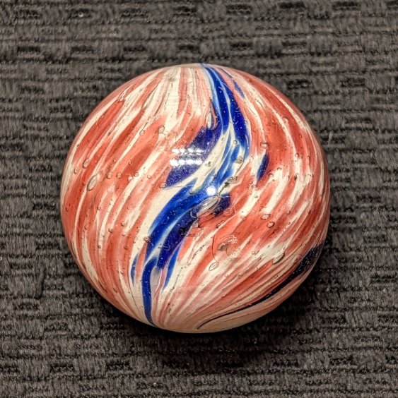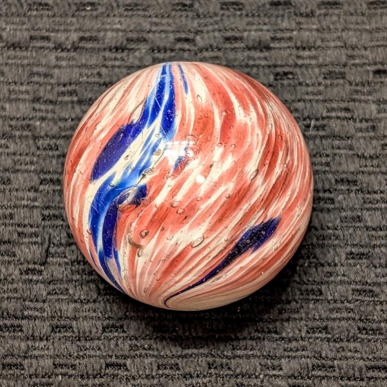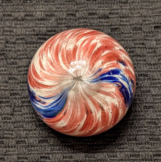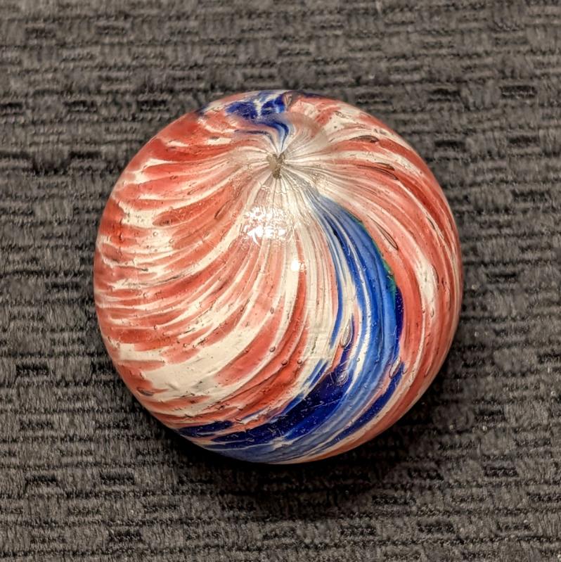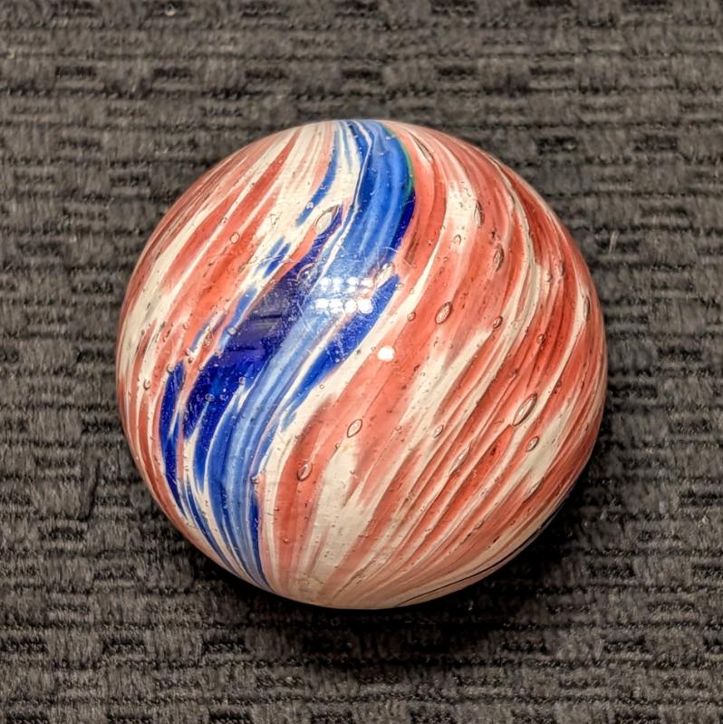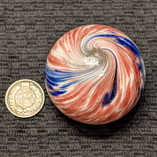 Fantastic 1-13/16″ 4-Panel Red, White & Blue Streaked End-of-Day and indications of slight lobing. Early faceted pontil, circa 1850-1880. Original shiny surface with only a single hard to see small crescent reflection barely worth mentioning. White background is underwater. Wet Mint-. Coin is for demonstrating size, not included.