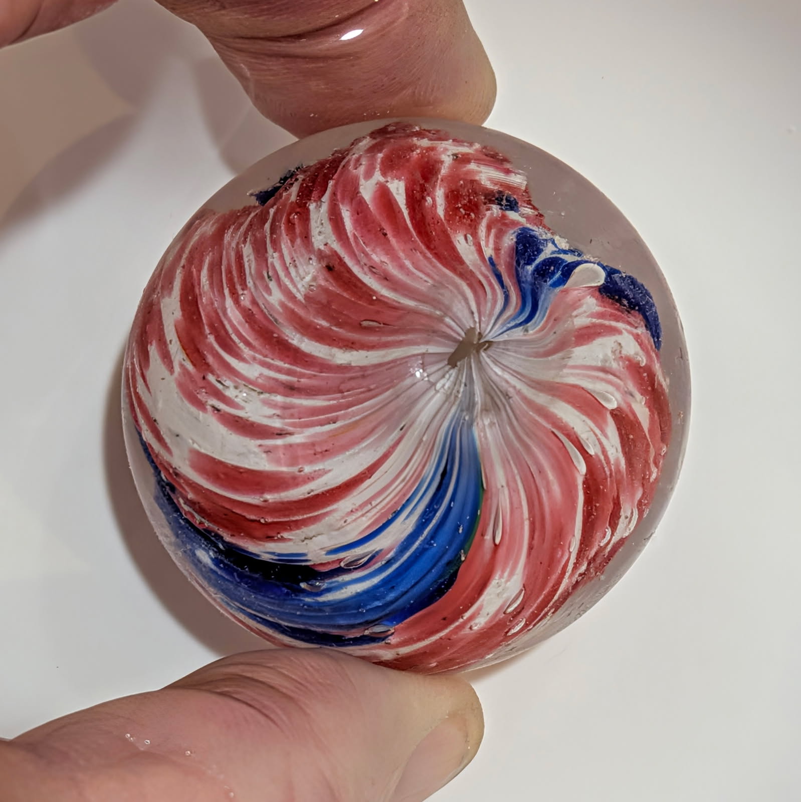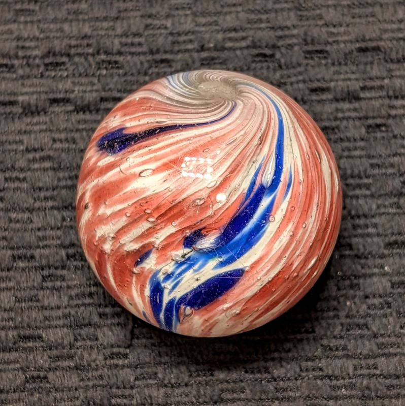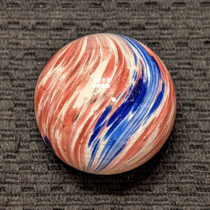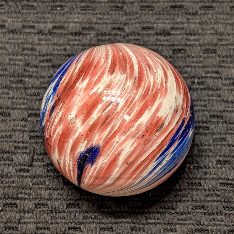 Fantastic 1-13/16″ 4-Panel Red, White & Blue Streaked End-of-Day and indications of slight lobing. Early faceted pontil, circa 1850-1880. Original shiny surface with only a single hard to see small crescent reflection barely worth mentioning. White background is underwater. Wet Mint-. Coin is for demonstrating size, not included.