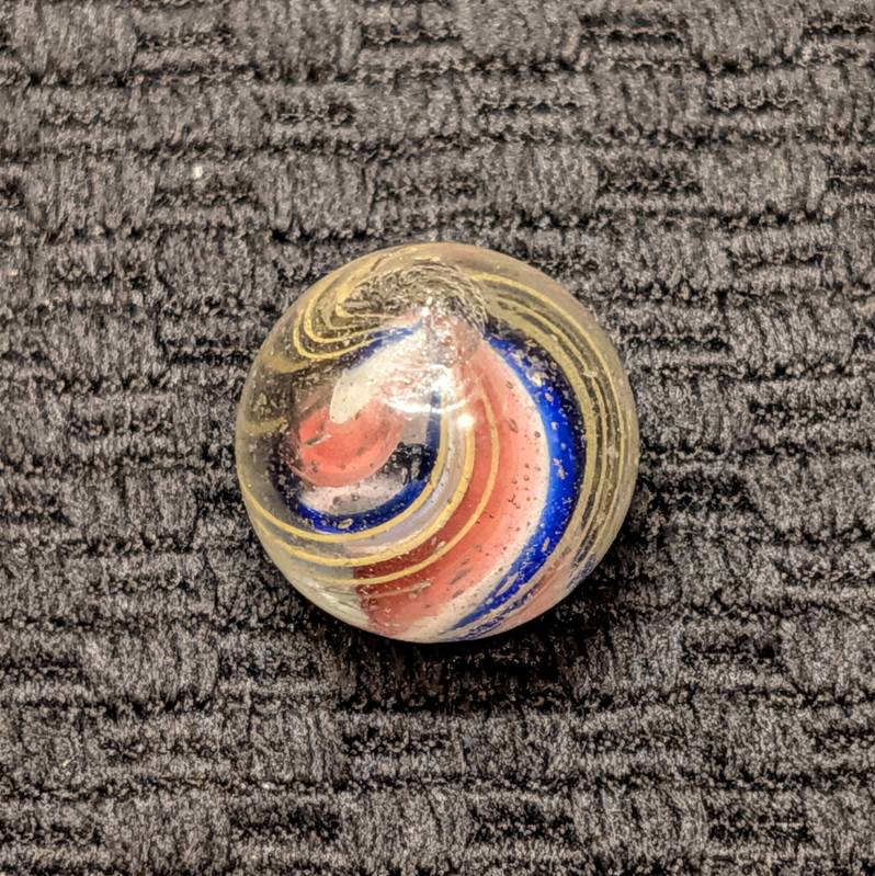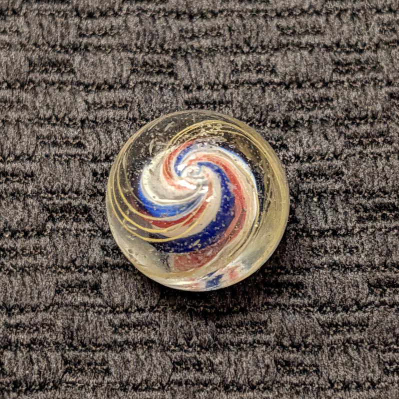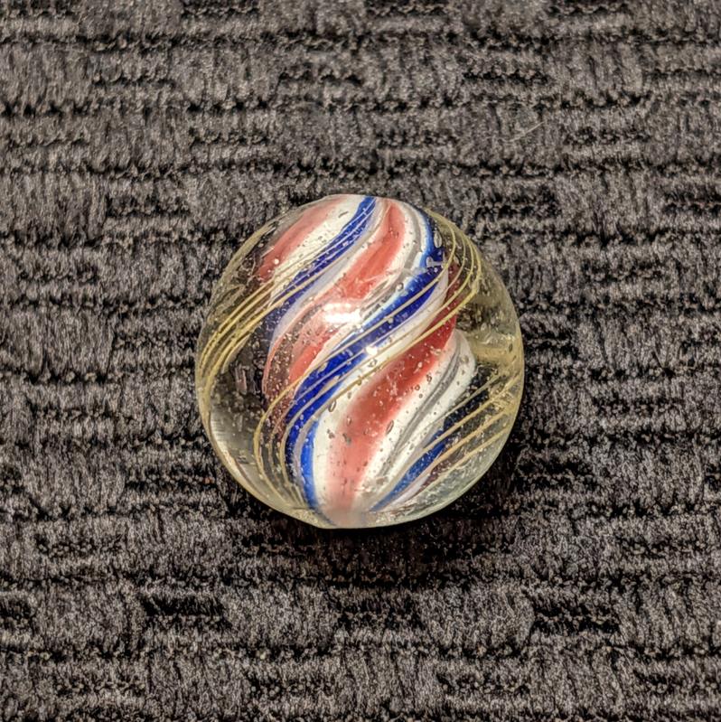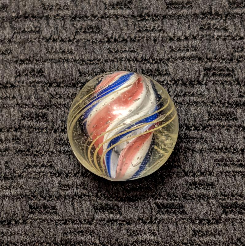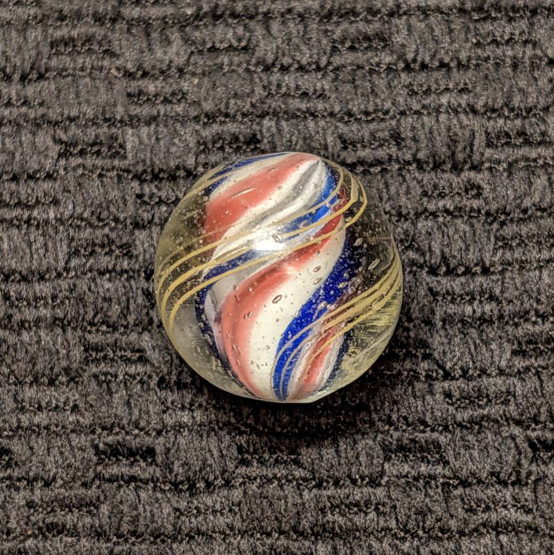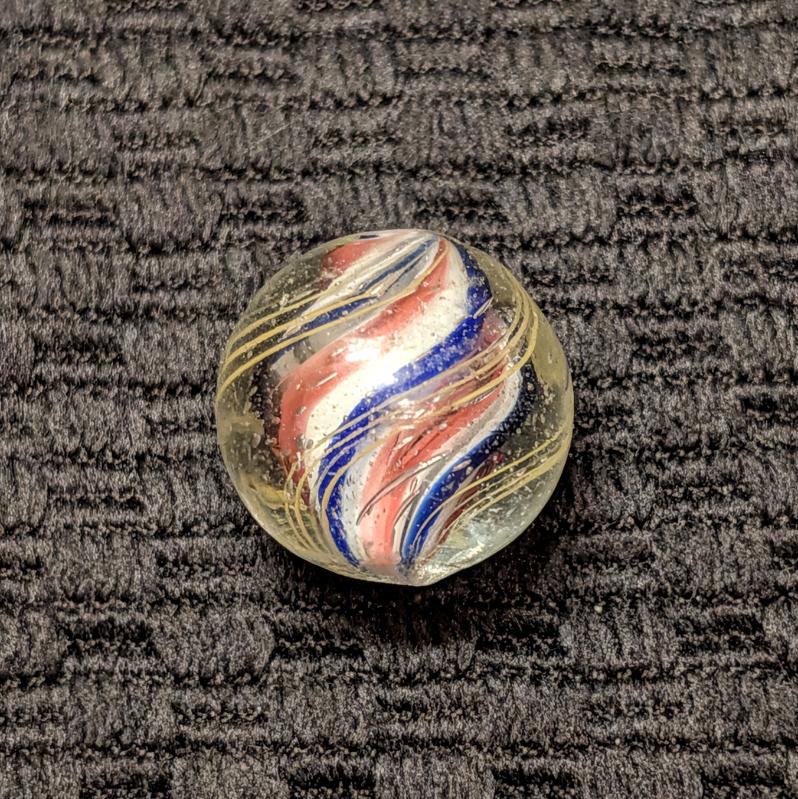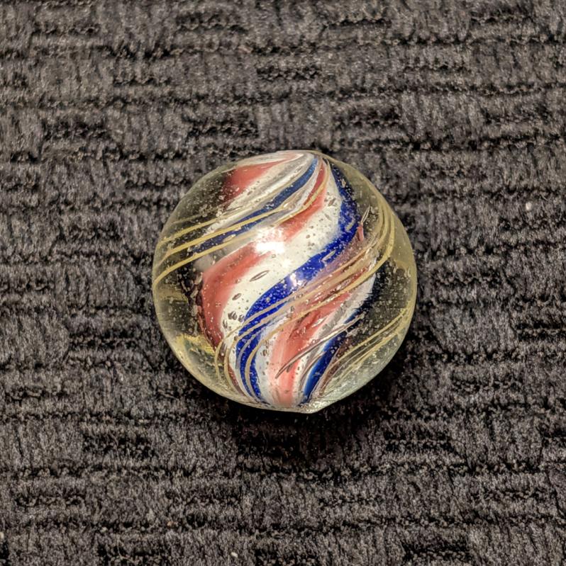 Slightly Ridged Red-White-Blue Solid Core with 3 Blue Ridges and Red Valleys Over a White Base. As made micro dimples near the pontil. Mint.