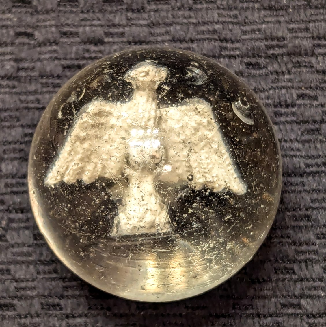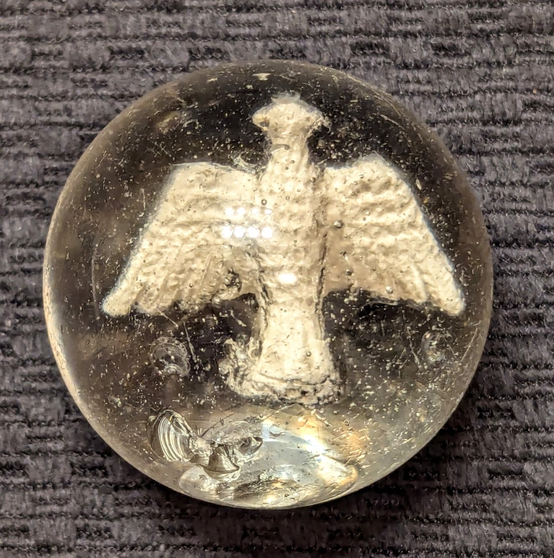Giant Almost 2″ (1-31/32″) Rare Spread-Wing Eagle Sulphide. Actually I’ve always thought this looks more like a Thunderbird or Phoenix! Nice Silvered & Detailed Rare/HTF Figure with no detracting bubbles. Centering is good. Some handling & chips but fortunately they’re out of the way. Early faceted pontil.