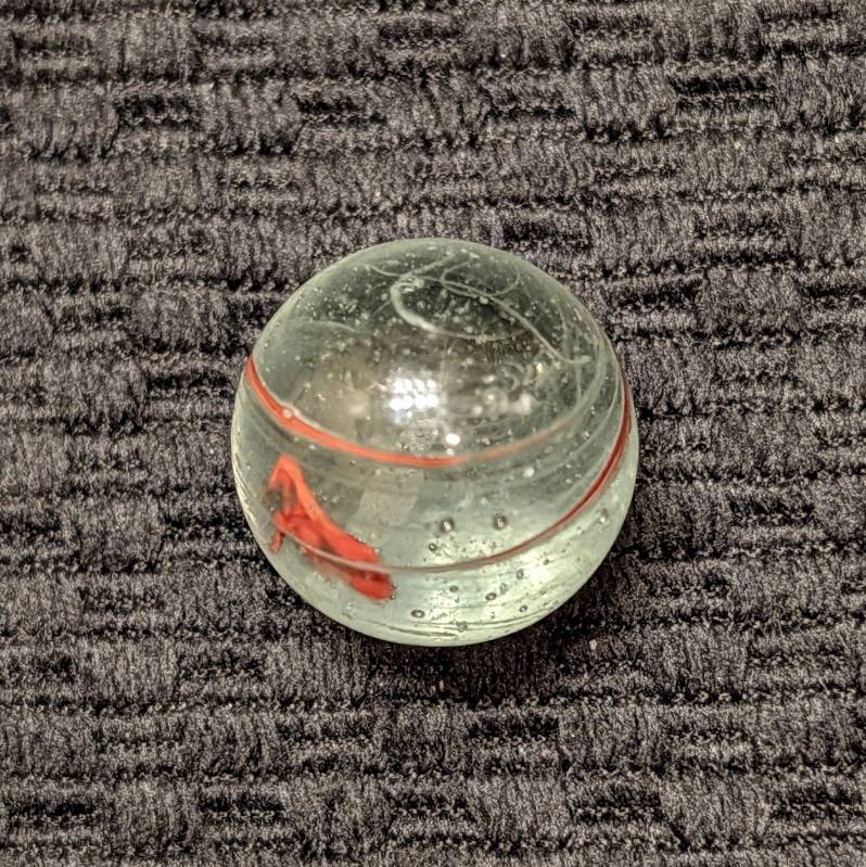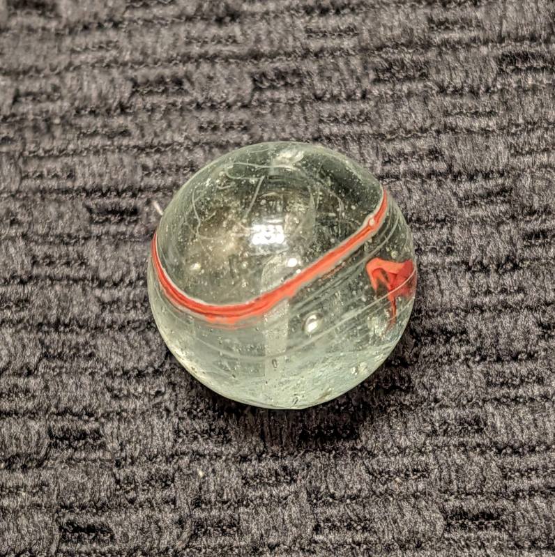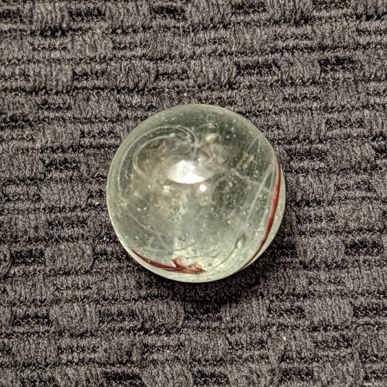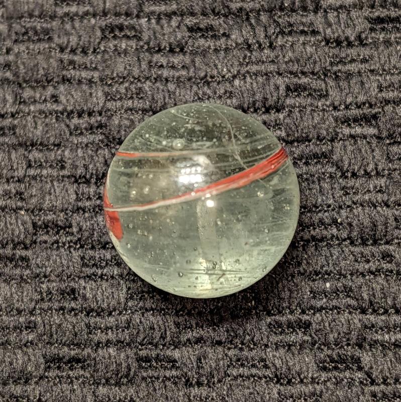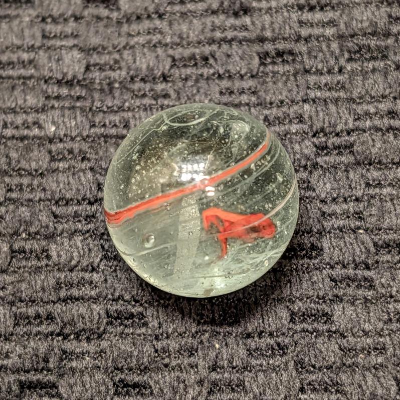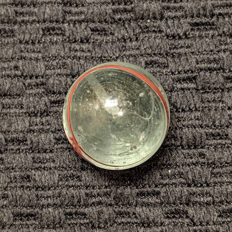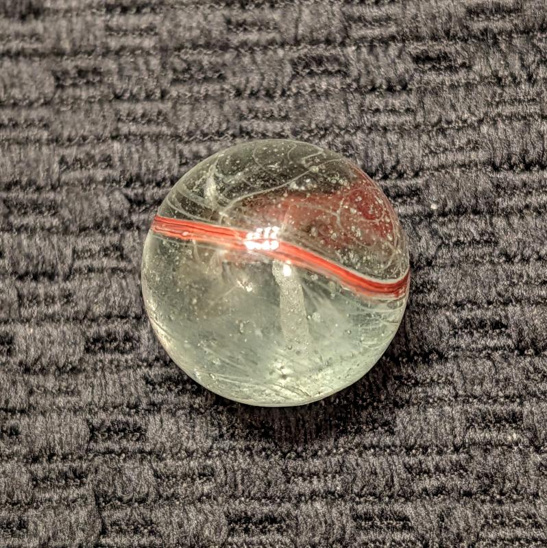 Rare 13/16″ Single Pontil Hand-Gathered Greiner w/ a Ring of Oxblood, Thin Wispy White Swirls Spinning and Twisting throughout the Clear Matrix & Ghost Core of Fine Bubbles rising up from the single pontil. Faceted Pontil and the type dates this to circa 1840-1860. Wet Mint Condition.