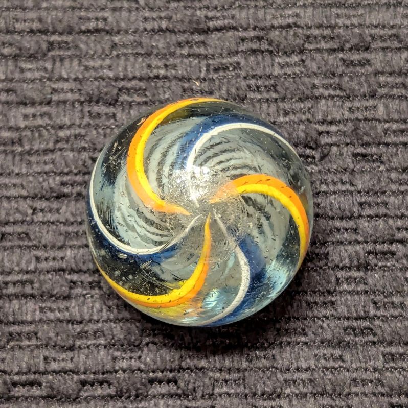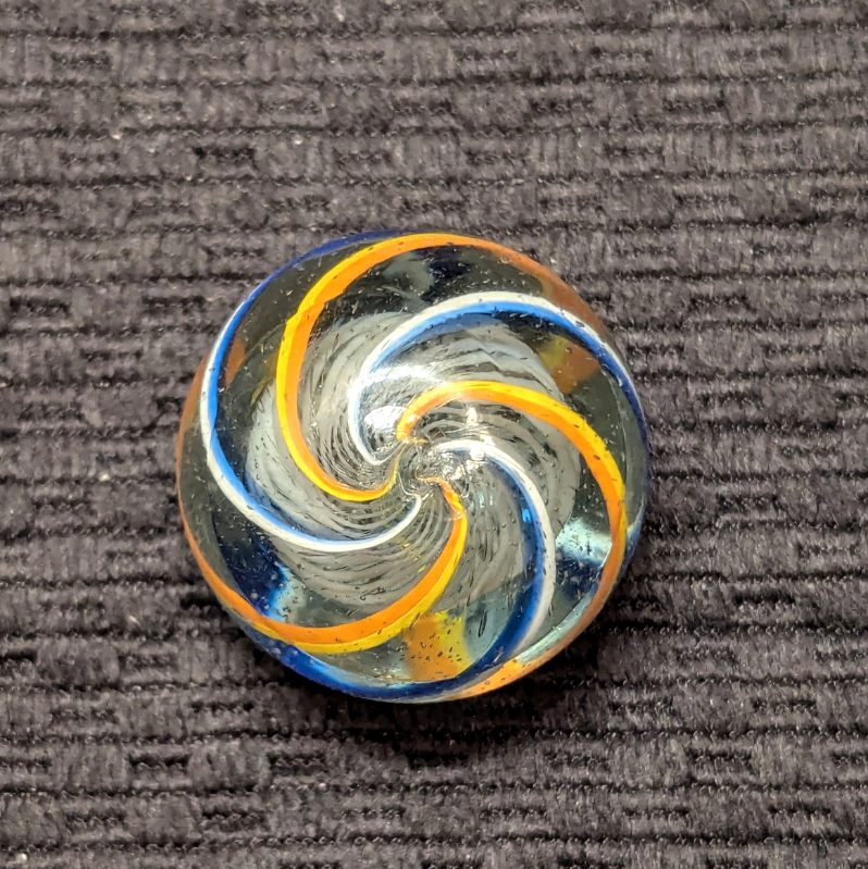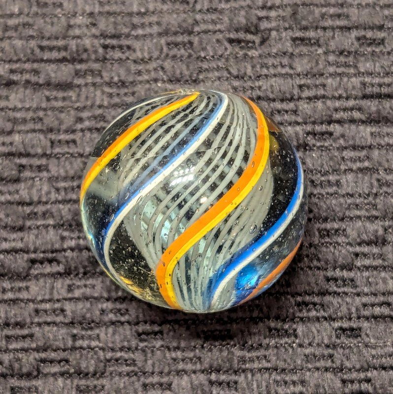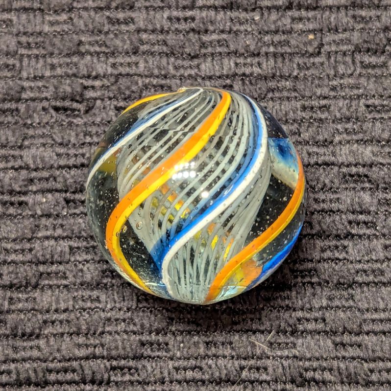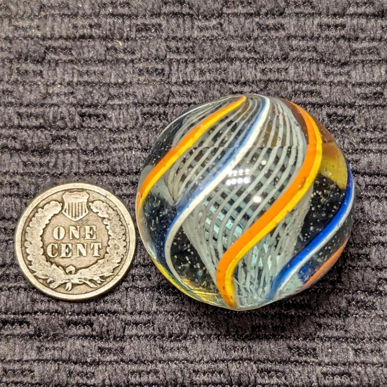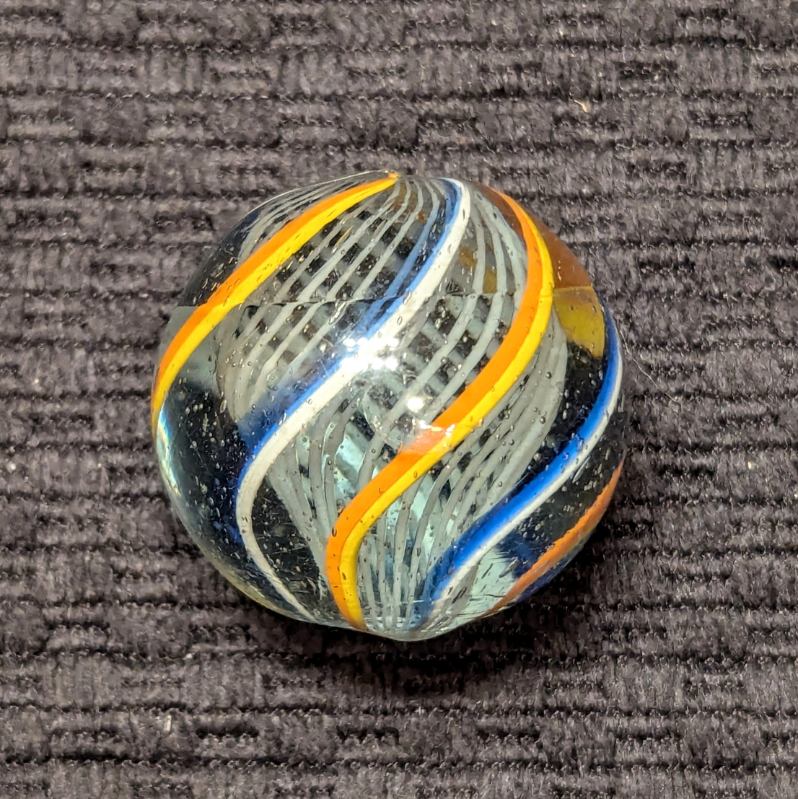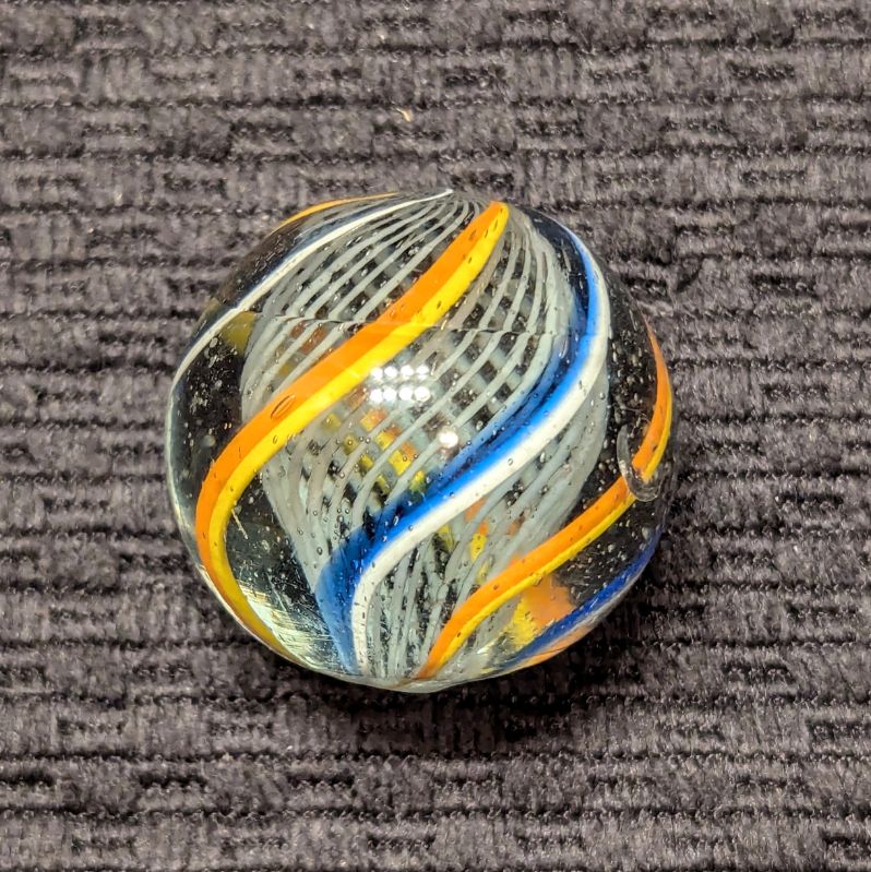 Large 1-1/4″ White Latticino w/ a Wide Well-Made Net Core. 6 outer evenly spaced Ribbons of alternating Blue/White & Orange/Yellow. One Sparkle on an otherwise wet mint original surface.