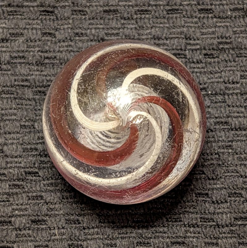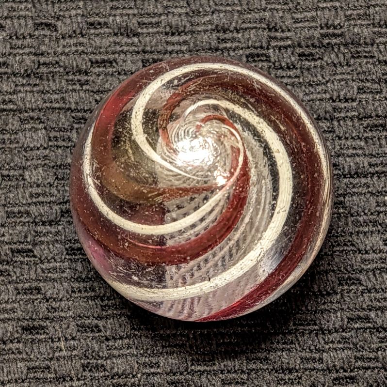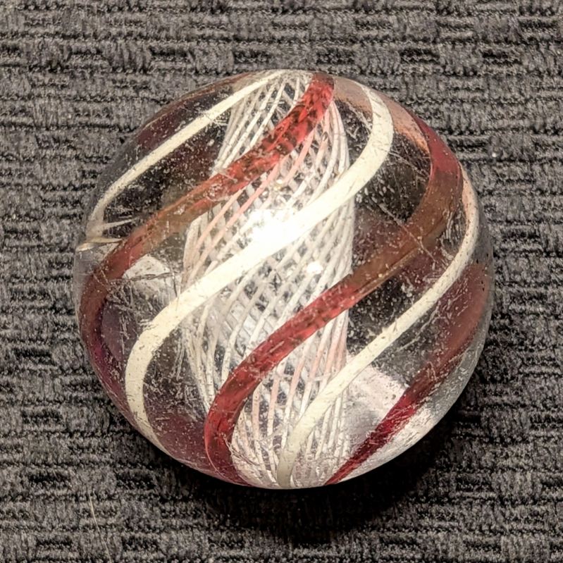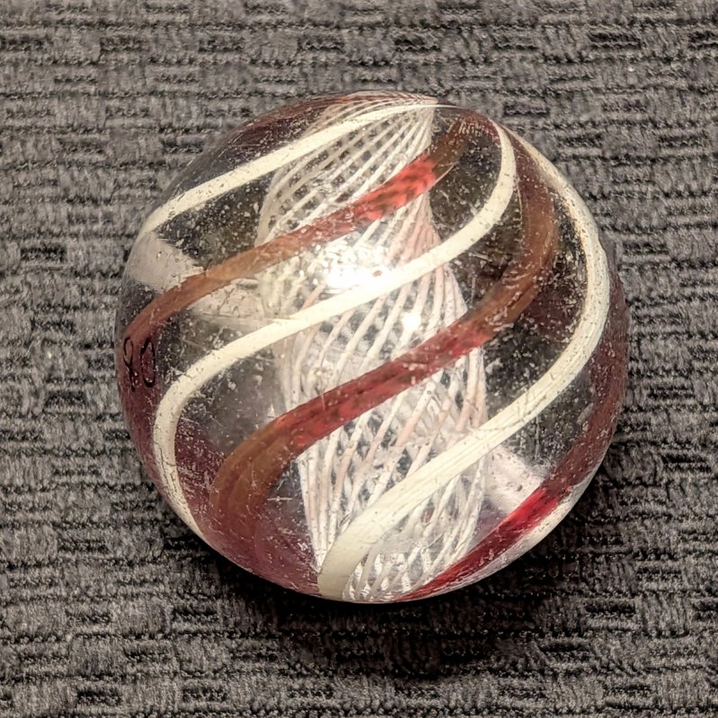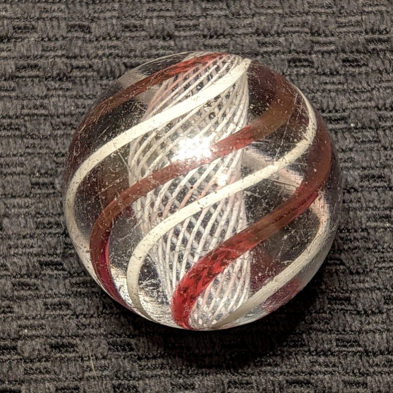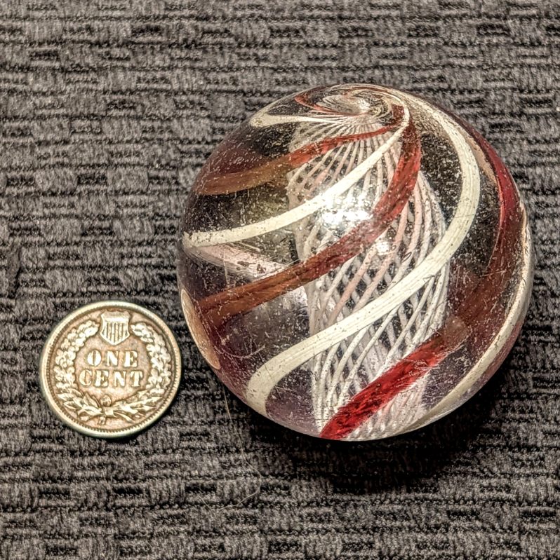 Large 1-13/16″ Very Well Made White Net-Like Latticino Core Swirl w/ Jelly Red & White Ribbons. Outstanding symmetry and visual appeal in this marble. Some scratches and light wear, that’s about it – no chips at all! Mint- original surface condition. Early faceted pontil dates this to circa 1850-1880. Coin not included.