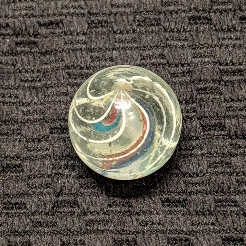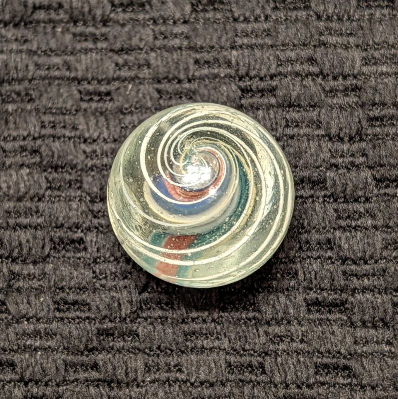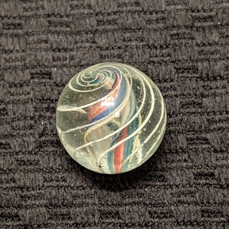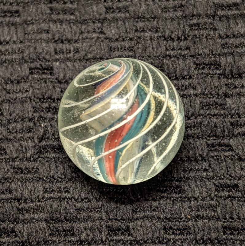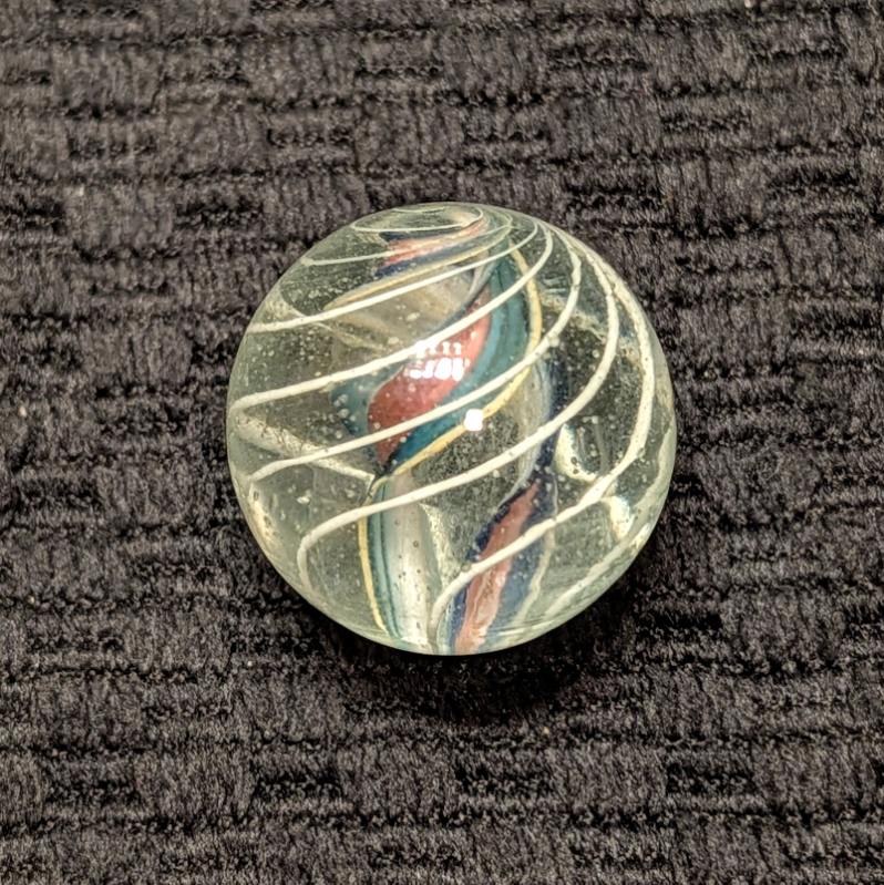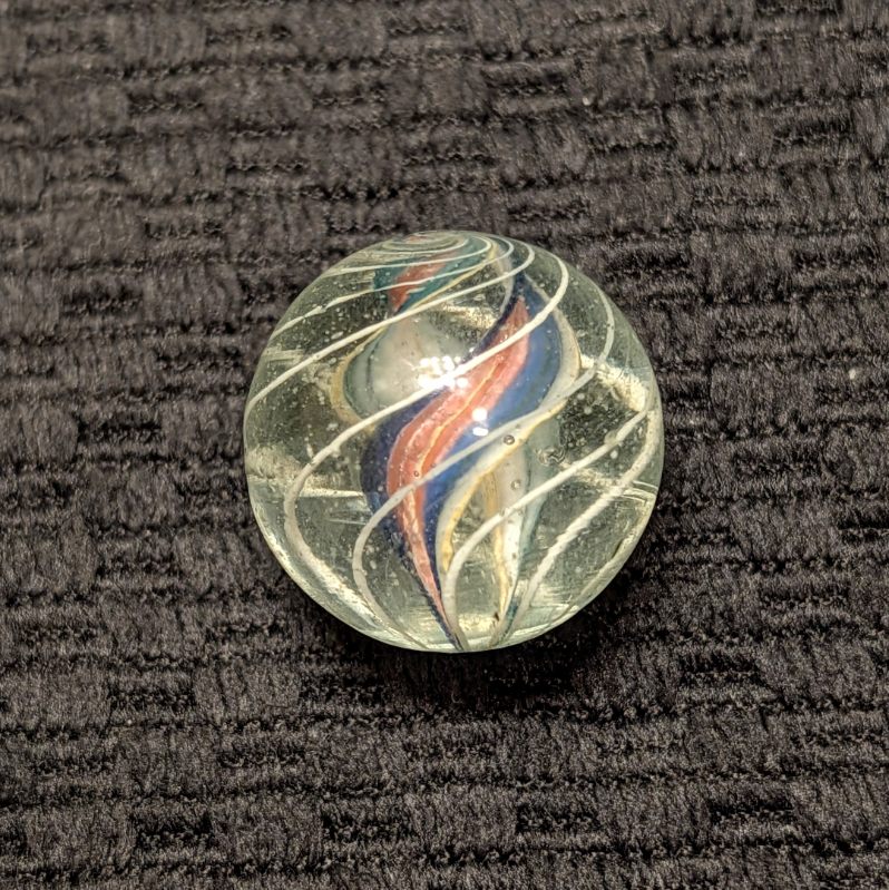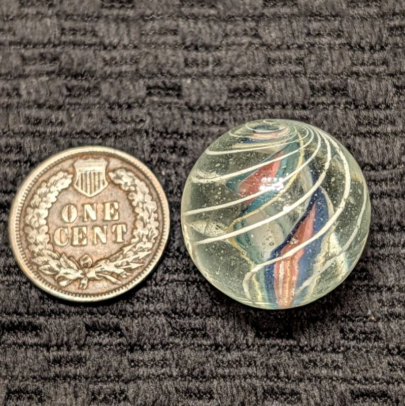 HTF 27/32″ Shooter Size Double Ribbon Swirl of Excellent Craftsmanship! White Ribbons – Central Red Stripe bordered by Blue trimmed in Yellow, and the other of Red bordered by Aqua trimmed with Yellow. White outer cage of perfectly symmetrically spaced white lines. Beautiful Early Period Marble w/ Faceted pontil, circa 1850-1880. MINT. Coin not included.