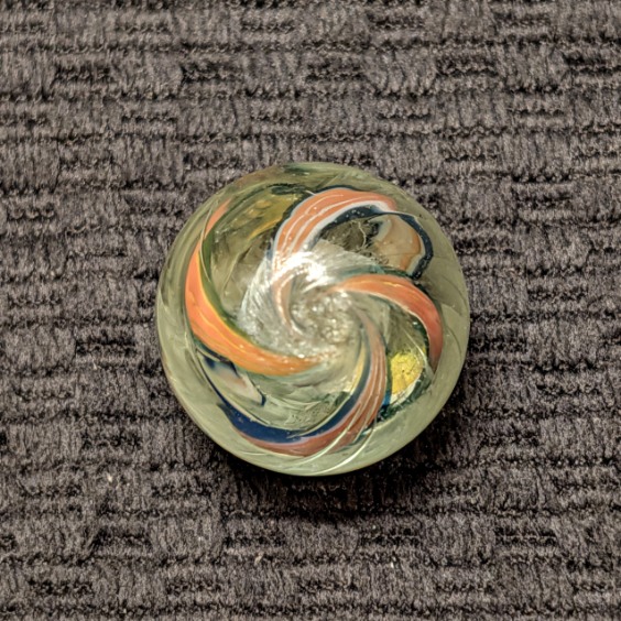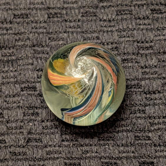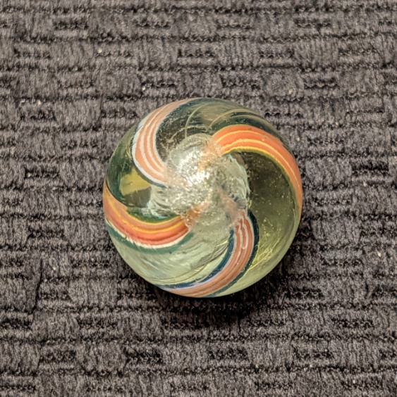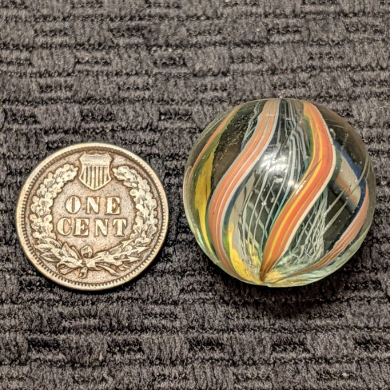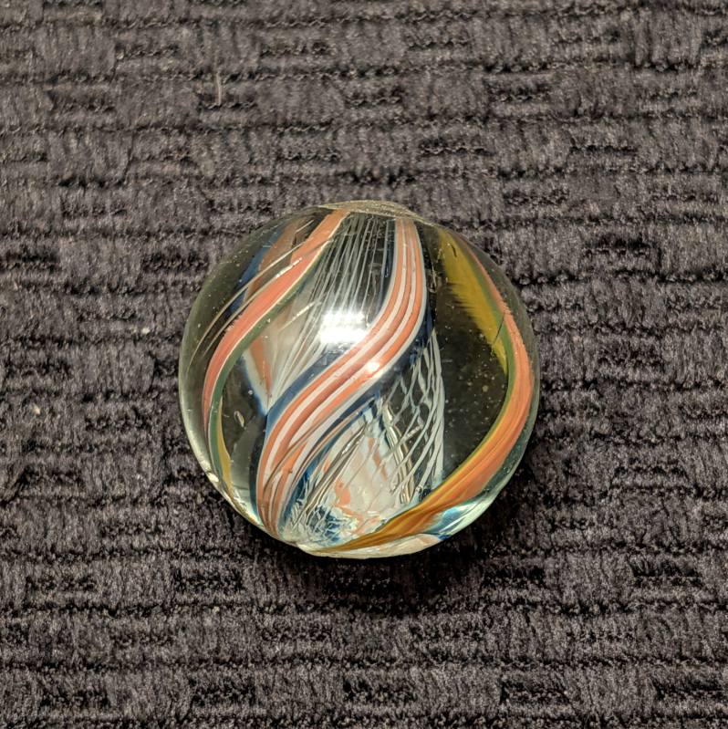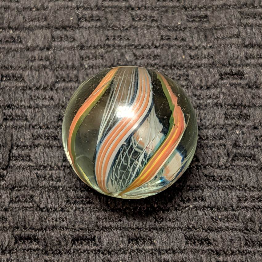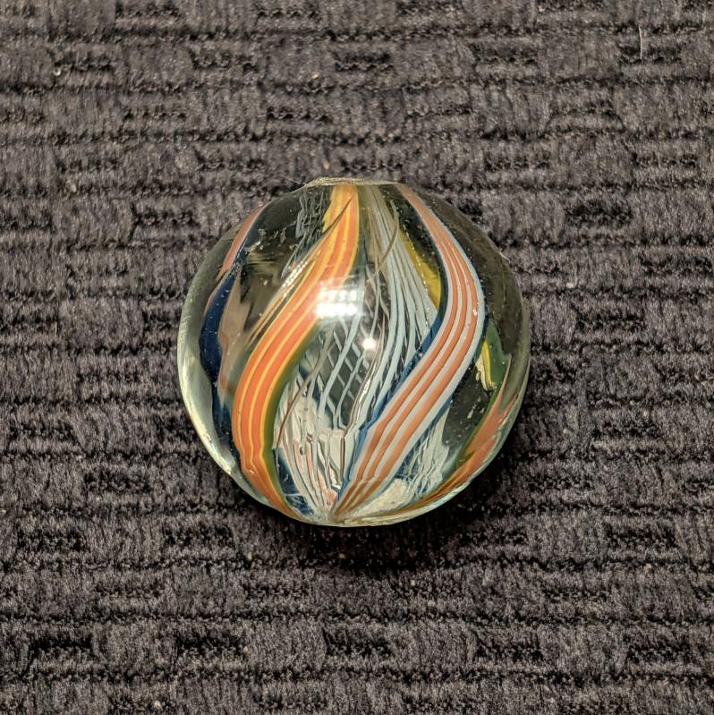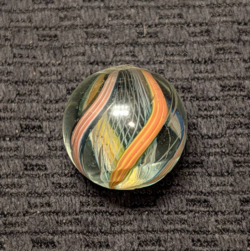 Large 7/8″ Latticino Core Swirl of Exceptional Craftsmanship w/ Colorful Wide Thin Finely Striped Razor Ribbons