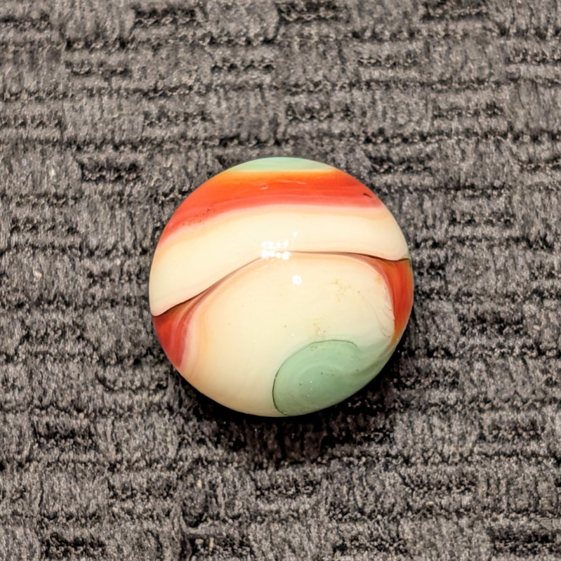 Uncommon Tri-Color AKRO Corkscrew of Red & Sea Foam Green over White that spins about 1-1/2 times. Corkscrew of multiple colors are getting harder and harder to come by. Wet Mint Original Surface.