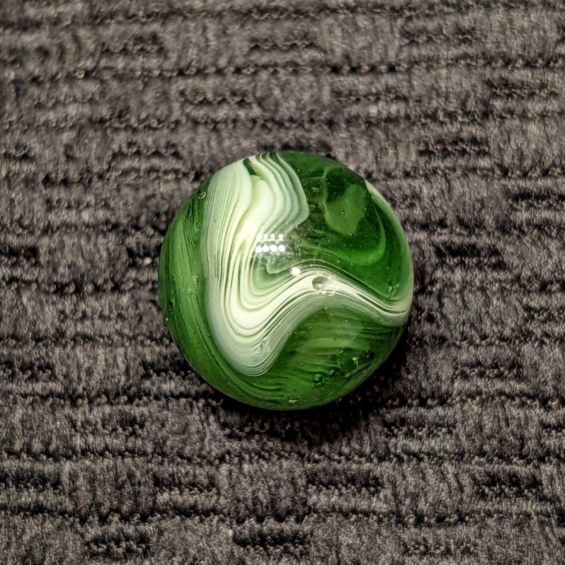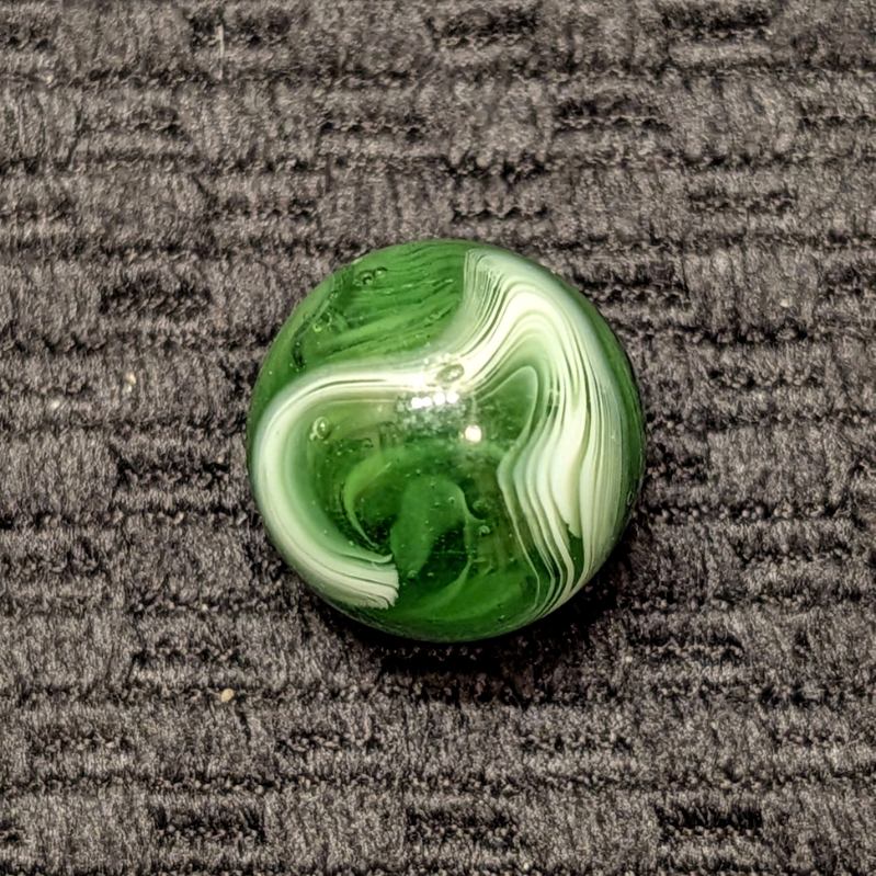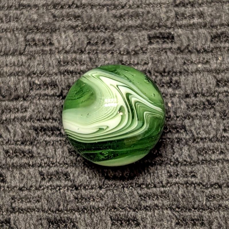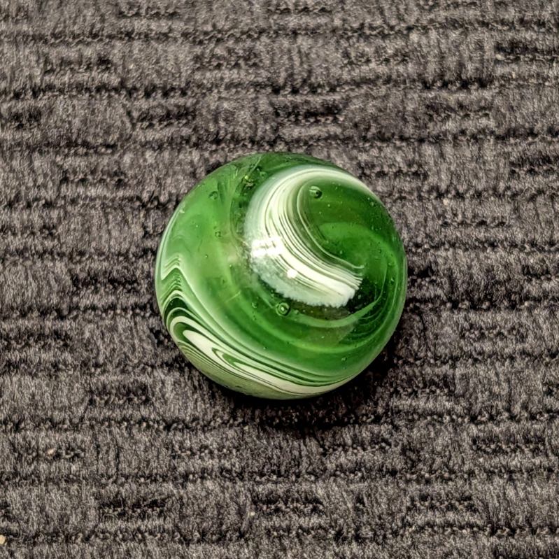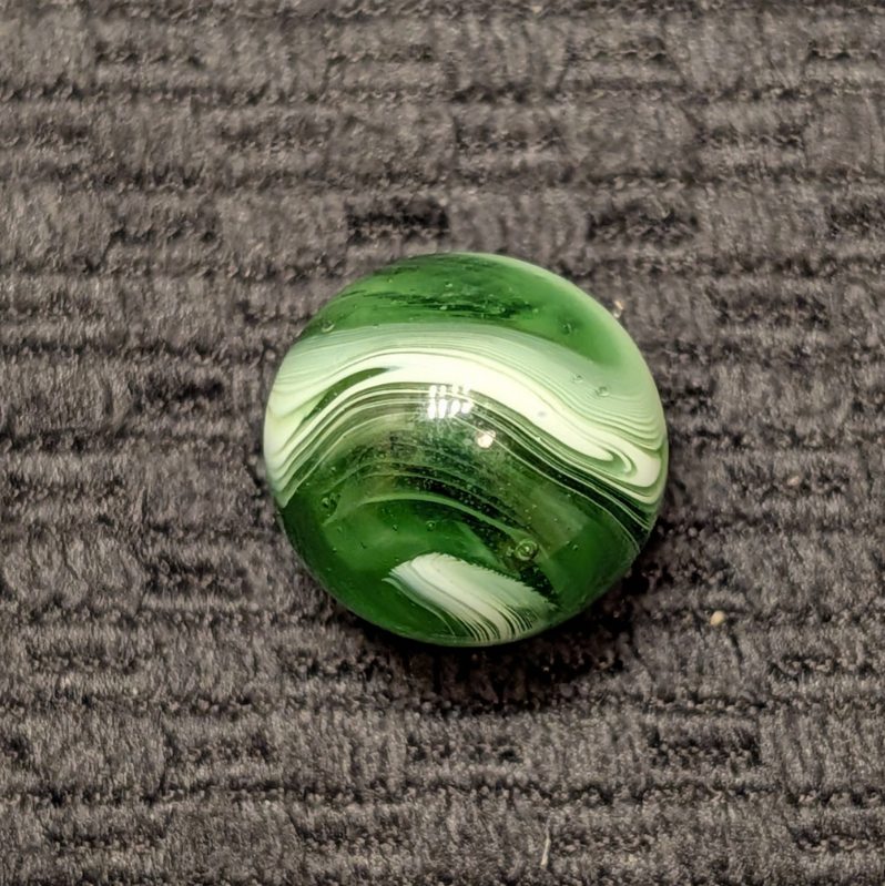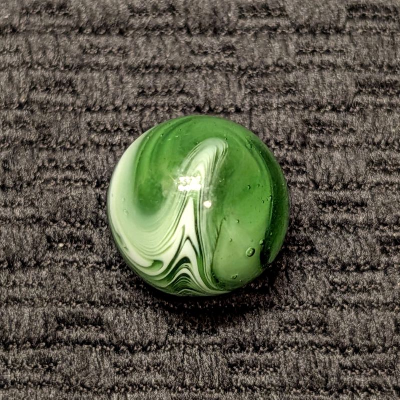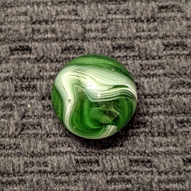 Forest Green Peltier Feathered Slag. Very nice pattern. Wet mint- original surface with a small barely noticeable as made bubble pop.