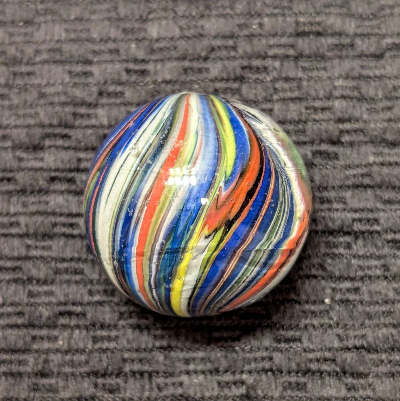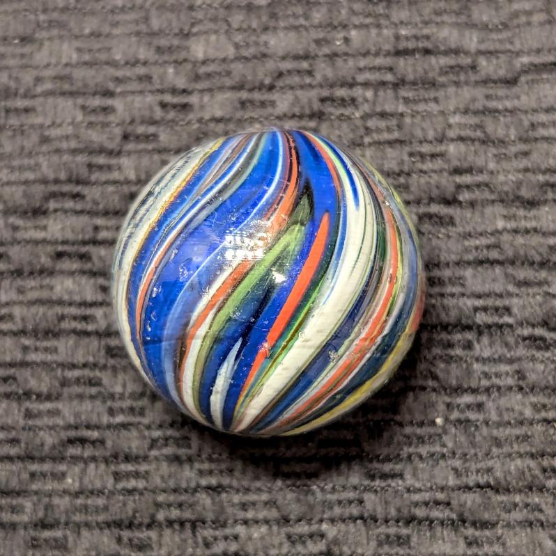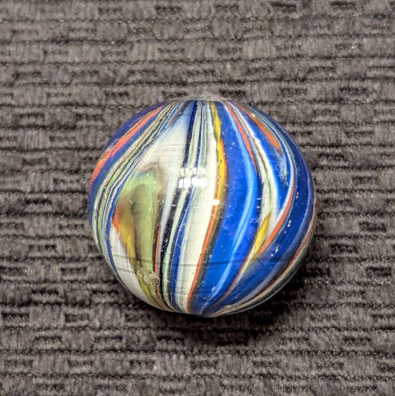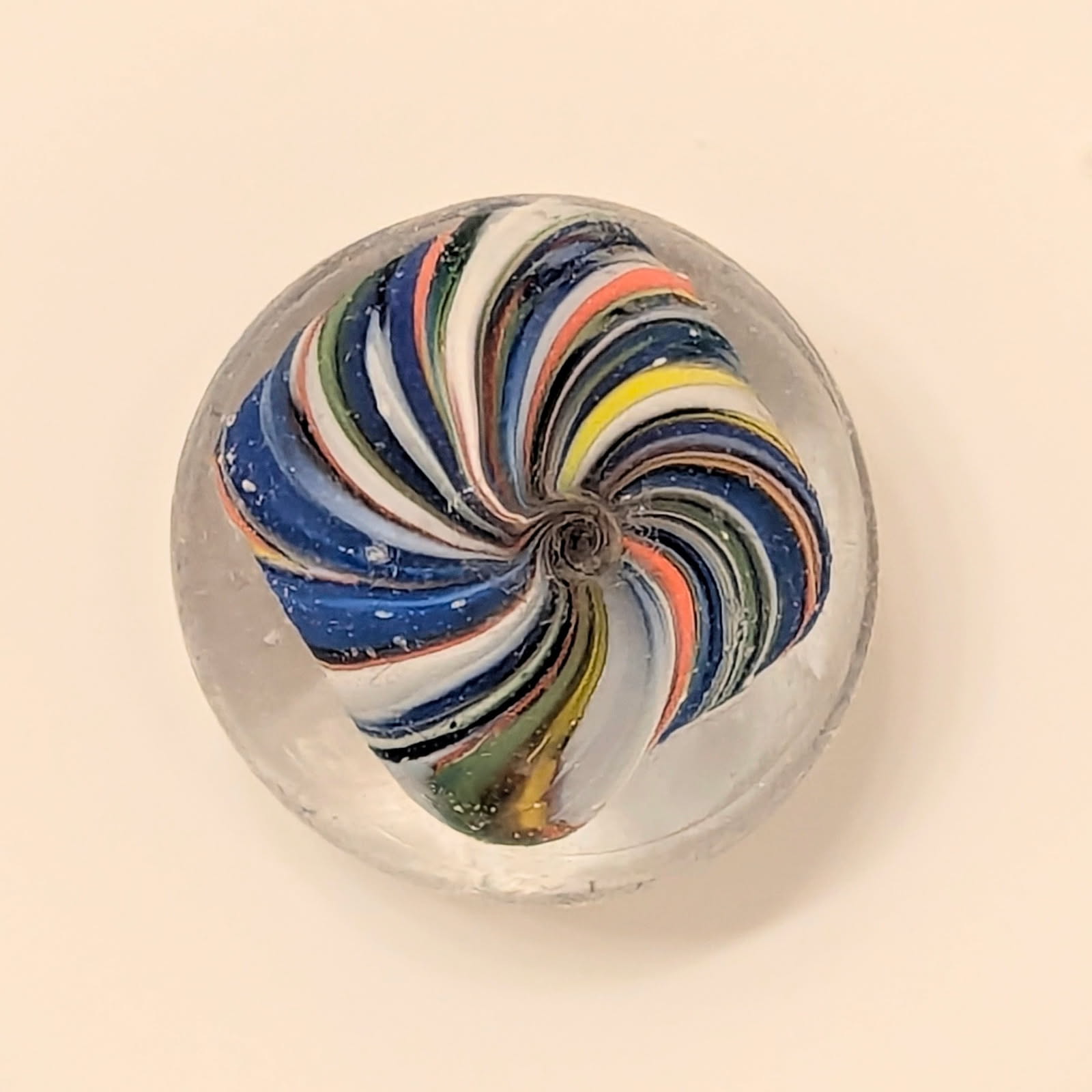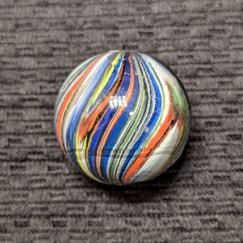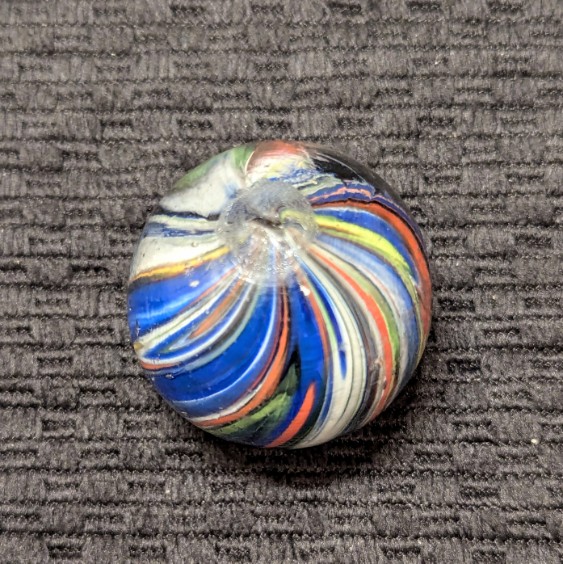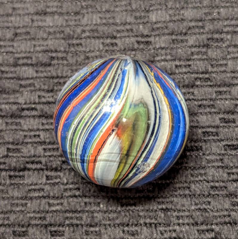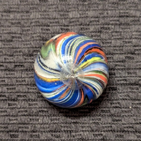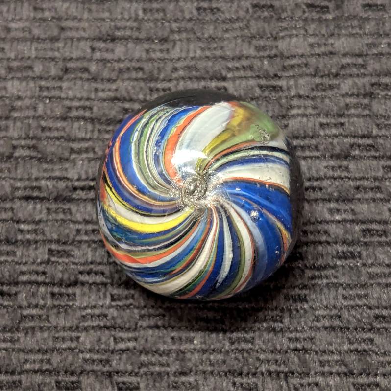 Huge 1-5/16″+ Multicolor Joseph’s Coat of Red, Yellow, Blue, Orange, White & Green – with Pointed Chevrons extending into the marble from each pontil. Absolutely fabulous pattern on this rare marble! This even appears to be slightly lobed (notice the clear glass on 4 sides when viewed from the pontil – shown underwater for optimal viewing in last photo). Shiny NM++ original surface gem with only a few scattered small pins. Coin not included.