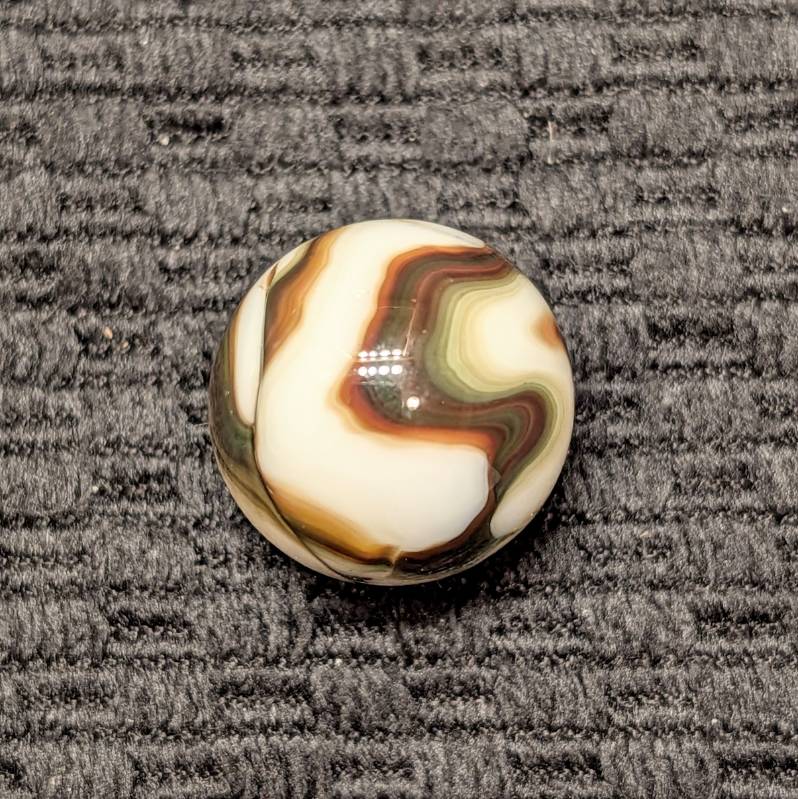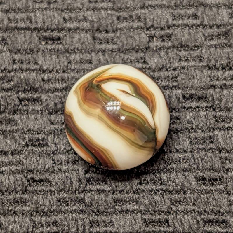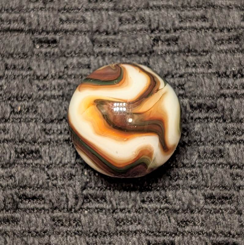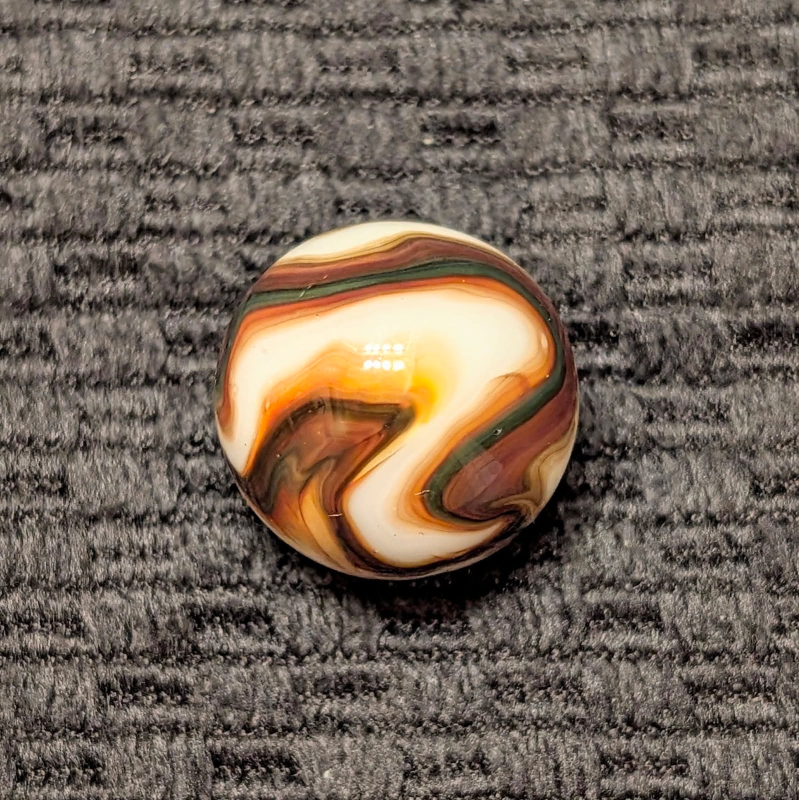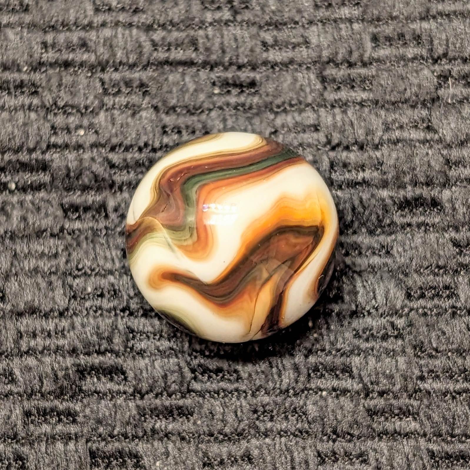 Outstanding Wet Mint Peltier Burnt Christmas Tree with AV that floats over the surface of both the green and red colors -(AV is hard to photograph but it’s NICE, shown in close-up Maglite photo #2) . Absolutely fabulous pattern and Burnt Red/Green and Orange. One of the best Miller Burnt Xmas Trees you’ll likely see, and I think they’re even bolder colors in hand than the pictures suggest. Wet Mint immaculate original surface. You’re going to absolutely LOVE this marble!