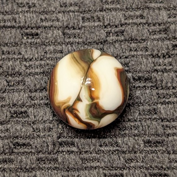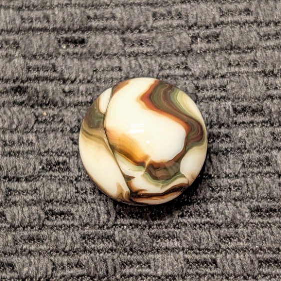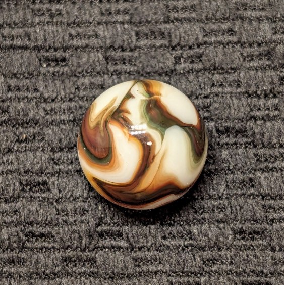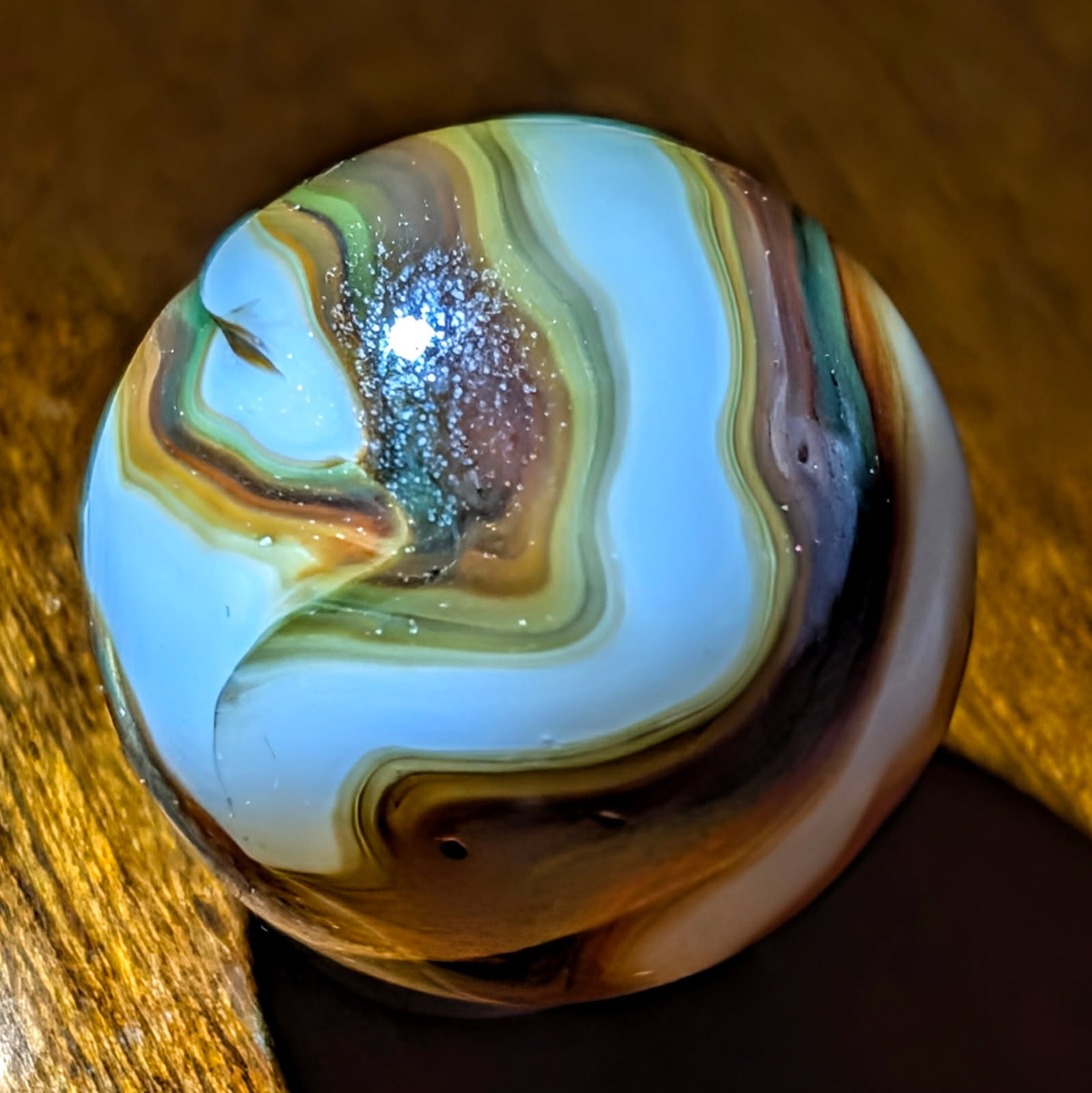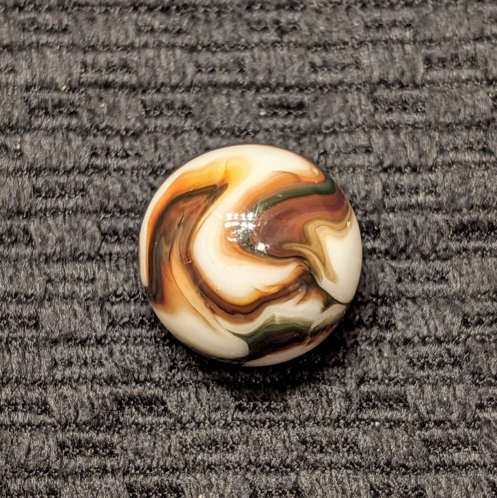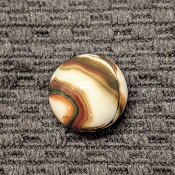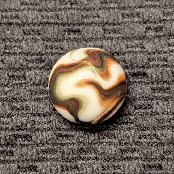 Outstanding Wet Mint Peltier Burnt Christmas Tree with AV that floats over the surface of both the green and red colors -(AV is hard to photograph but it’s NICE, shown in close-up Maglite photo #2) . Absolutely fabulous pattern and Burnt Red/Green and Orange. One of the best Miller Burnt Xmas Trees you’ll likely see, and I think they’re even bolder colors in hand than the pictures suggest. Wet Mint immaculate original surface. You’re going to absolutely LOVE this marble!