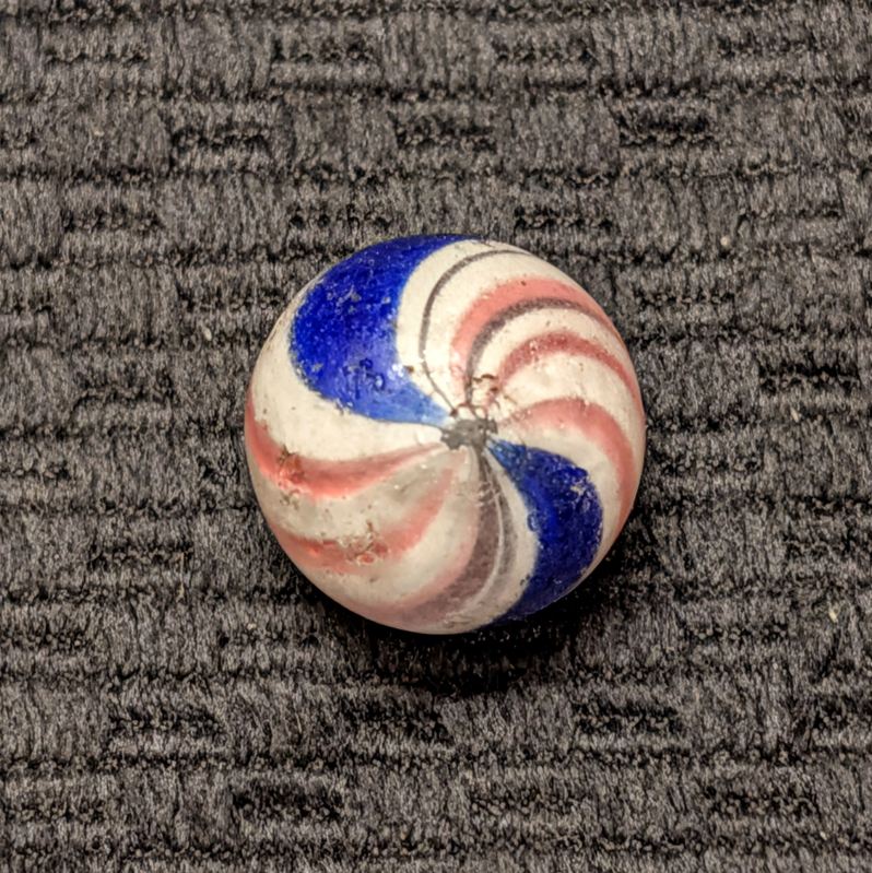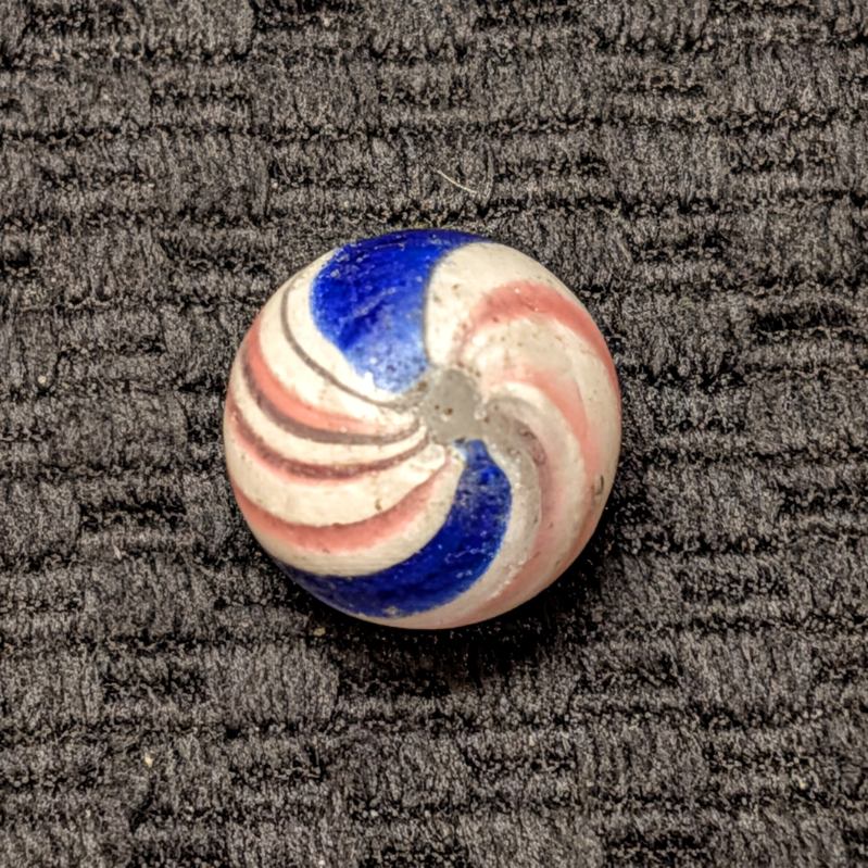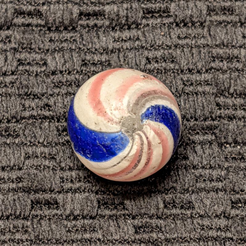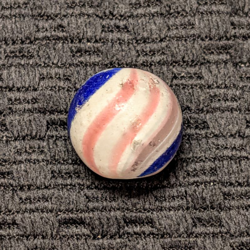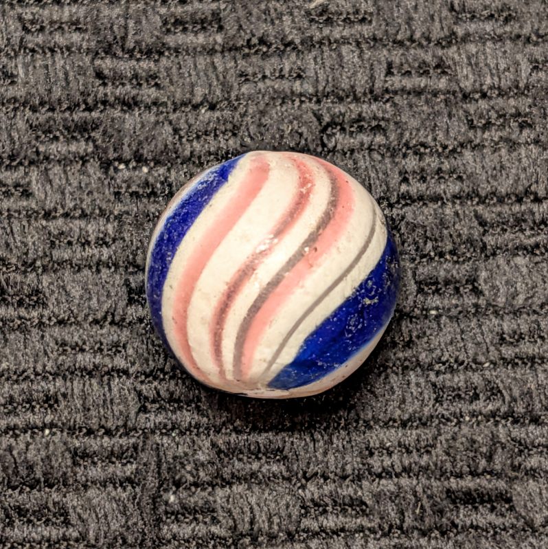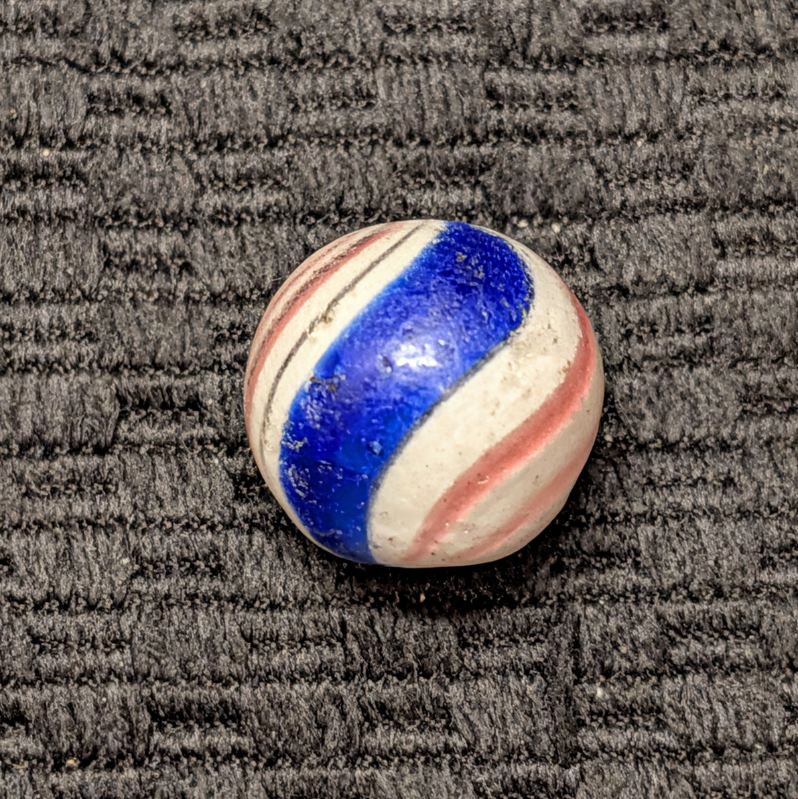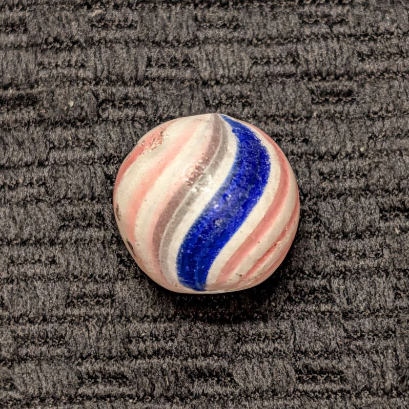 Peppermint with 2 sets of 3 red lines and 2 bold cobalt bands. Near Mint pocket wear, pins pricks and small flakes. A good solid example.