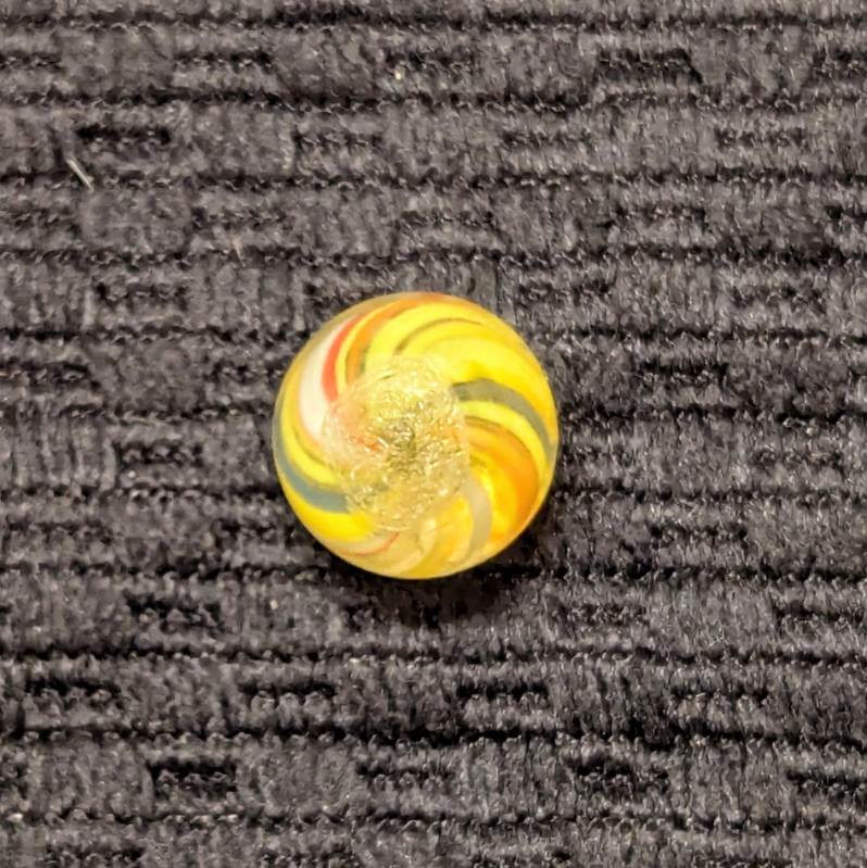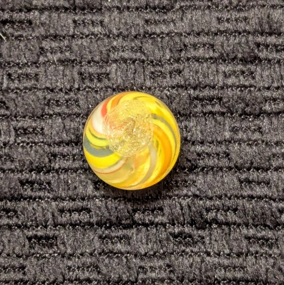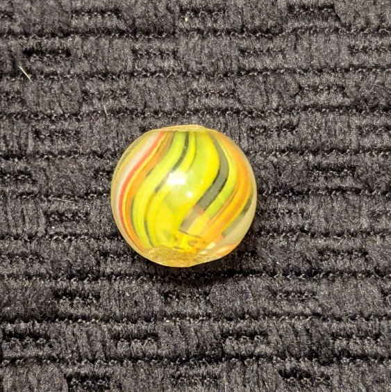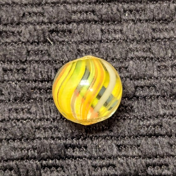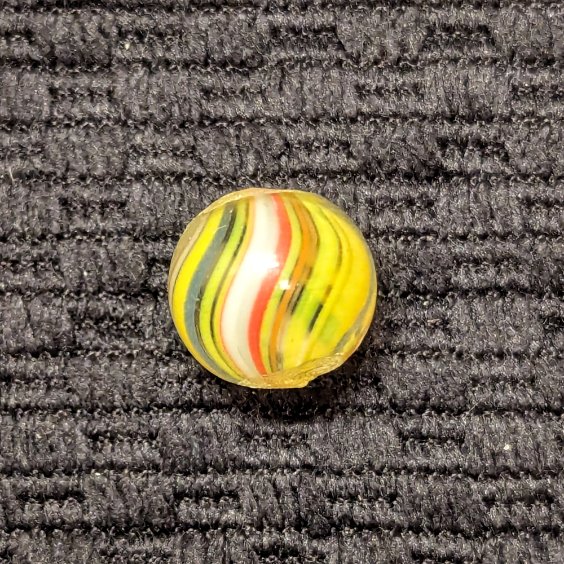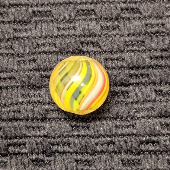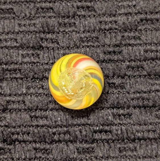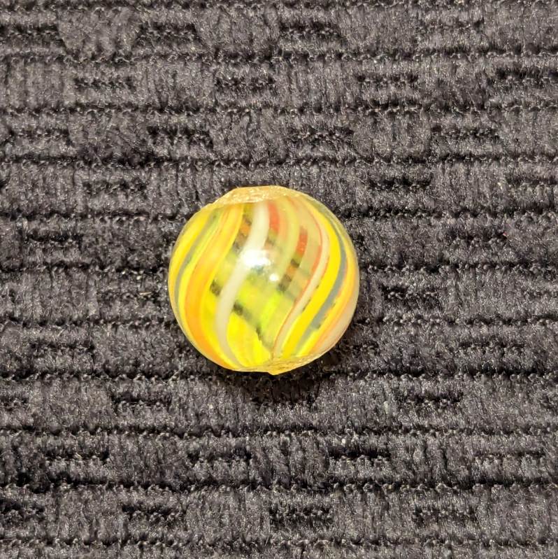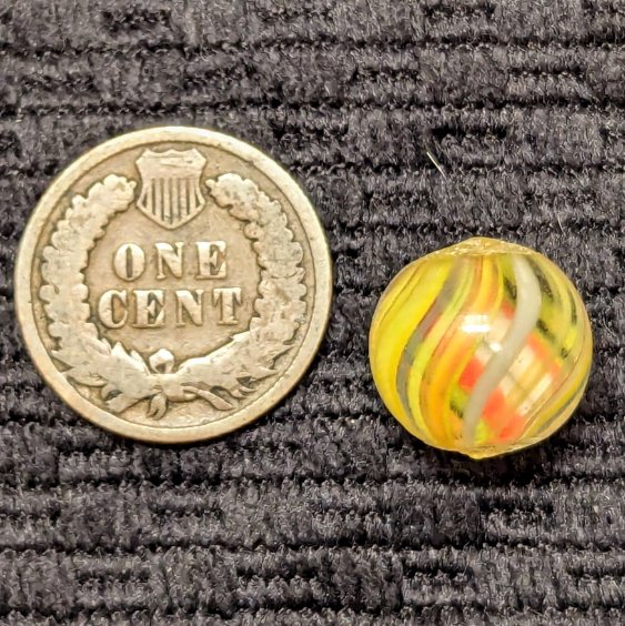 Bright 1/2″ Peewee Joseph’s Coat Swirl of Yellow, white, red, orange and blue! Wet mint original surface. Coin is for size comparison purposes, not included.