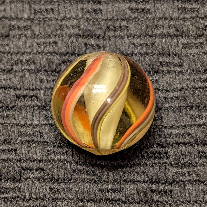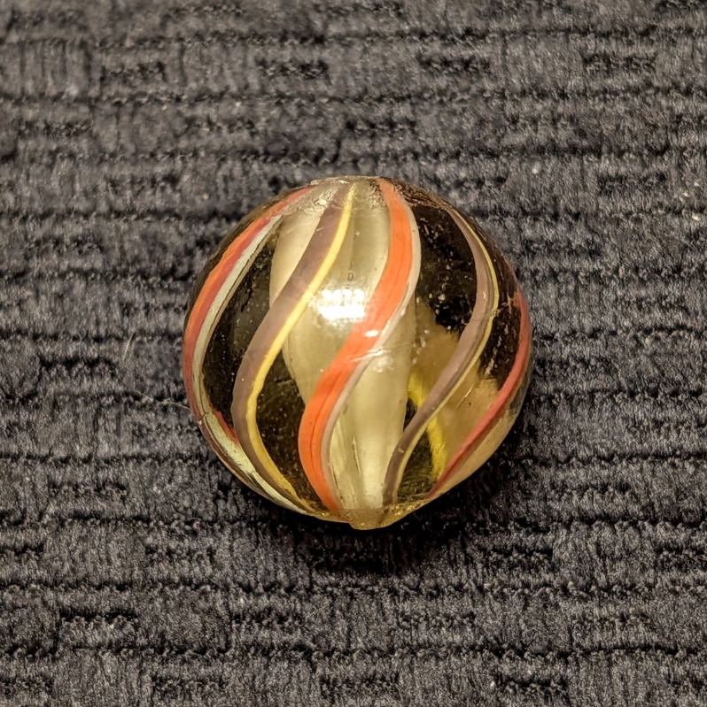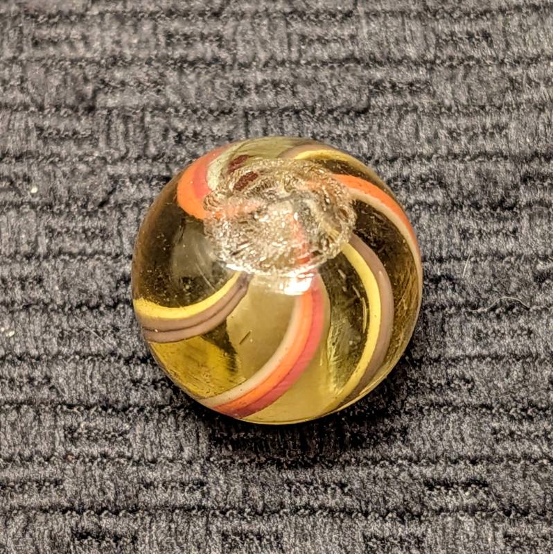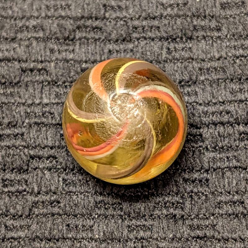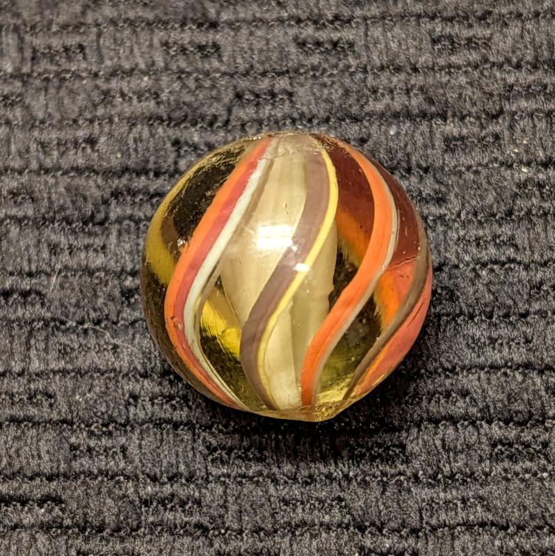 Shooter Size 3/4″+ Rare YELLOW GLASS Solid Core Swirl with a White Central Core and 6 Outer Ribbons of Purple-Yellow (uncommon) and Red-Orange-White. Swirls with well defined cores are rarely seen in colored glass! Wet Mint original surface.