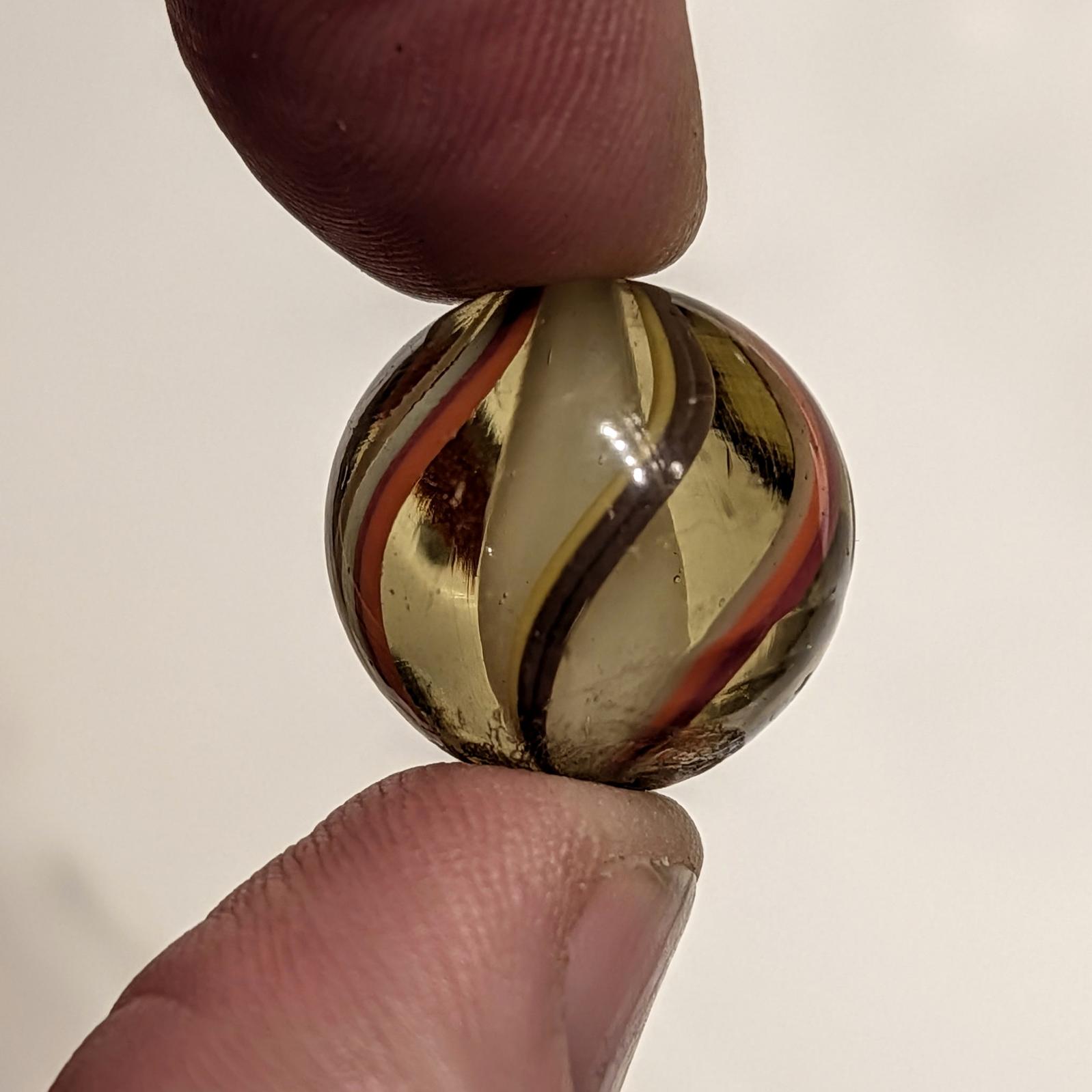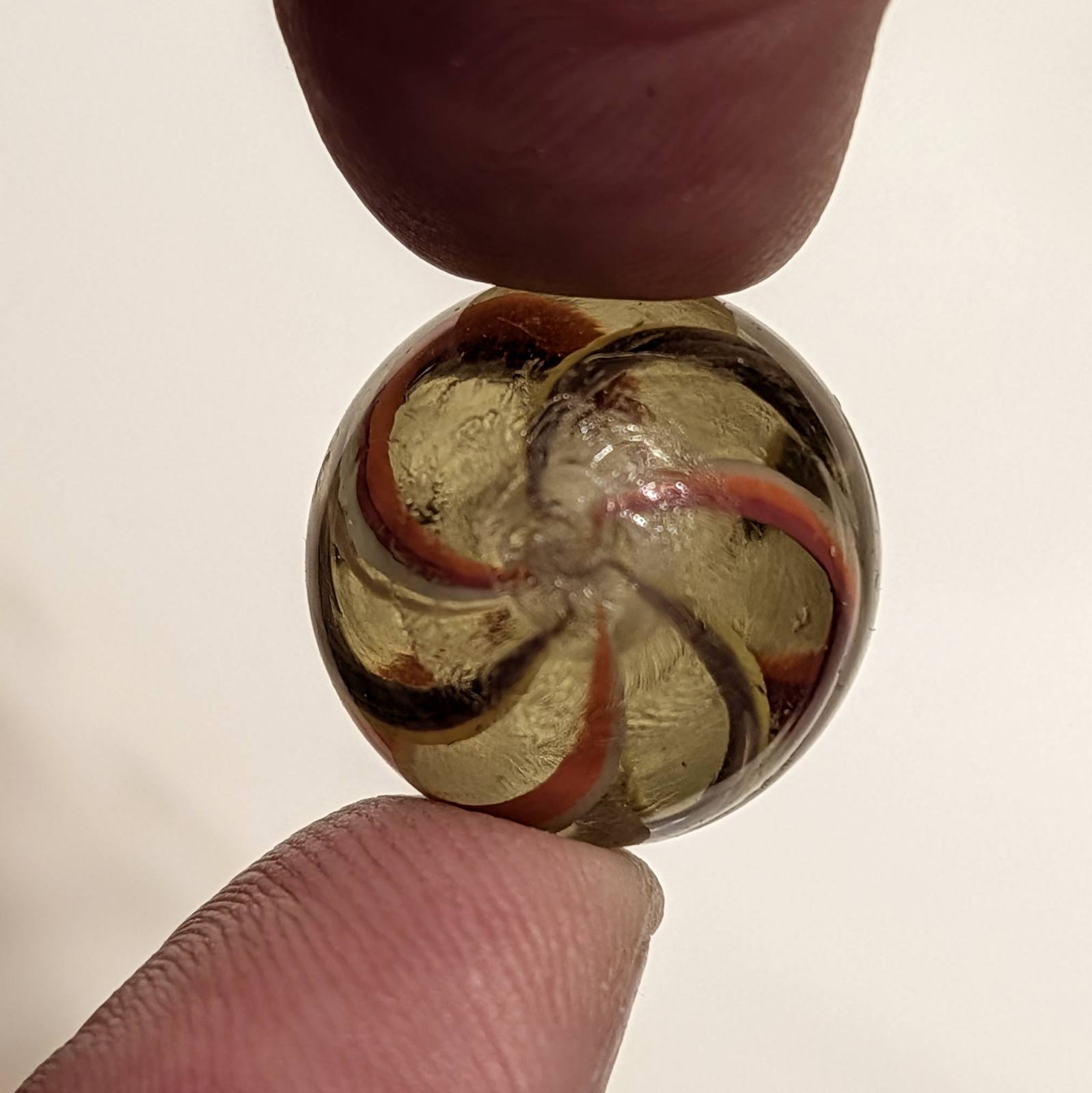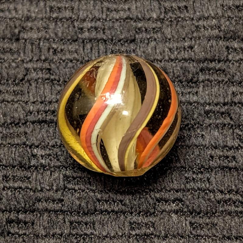 Shooter Size 3/4″+ Rare YELLOW GLASS Solid Core Swirl with a White Central Core and 6 Outer Ribbons of Purple-Yellow (uncommon) and Red-Orange-White. Swirls with well defined cores are rarely seen in colored glass! Wet Mint original surface.