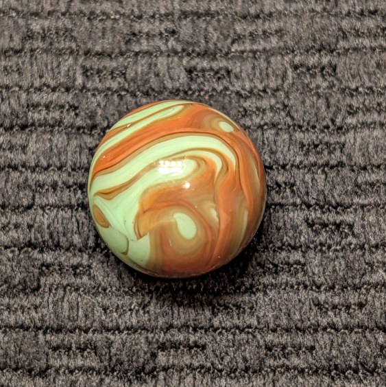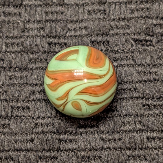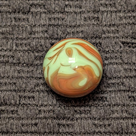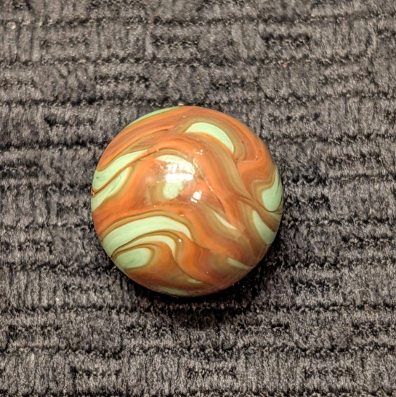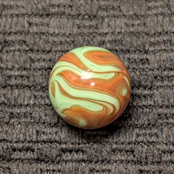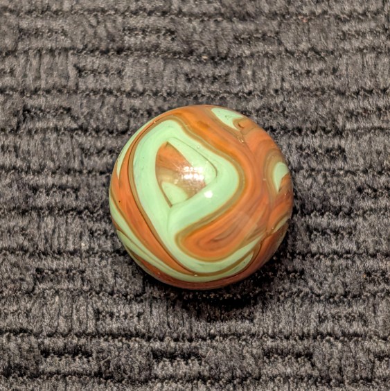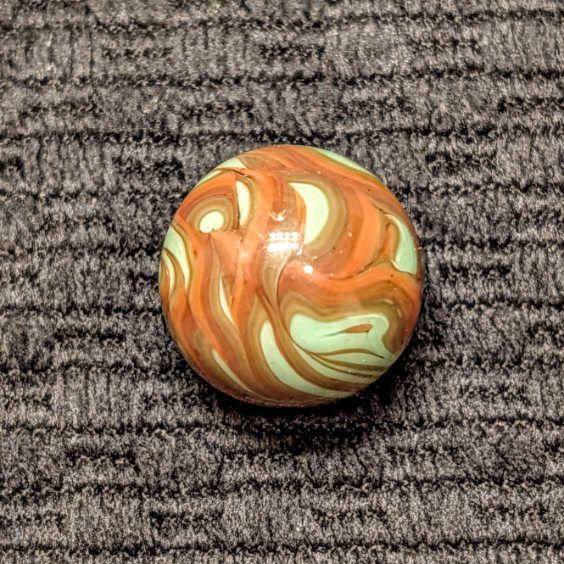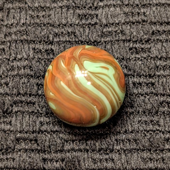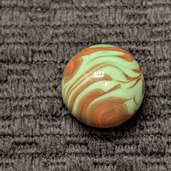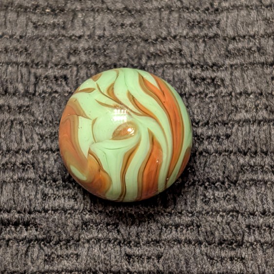 Rare & Pretty Christensen Flame of 4-distint Colors of Orange, Green, Brown and Burnt Orange swirls and flames. Mint- with a couple very minor sparkles.