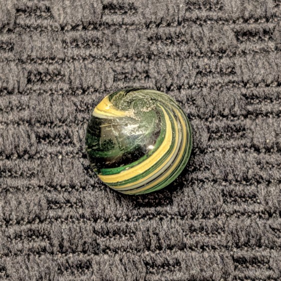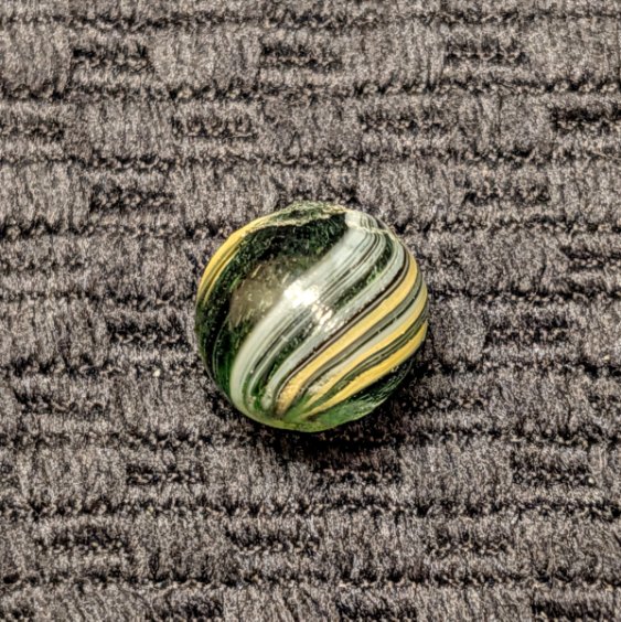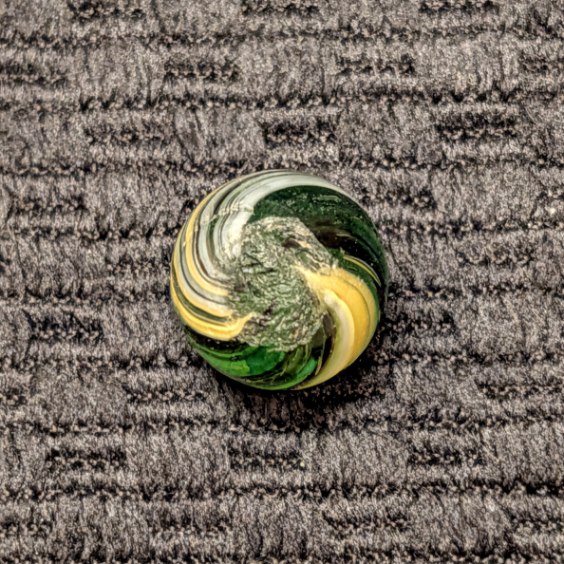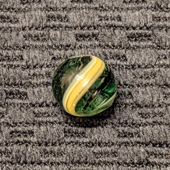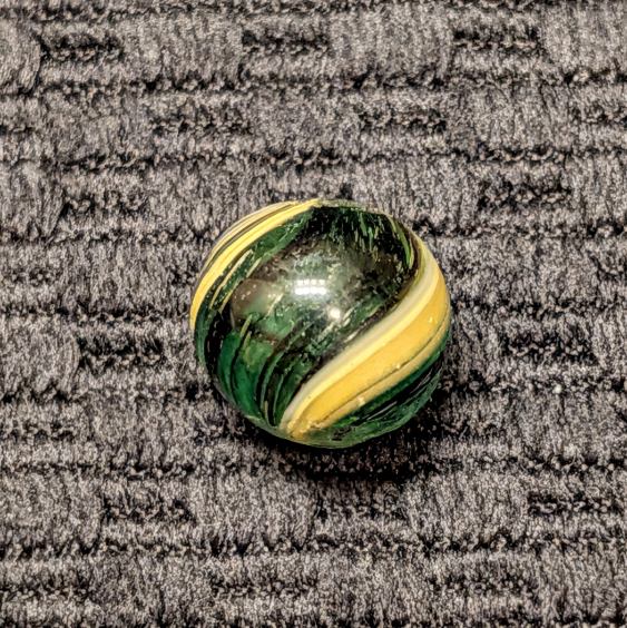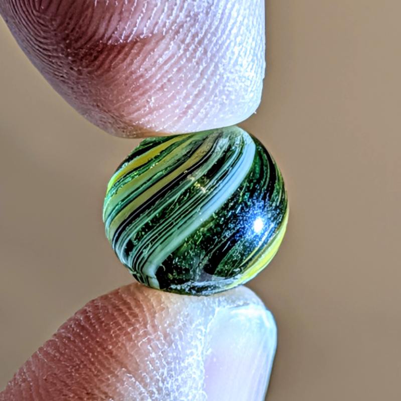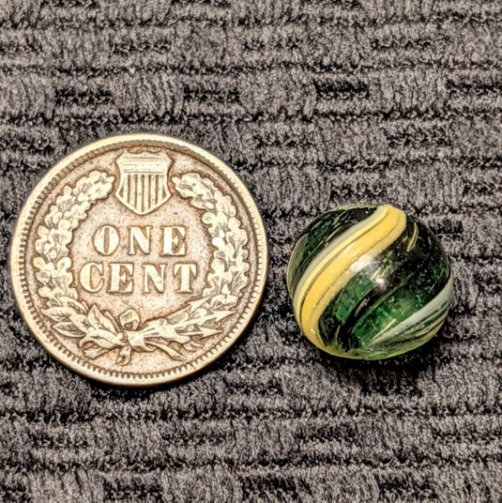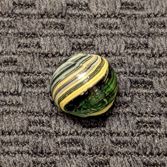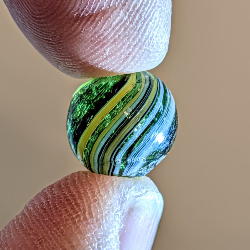 RARE Micro Peewee 7/16″+ Surface Banded Indian with Opposed Bands of Yellow & White over Colored Transparent Glass w/ Submarine Mist Green & Purple Bands. Wet Mint. Coin not included.