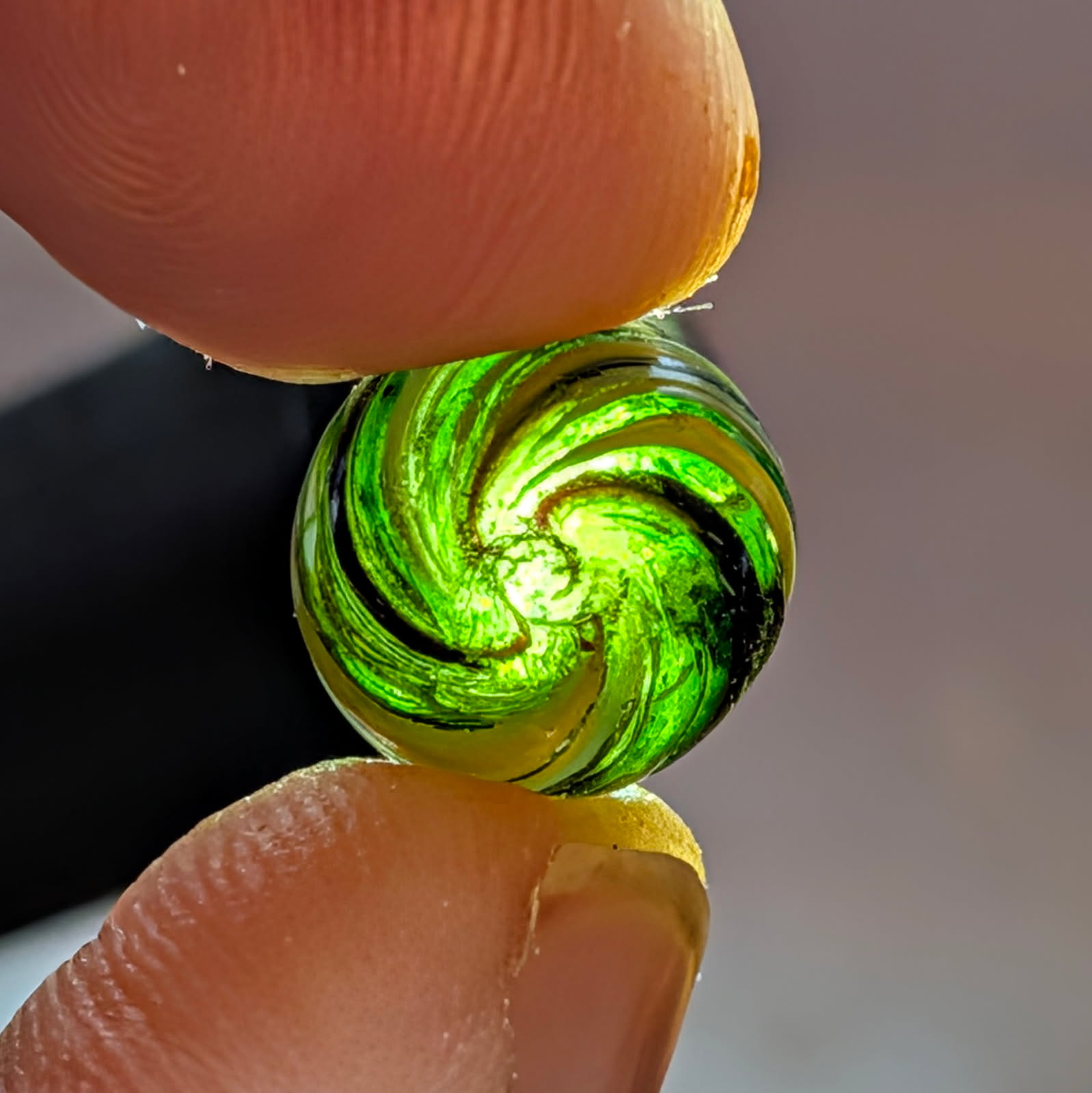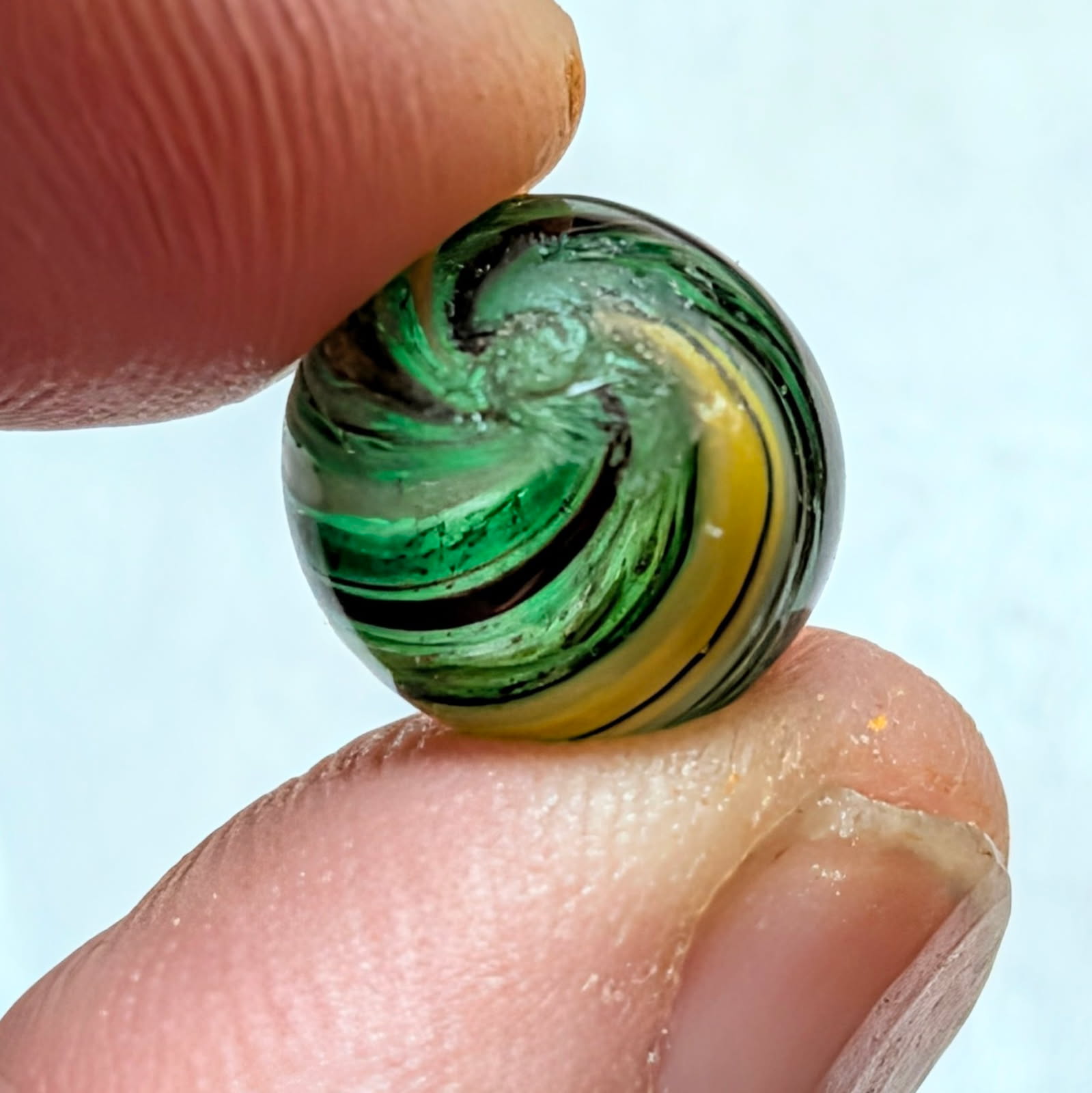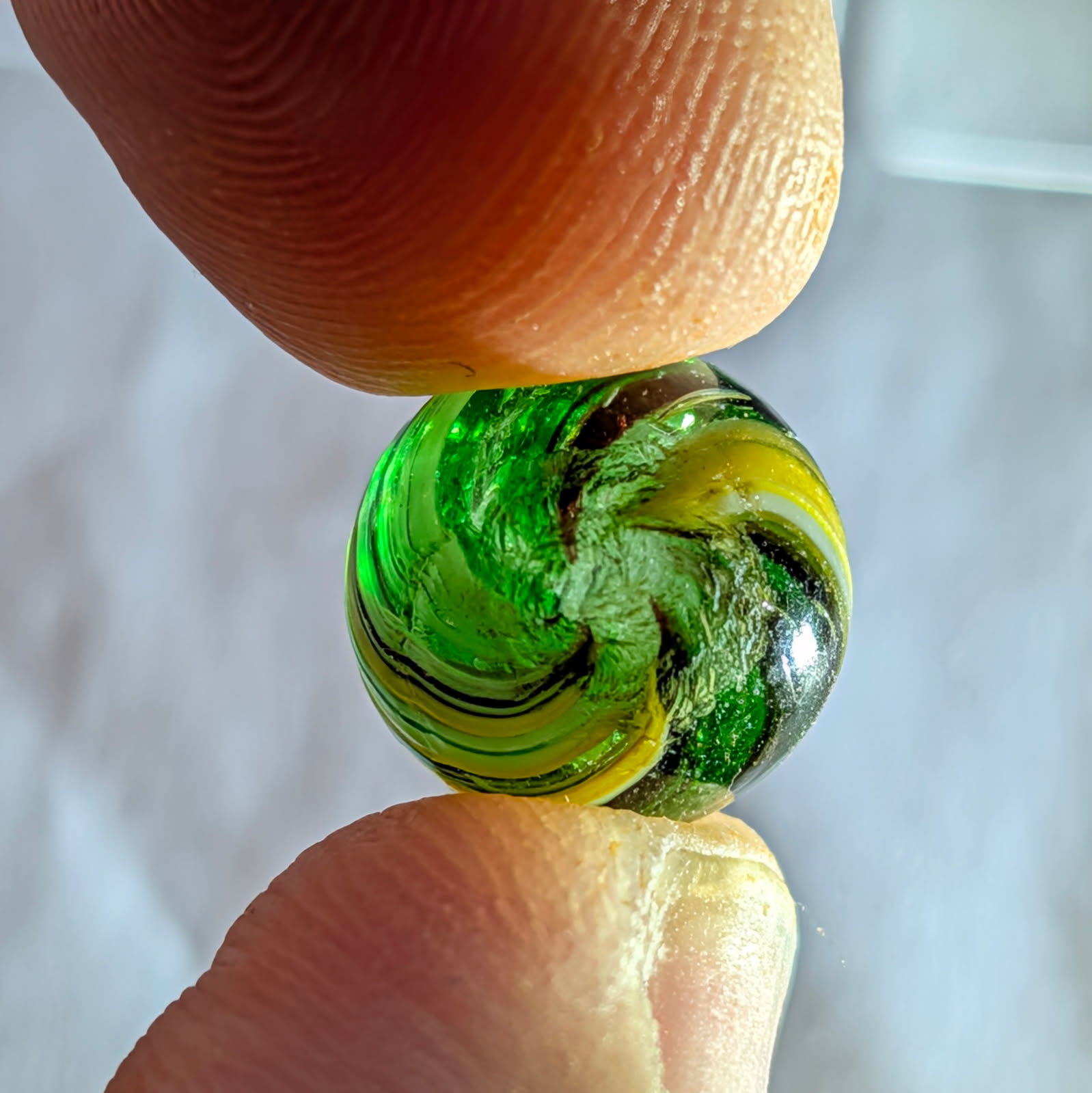 RARE Micro Peewee 7/16″+ Surface Banded Indian with Opposed Bands of Yellow & White over Colored Transparent Glass w/ Submarine Mist Green & Purple Bands. Wet Mint. Coin not included.