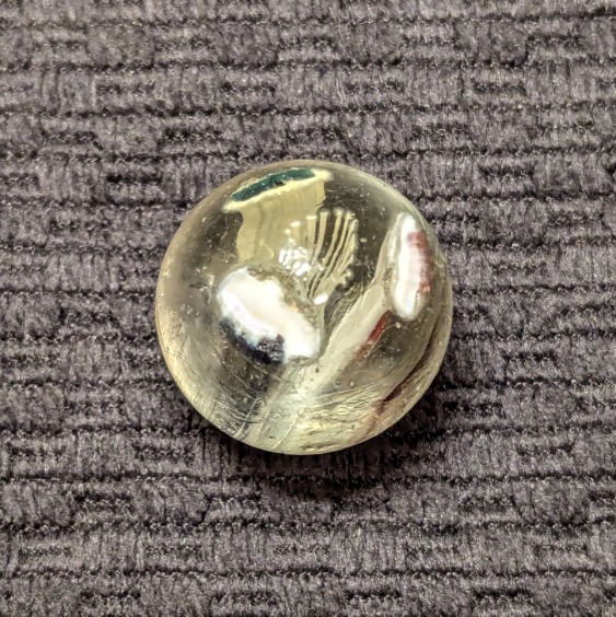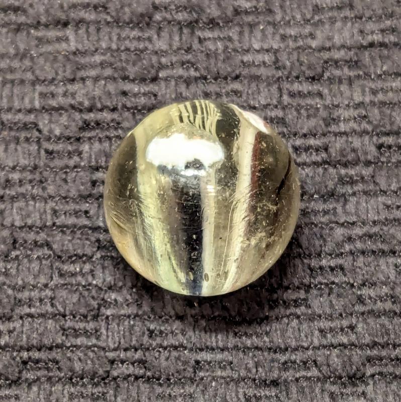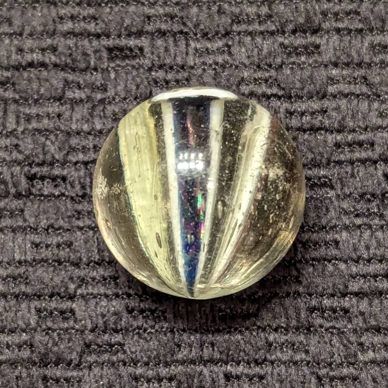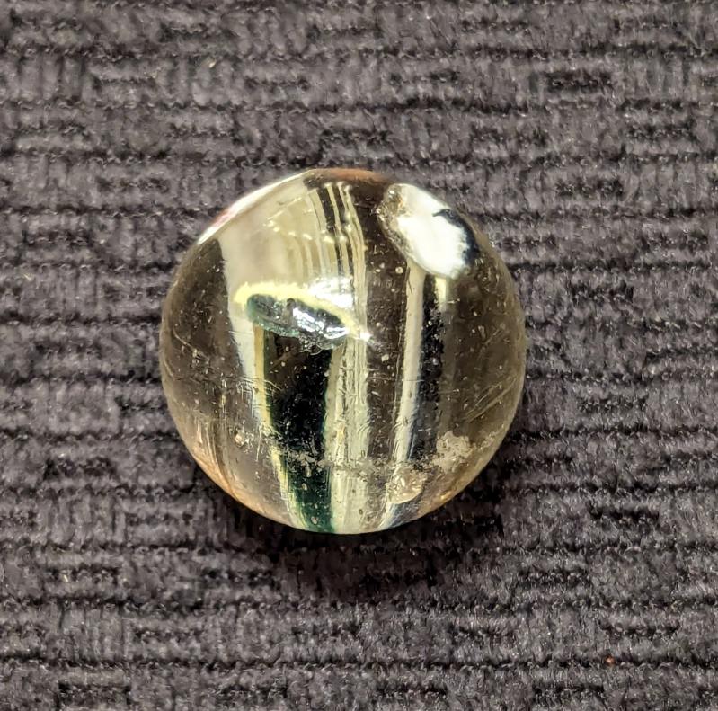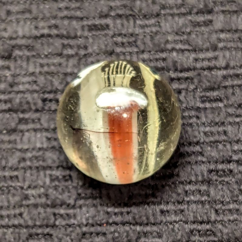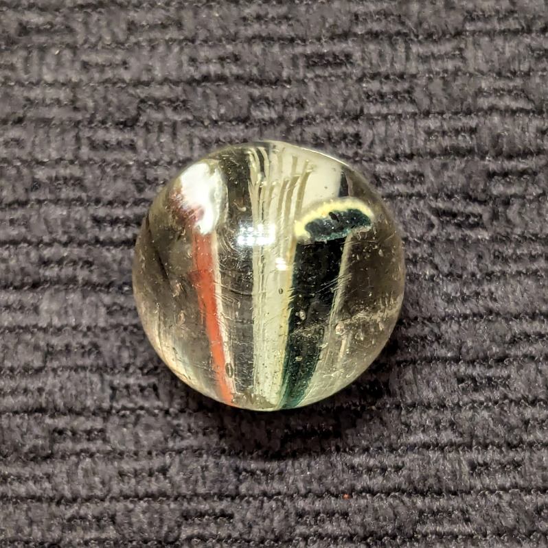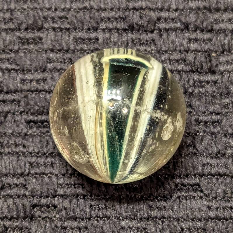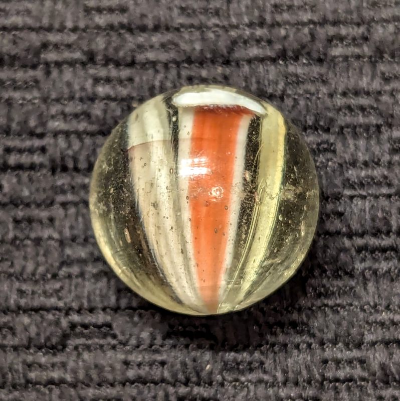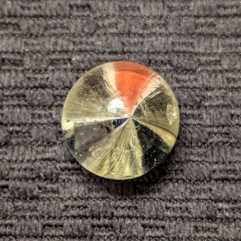 Rare 7/8″ First-Off-Cane Latticino Swirl with the core and 3 outer ribbons (jelly blue over white, jelly red over white, and jelly forest green over yellow) splaying apart from the single faceted pontil and coming to the surface on the opposite end. Mint- with 2 bubble pops. Circa 1850-1880.