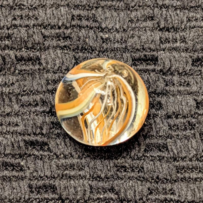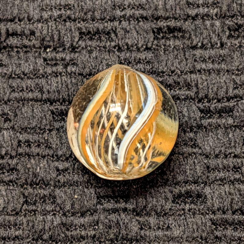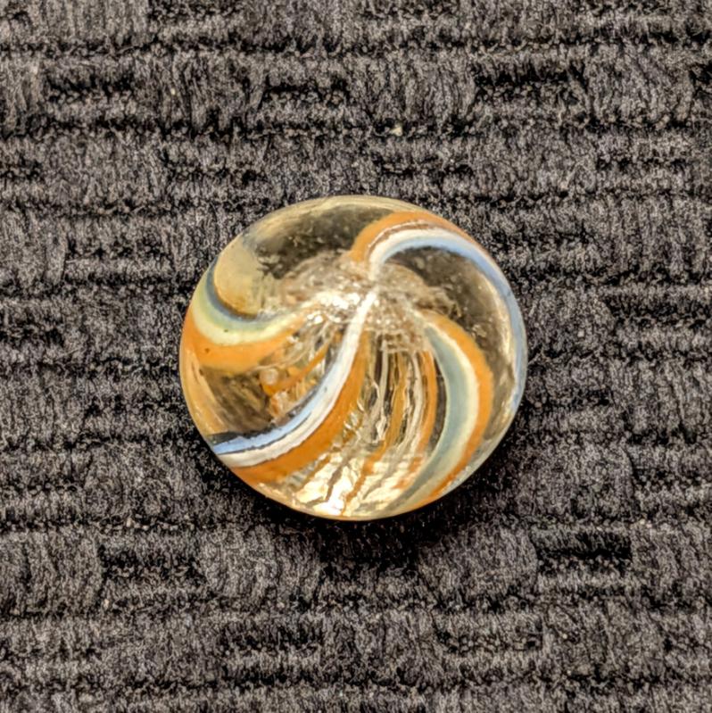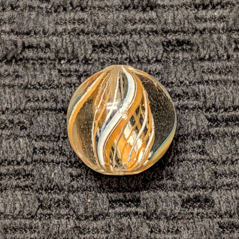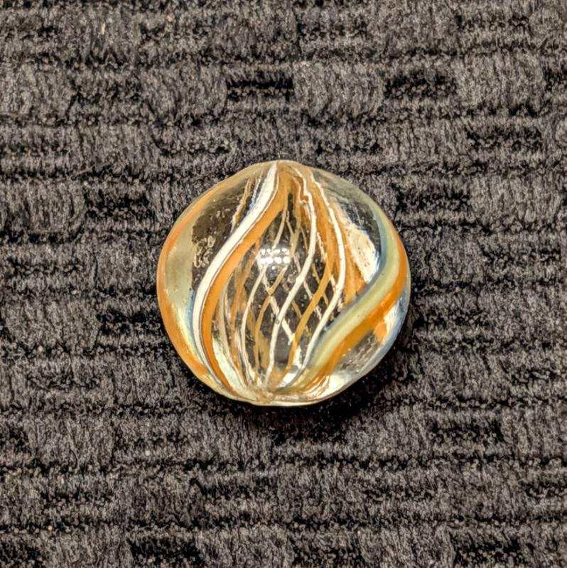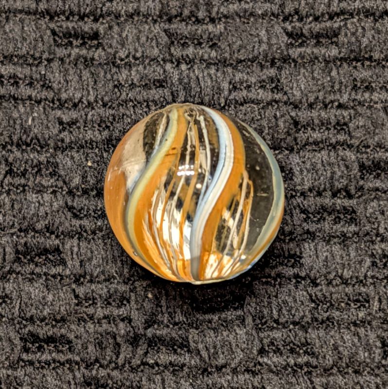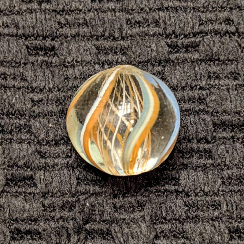 Rare Alternating Orange & White Latticino Core Swirl w/ 3 Tri-color Orange, White & Jelly Blue Ribbons. Two-Color Latticino Cores with Orange are harder to find than completely orange latticinos. Tiny as-made hot-spot from being touched while it was still cooling. Wet Mint- and original surface.