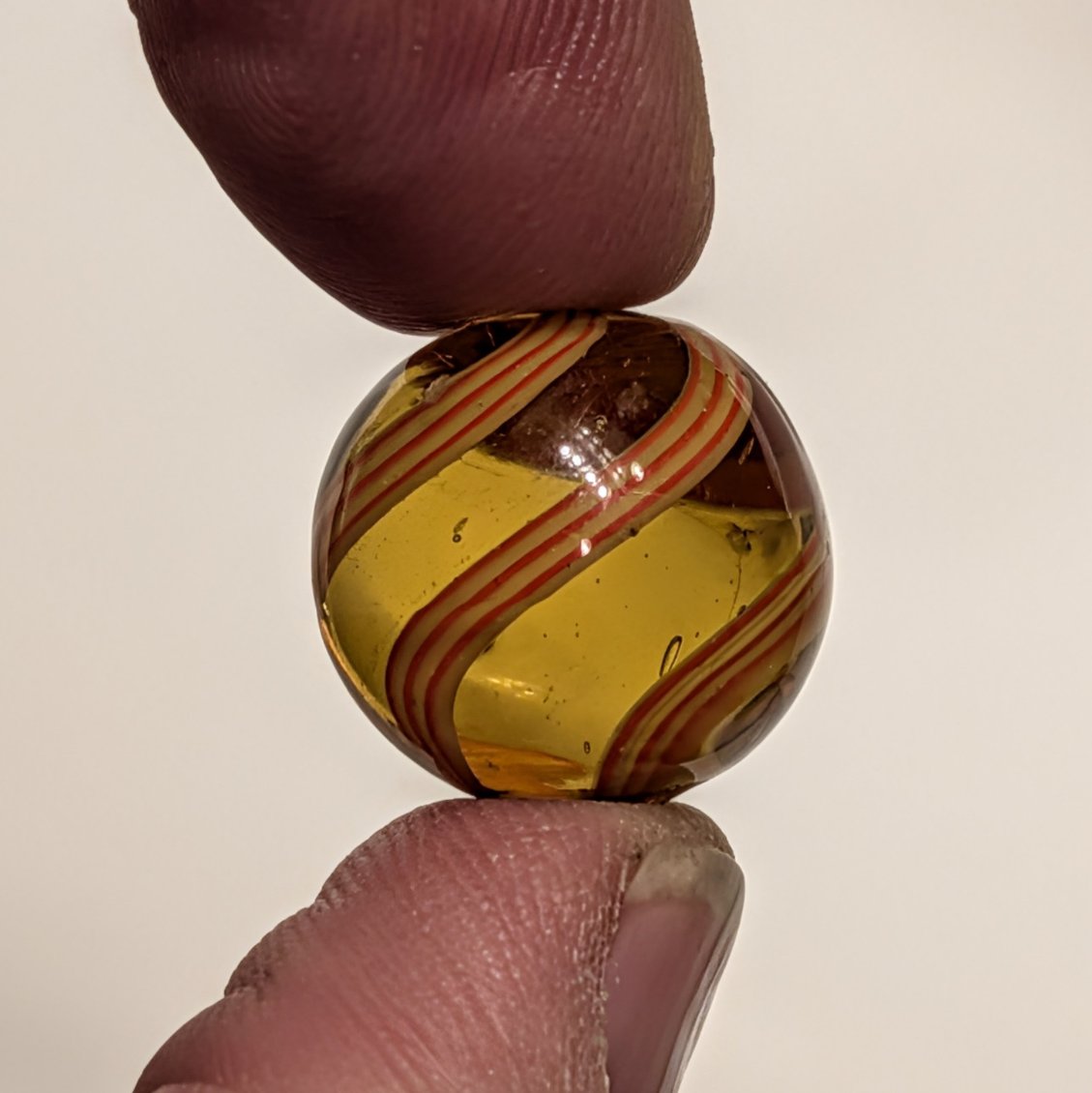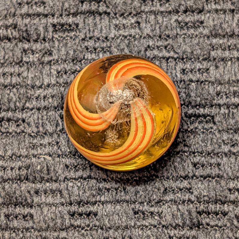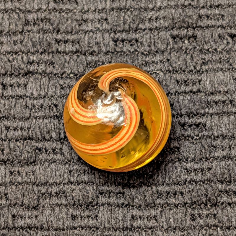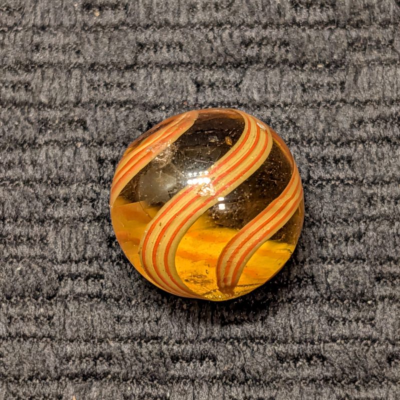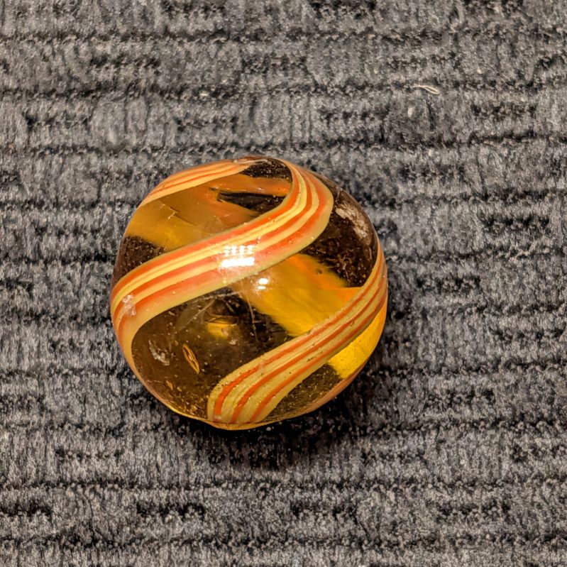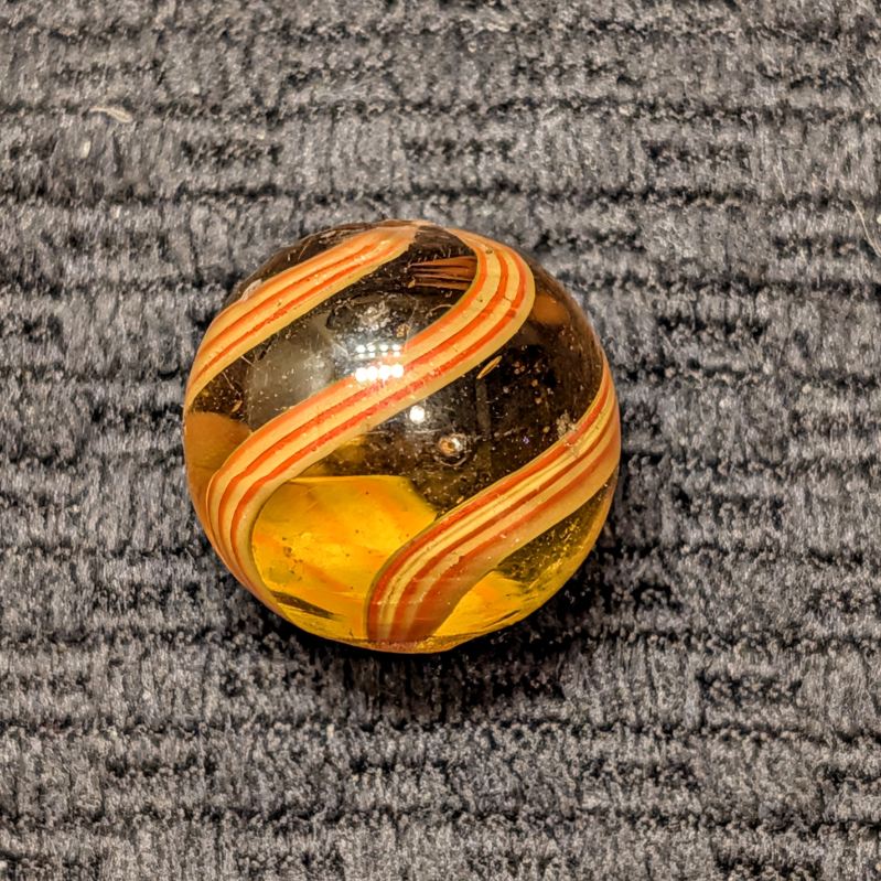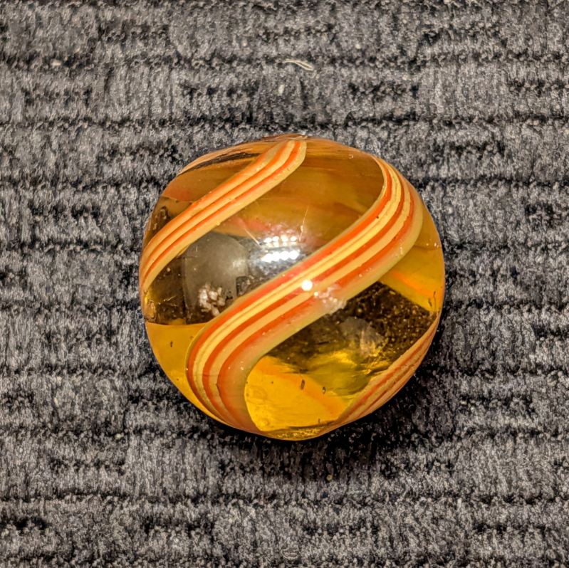 11/16″ Rare Amber Glass Coreless Swirl w/ 3 Wide Ribbons of 6 Stripes that alternate Yellow & Orange. Swirls in colored glass is incredibly uncommon, with colored glass being seen in coreless swirls more than the other types, but still HTF. A few small scattered hits.