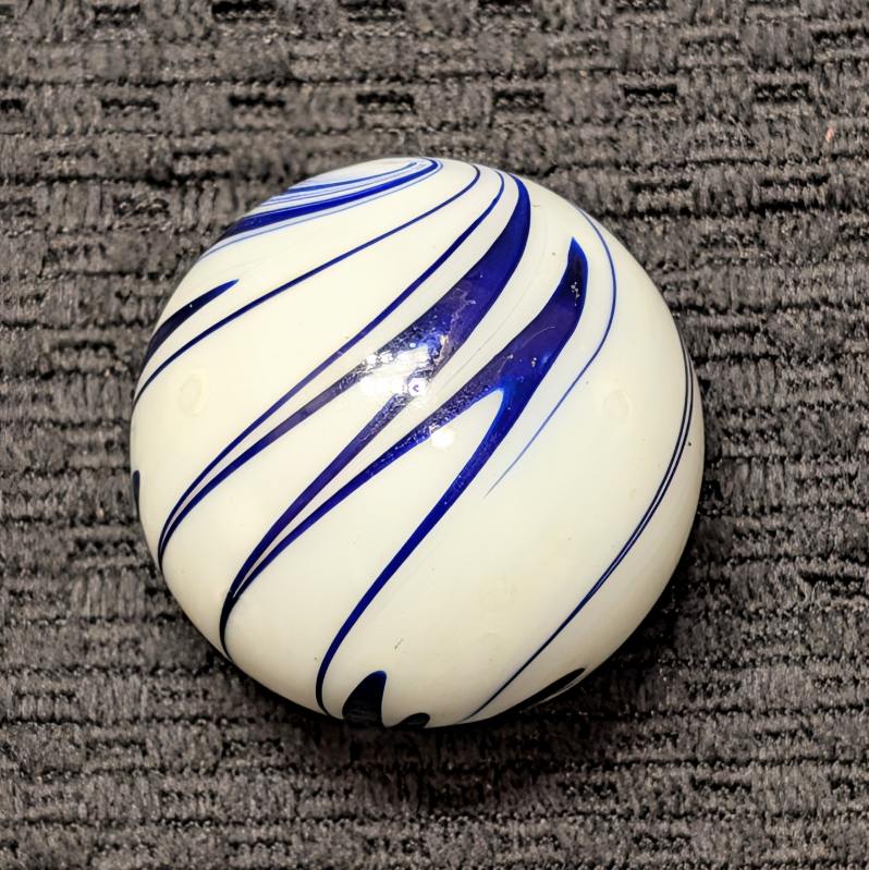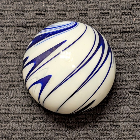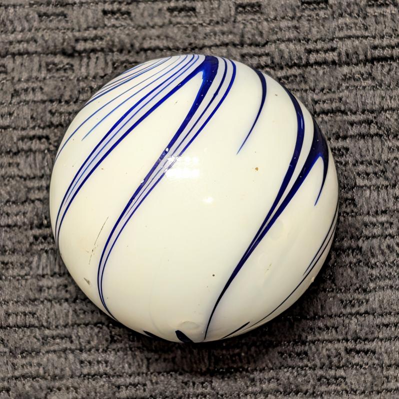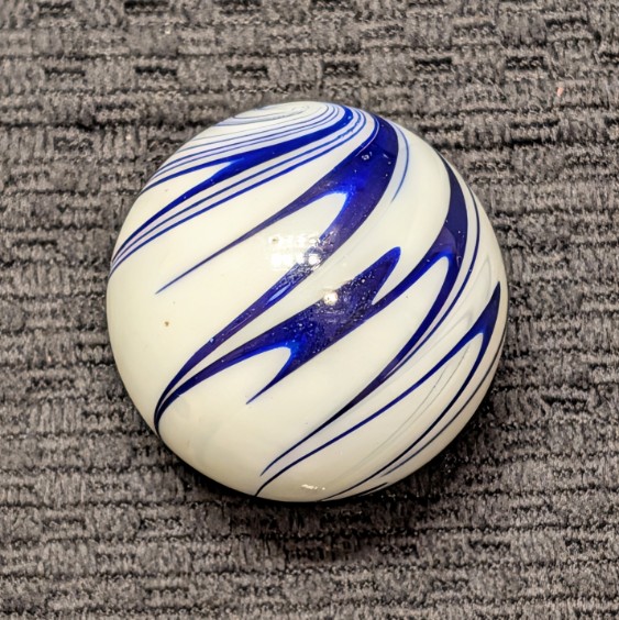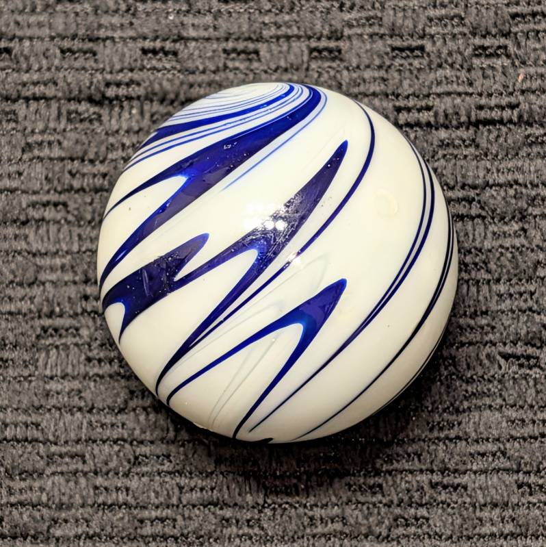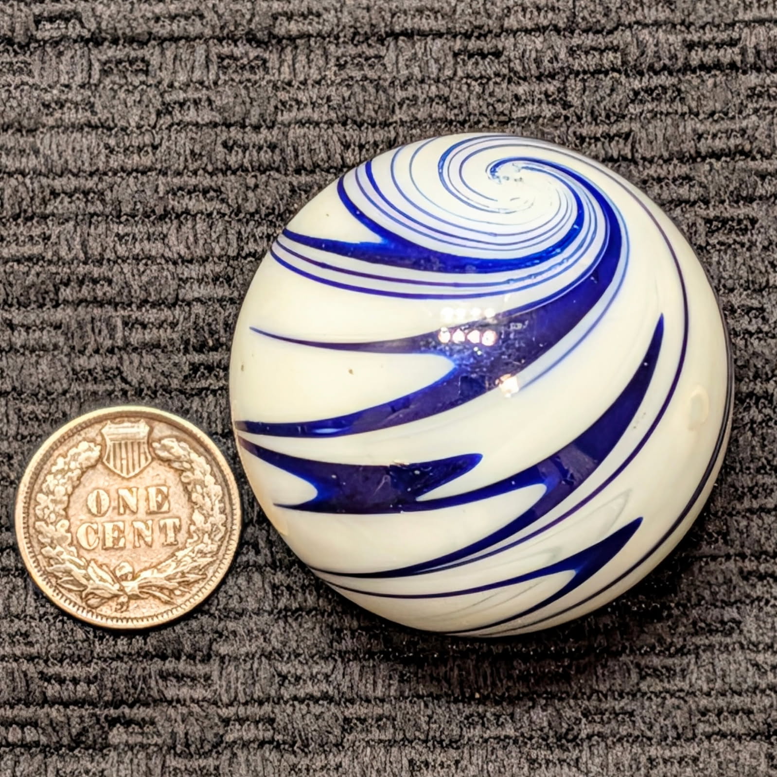 Rare Giant Chevron Banded Opaque measuring nearly 1-5/8″! One of the best chevron patterns you’ll ever see on a banded opaque. Cobalt Blue over white. A couple faint moons and a small hot spot touch mark near the pontil on an otherwise wet mint surface. Condition is Wet Mint -. Coin not included. From my personal collection.