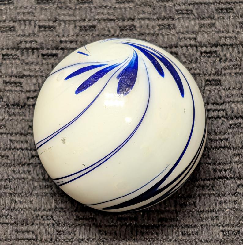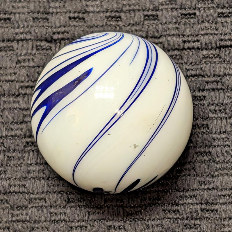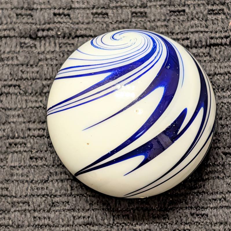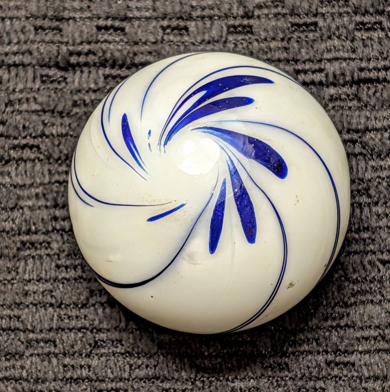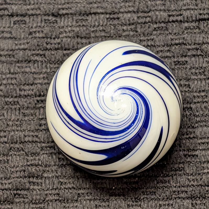 Rare Giant Chevron Banded Opaque measuring nearly 1-5/8″! One of the best chevron patterns you’ll ever see on a banded opaque. Cobalt Blue over white. A couple faint moons and a small hot spot touch mark near the pontil on an otherwise wet mint surface. Condition is Wet Mint -. Coin not included. From my personal collection.